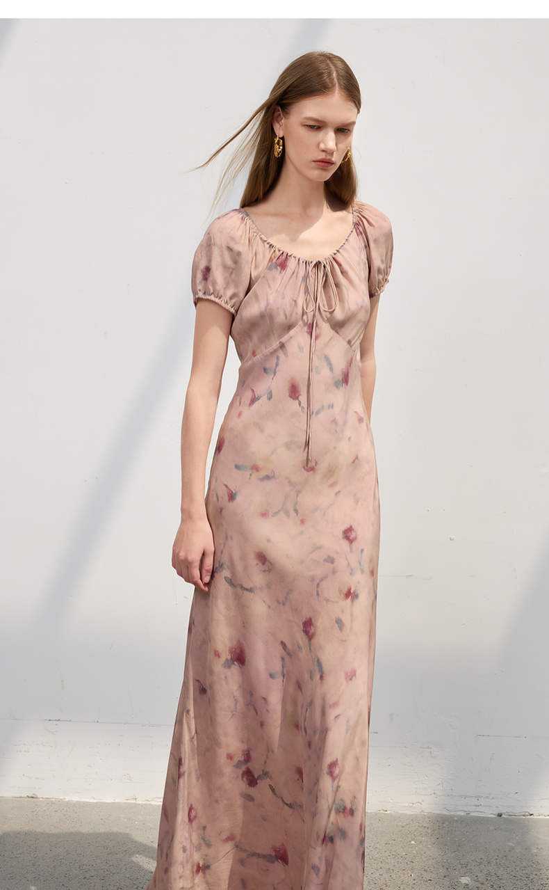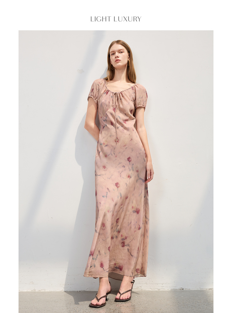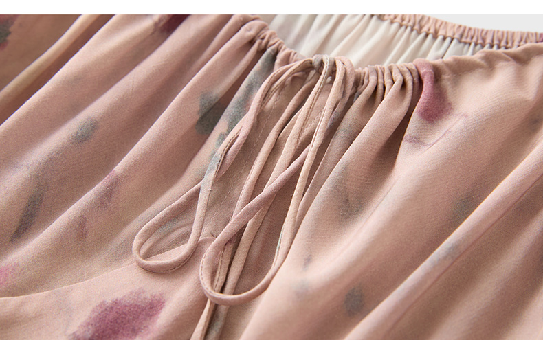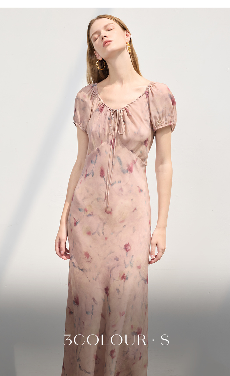 三彩2025夏季新款法式碎花裙抽绳收腰A字裙短袖连衣裙长裙S