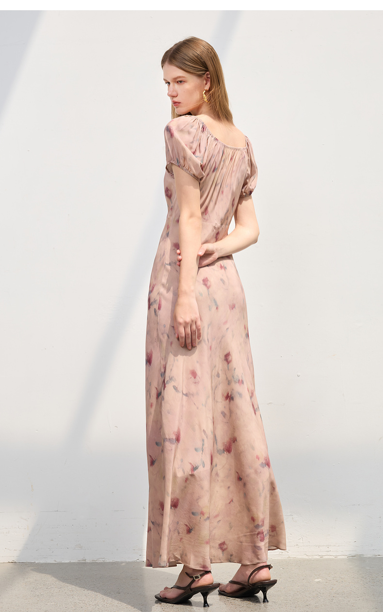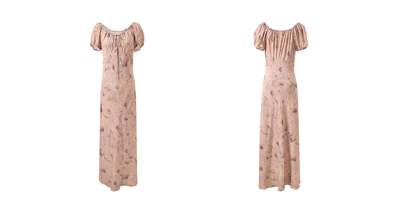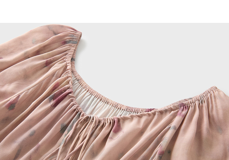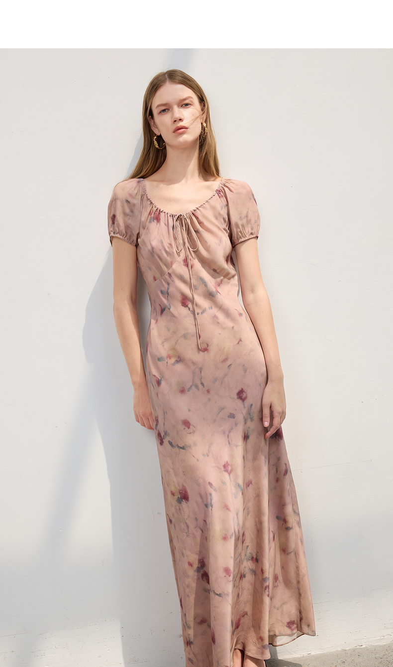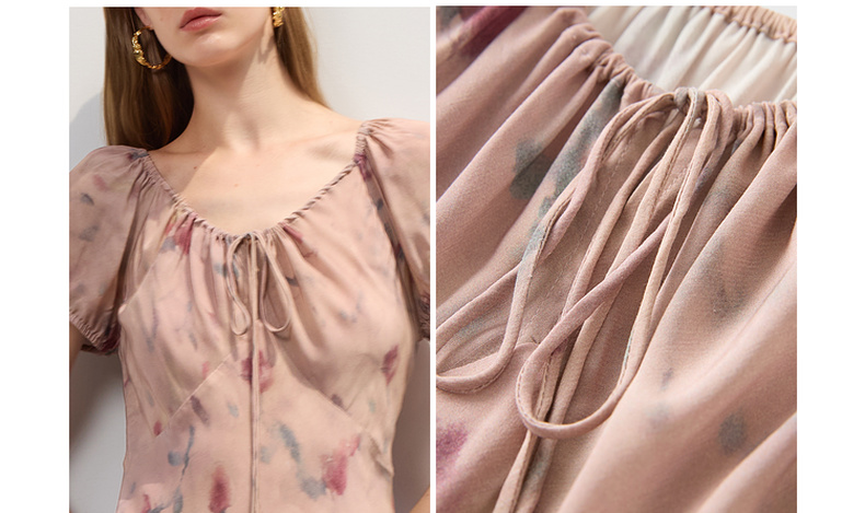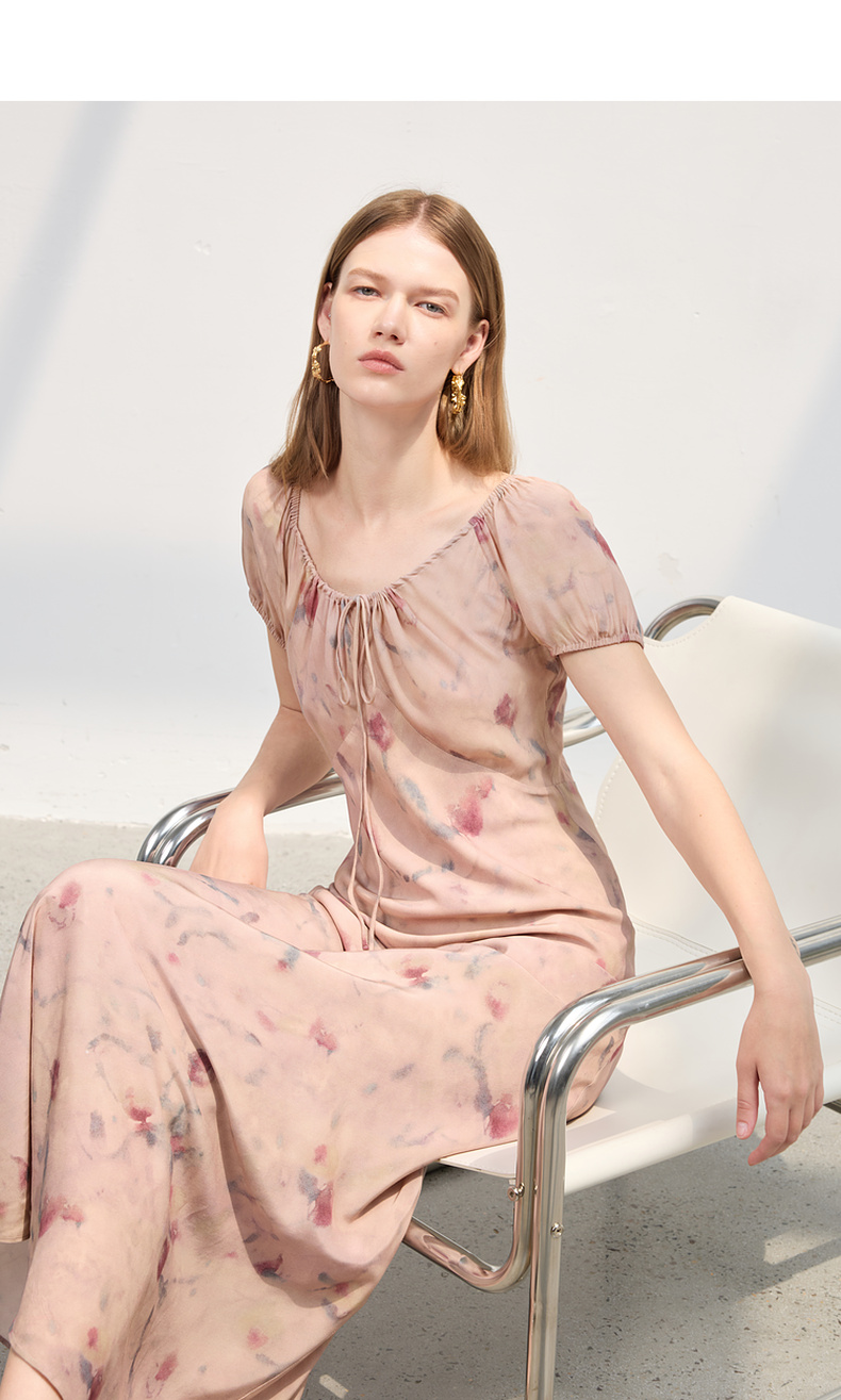 三彩2025夏季新款法式碎花裙抽绳收腰A字裙短袖连衣裙长裙S