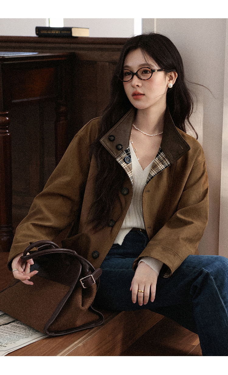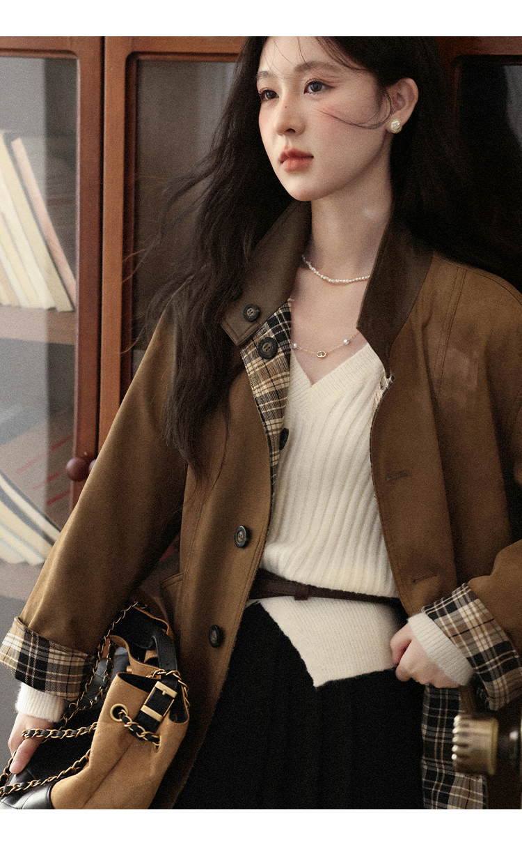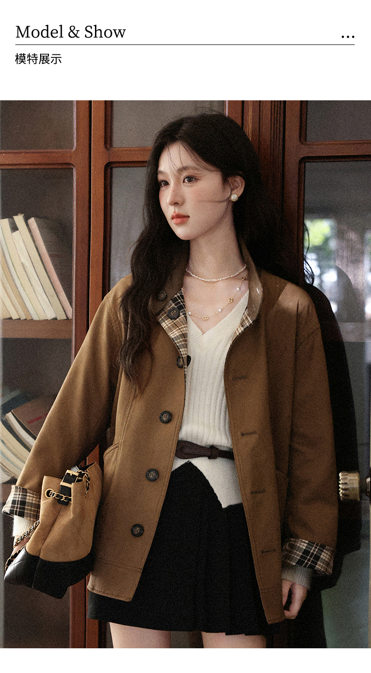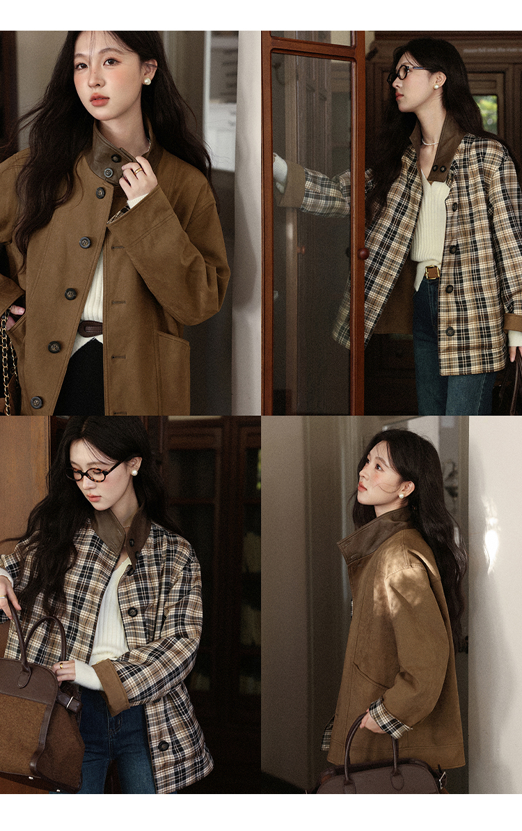 鹿向南「黛西星梦」设计感美拉德棕色格纹拼接立领外套上衣女秋季