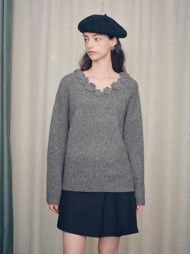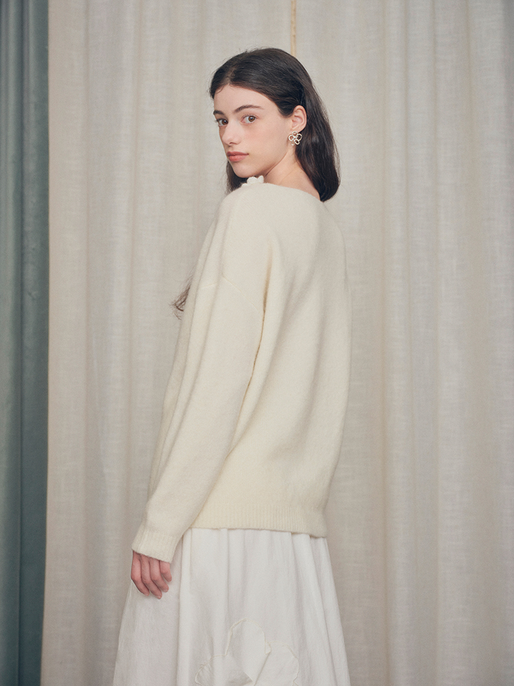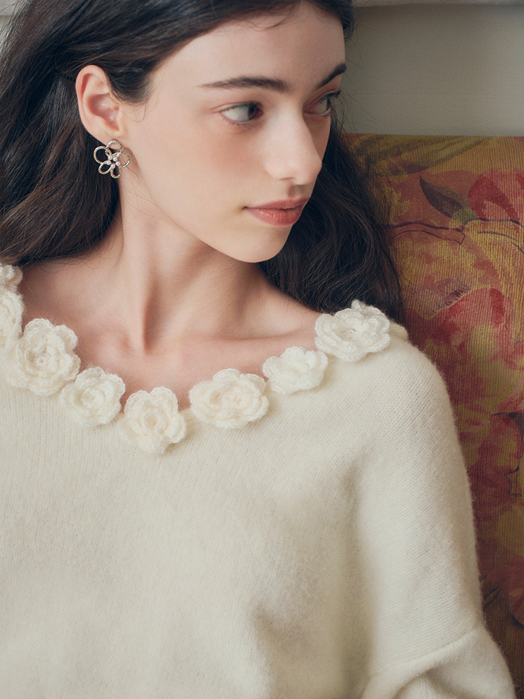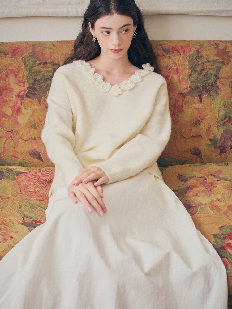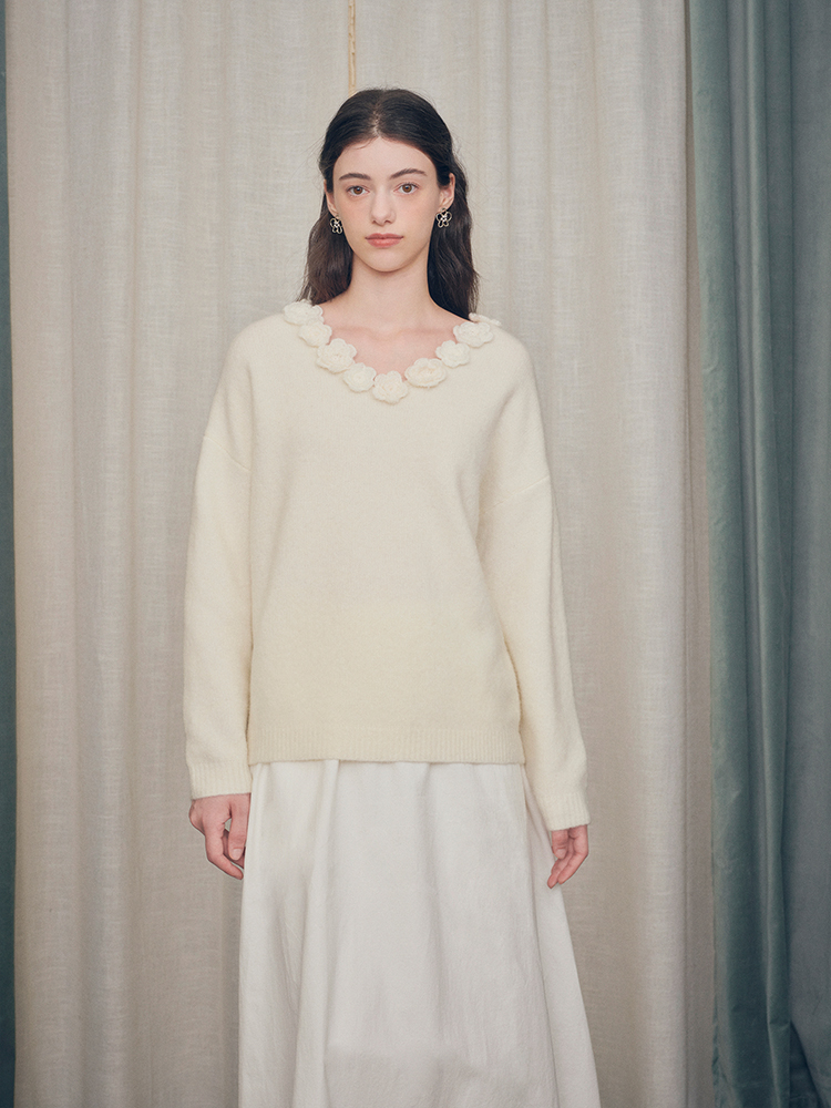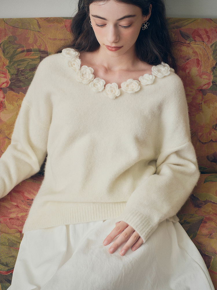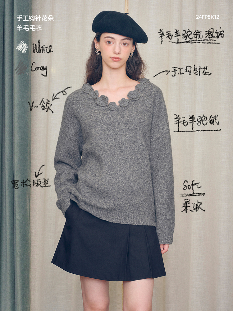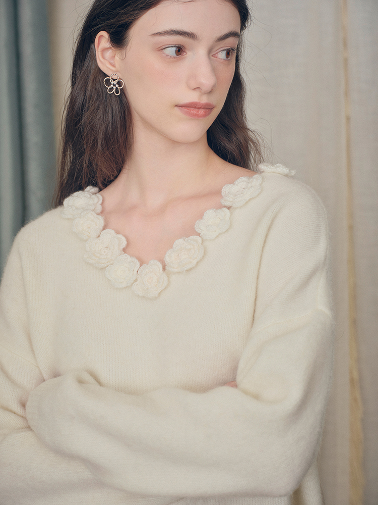 ForPoem 现货 24/FW原创设计手工钩针花朵V领驼马绒宽松毛衣
