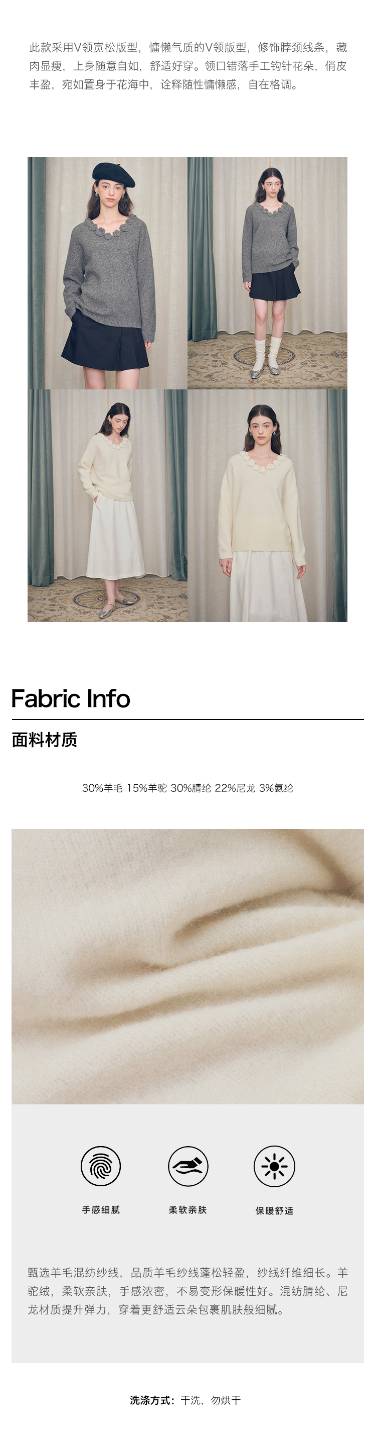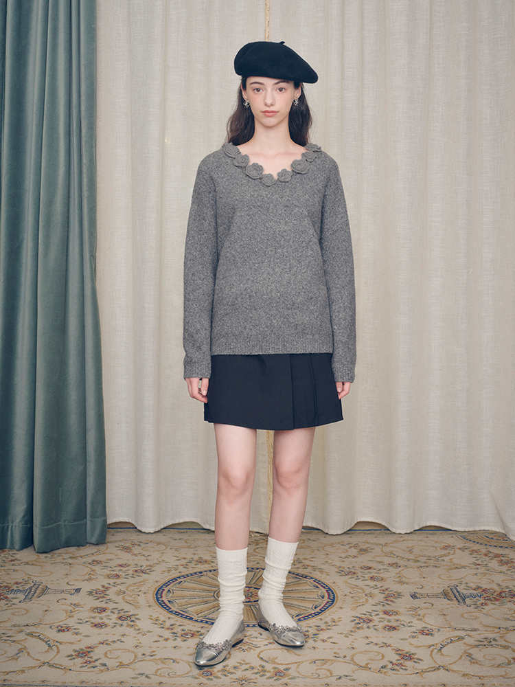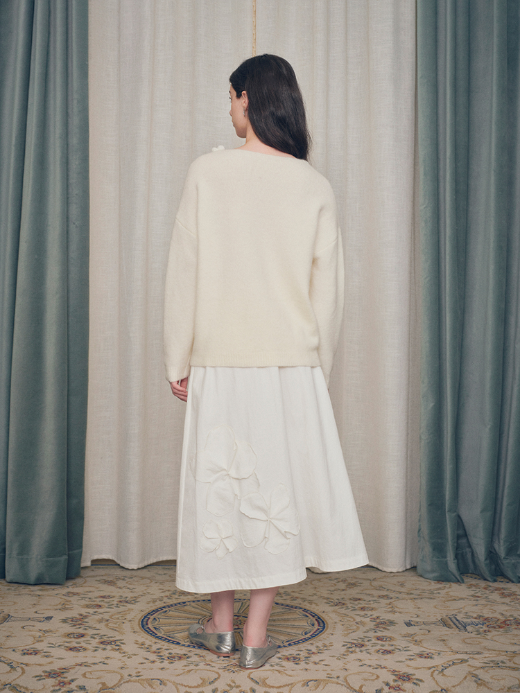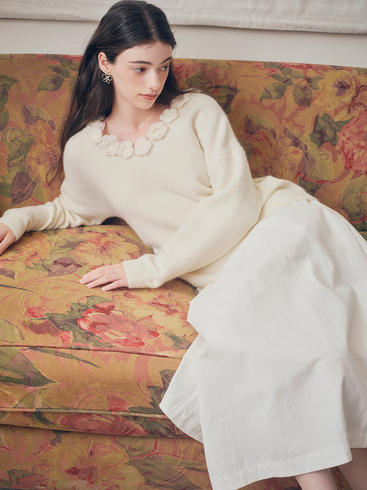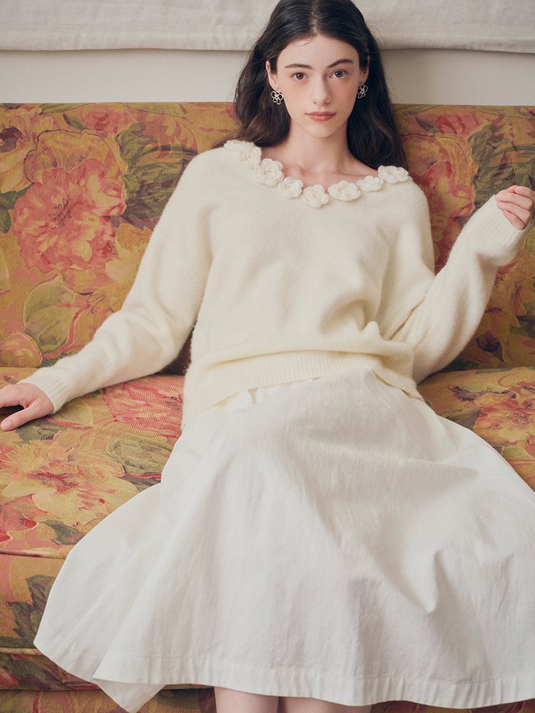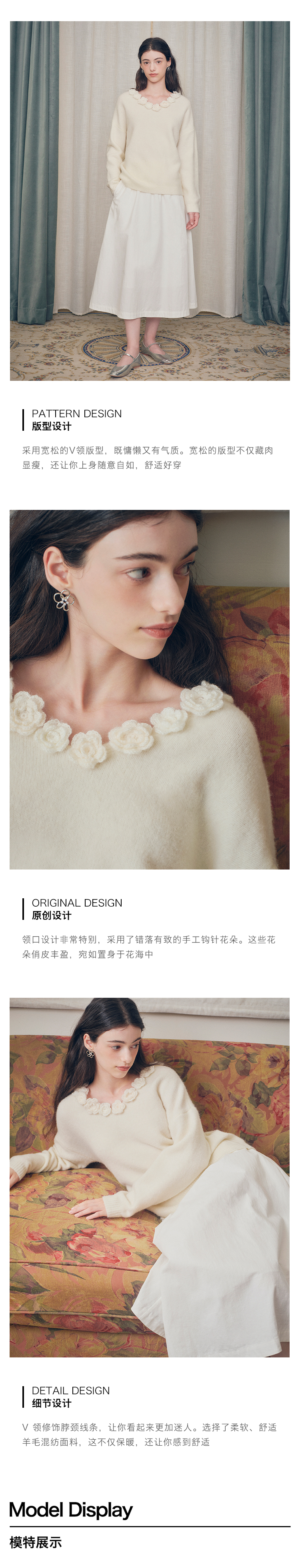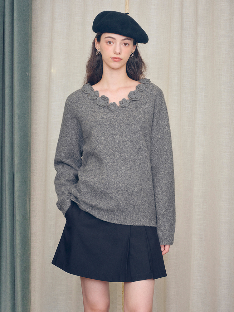 ForPoem 现货 24/FW原创设计手工钩针花朵V领驼马绒宽松毛衣
