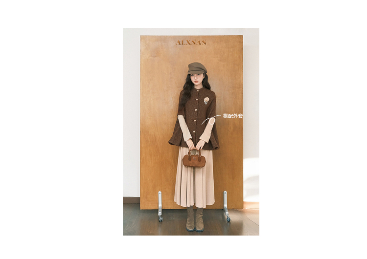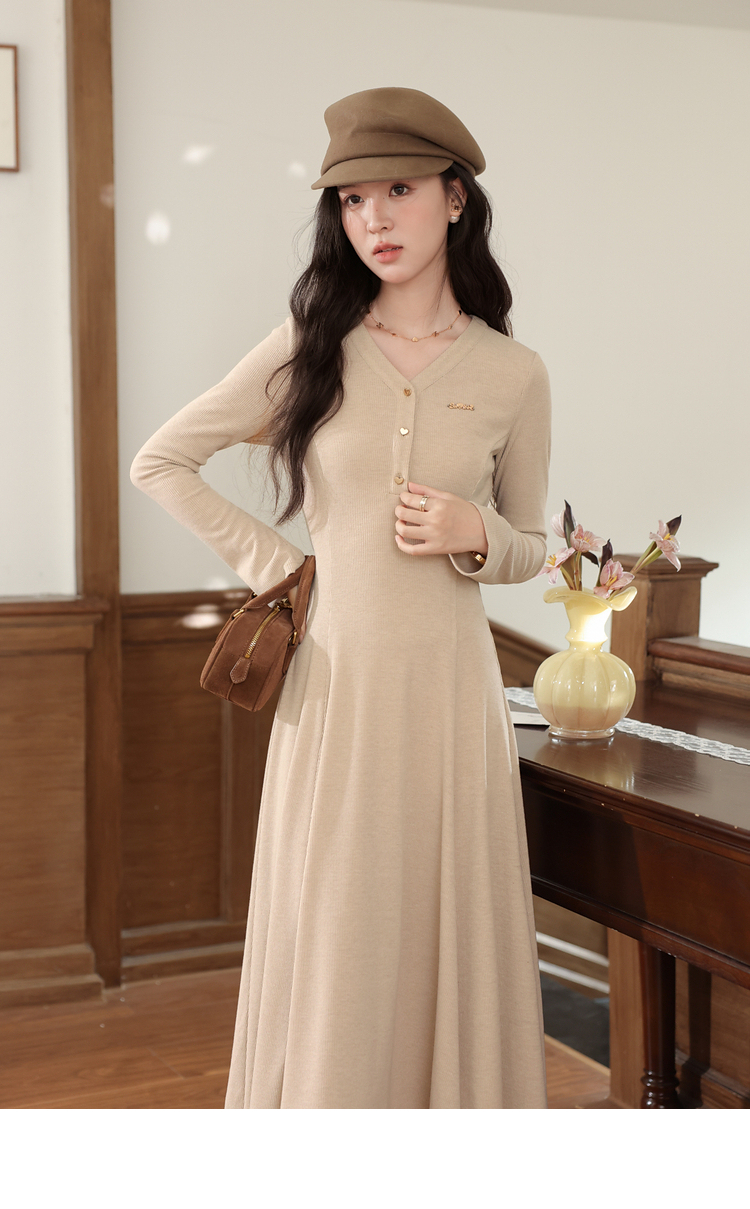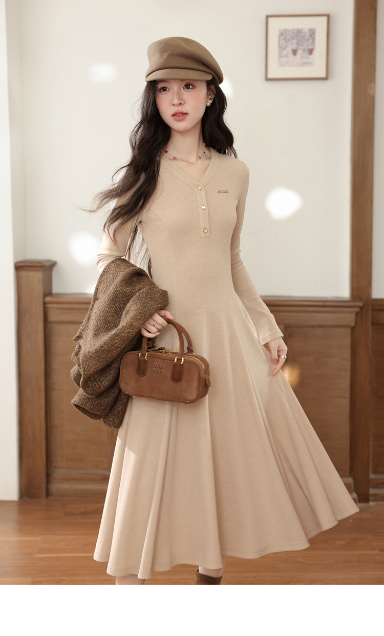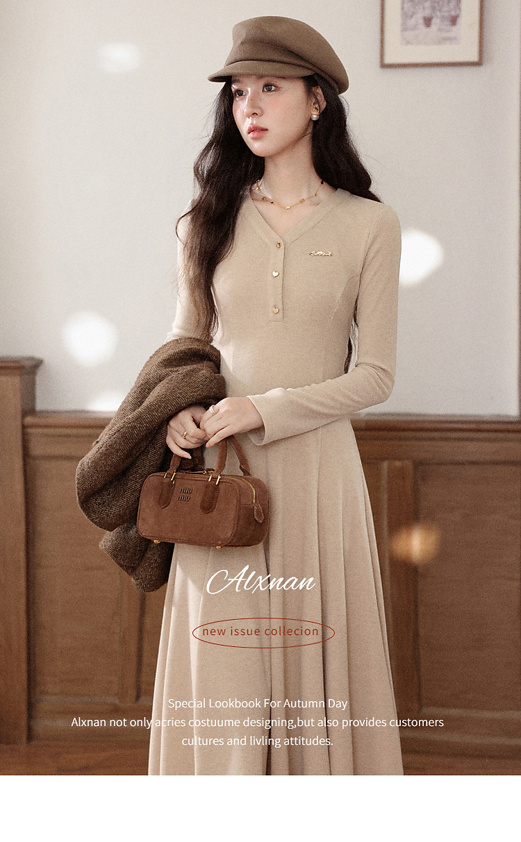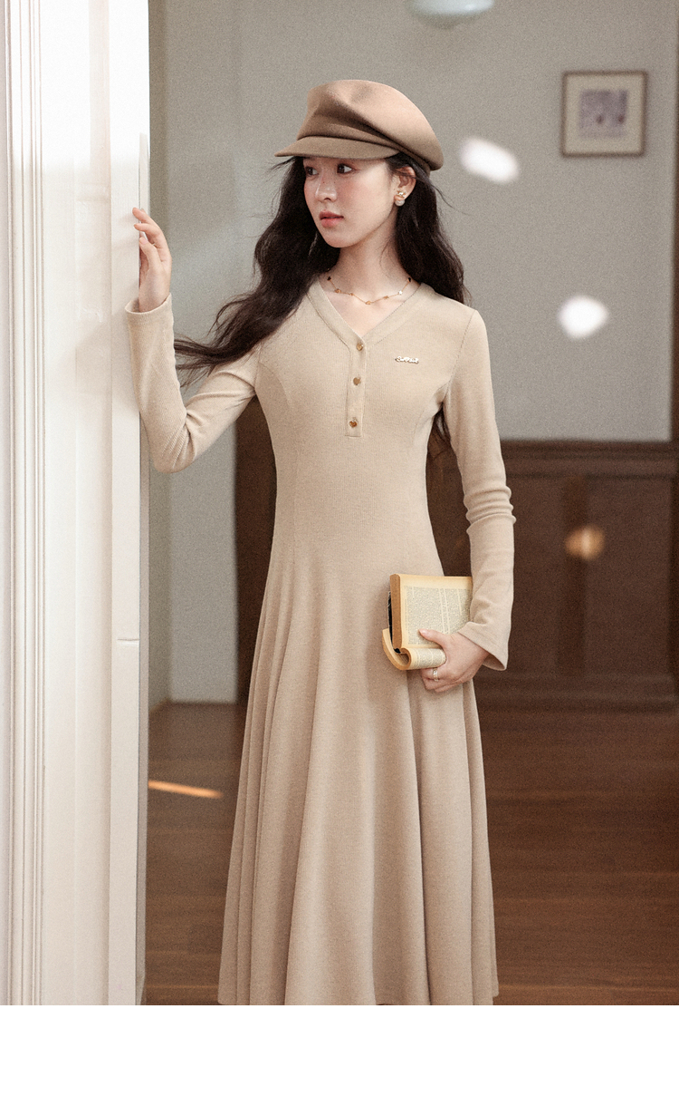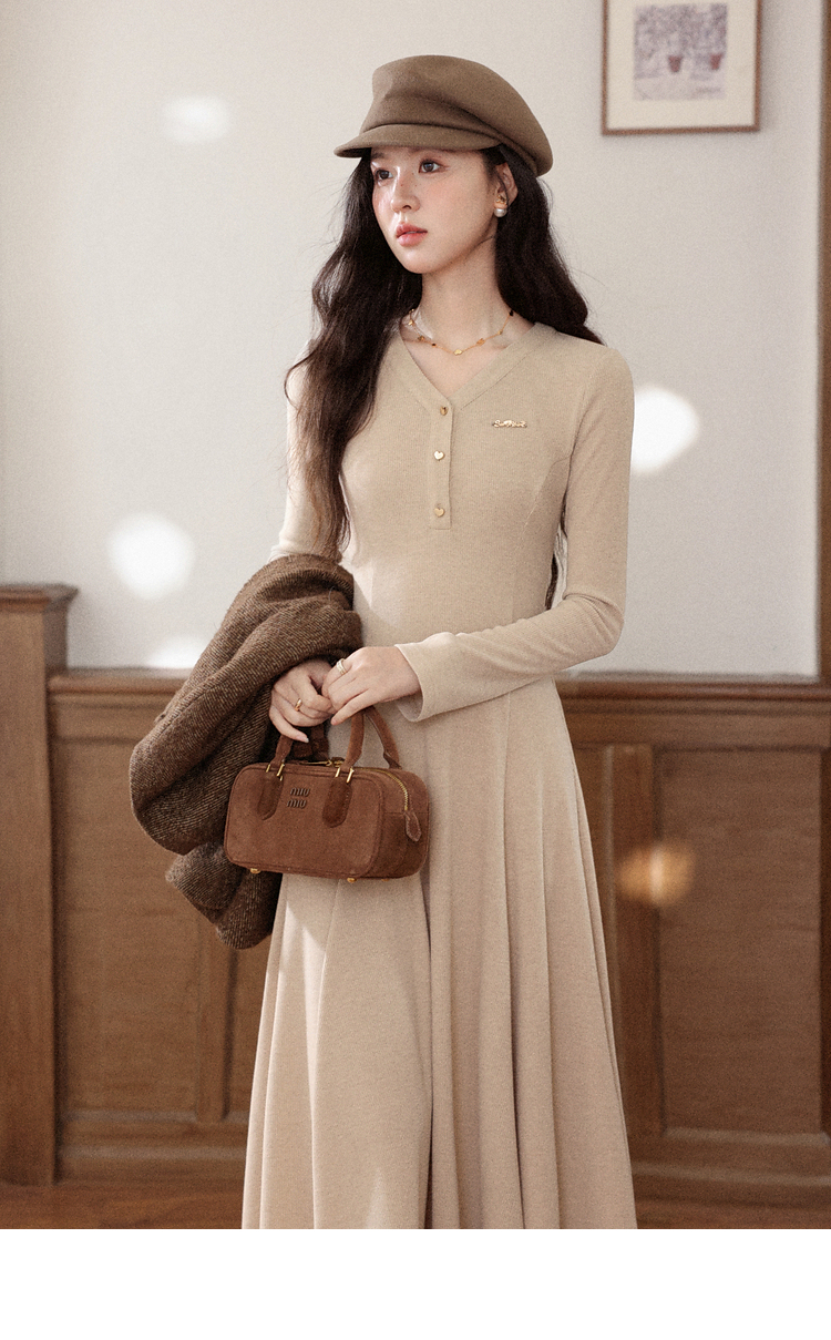 鹿向南「竹影若梦」燕麦色修身显瘦长袖连衣裙女秋新款A字打底裙