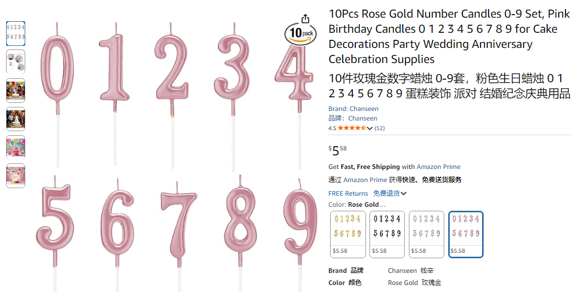 亚马逊 玫瑰金 高品质生日蜡烛 派对蛋糕装饰数字蜡烛
