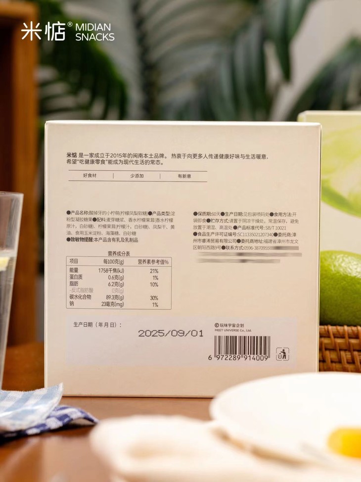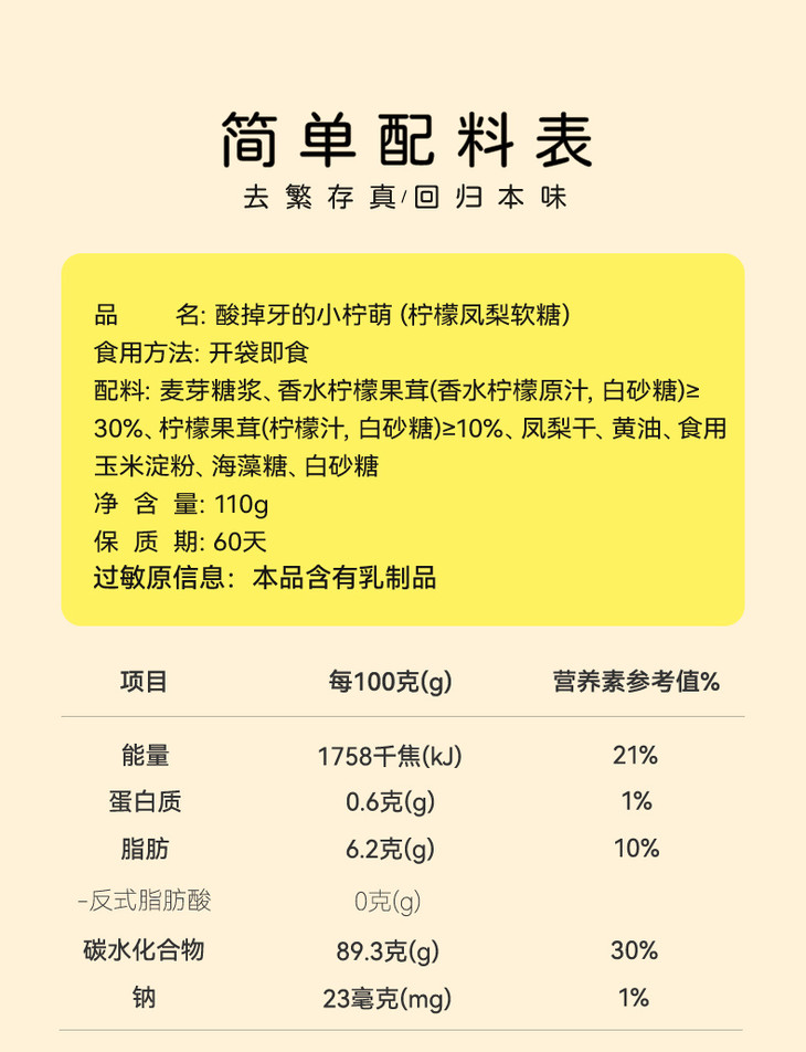 【品名】:酸掉牙的小柠萌 【规格】:110g 【保质期】:2个月 【生产日期】:就近日期发出,滚动更新 【配料表】:麦芽糖浆、香水柠檬果茸(香水柠檬原汁,白砂糖)、柠檬果茸(柠檬汁,白砂糖)、凤梨干、黄油、食用玉米淀粉、海藻糖、白砂糖 【致敏物提醒】: 本品含有坚果、乳制品 【储存方式】:请置于阴凉干燥处,避免阳光直射及高温潮湿,拆封后请尽快食用 【发货地】:福建漳州 【发货时效】:72小时内发出 【发货快递】:中通、申通随机发不指定 【补运费地区】:北京,上海➕一元,甘肃、内蒙古、宁夏运费三件内➕14元,青海、新疆、西藏运费三件内➕16元。 【致敏物提醒】:含有乳制品 【售后说明】: 【售后】 1、食品无质量问题不支持 7 天无理由退换。 2、产品少发、漏发,质量问题,请提供产品连同快递单(需看见单号)一起拍照24 小时内发给客服核实处理。 3、如包裹破损、挤压严重请(拍照外箱图片)拒绝签收,签单破损签收,请在签收48小时内拍照联系客服处理。 4、产品已经发出的情况下,不建议更改地址、不退货,下单前,请仔细核对信息!货物产生物流单号,无法拦截,如需拦截、改地址须支付快递费用。 5、订单产生单号后,拦截需收费4元,改地址3元,偏远六省(新疆、西藏、内蒙古、宁夏、青海、甘肃)按实际产生运费收取。 【拦截收费】因返单后撤单会产生来回运费,拦截费按照大部分地区收取4元,改地址费用按照大部分地区收取3元,客户个人原因拒签收取退运费4元,北京、上海加收1元,偏远六省按实际发出运费取