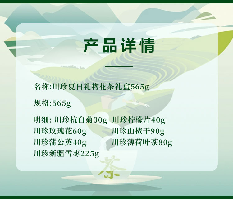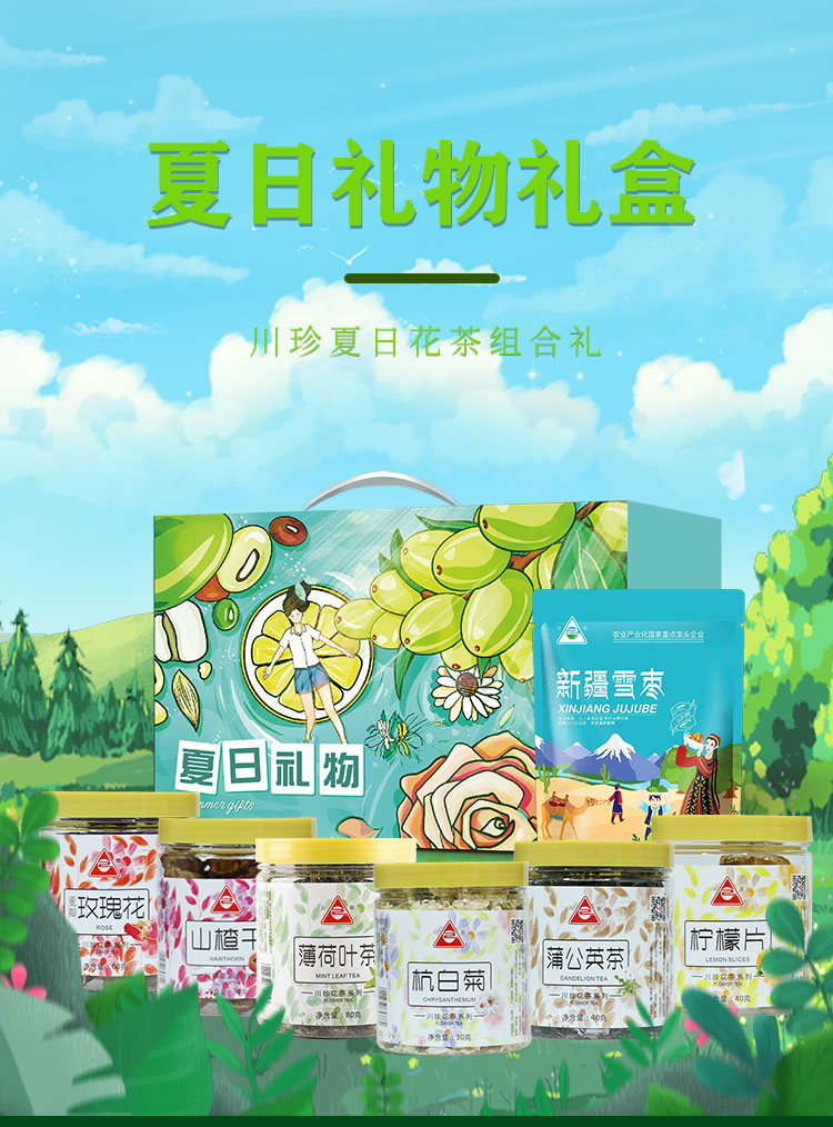 【川珍】夏日礼物花茶礼盒565g(杭白菊30g、柠檬片40g、玫瑰花60g、山楂干90g、蒲公英40g、薄荷叶茶80g、新疆雪枣225g)
