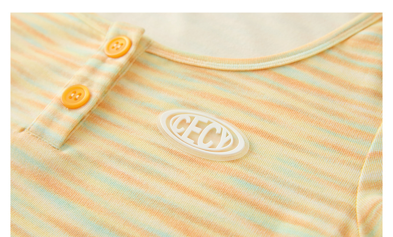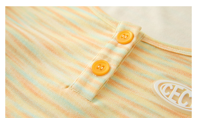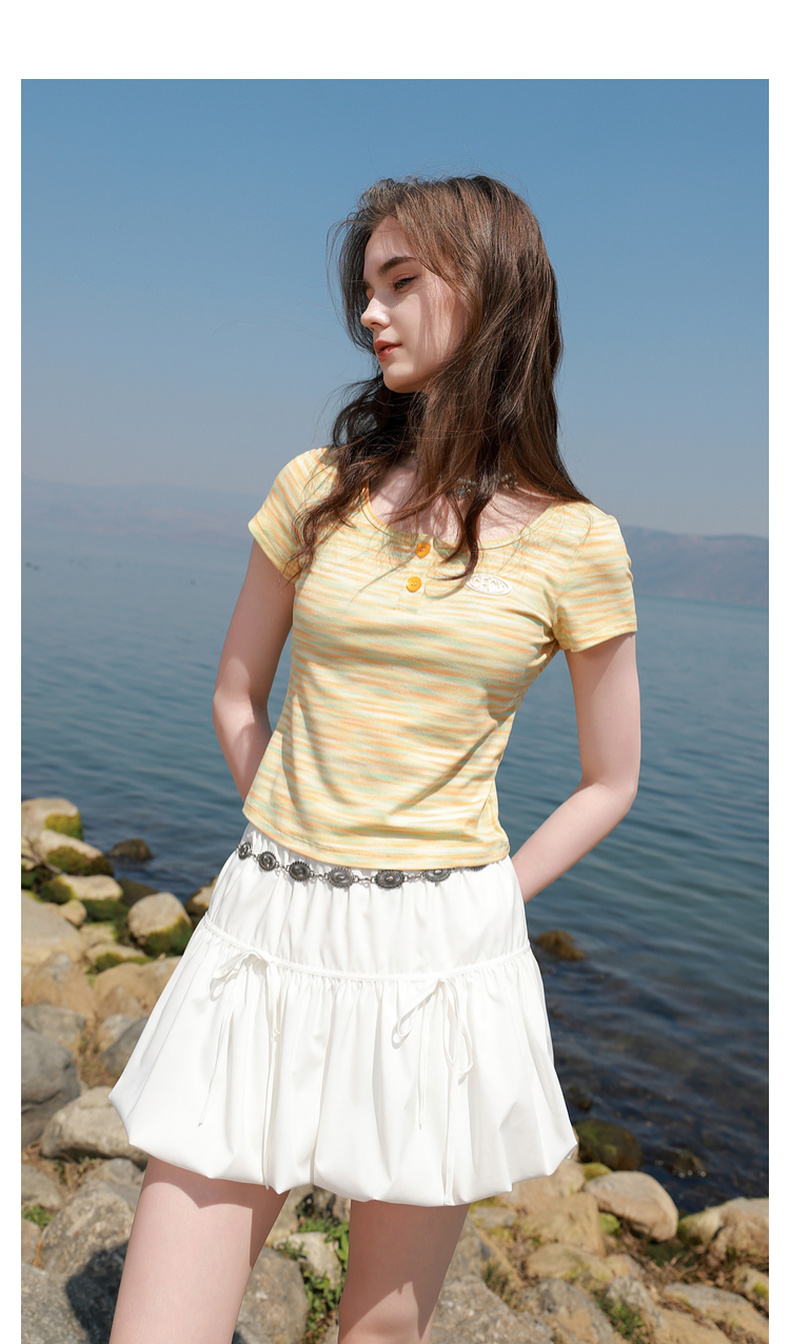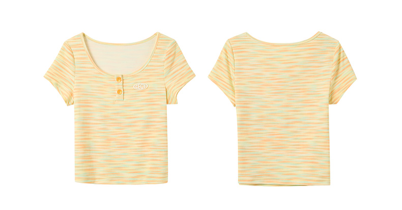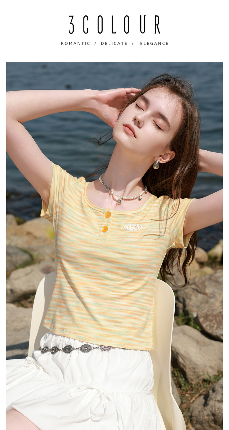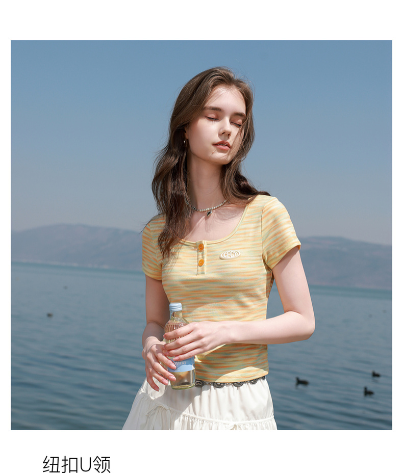 三彩独醒2025夏季新款多巴胺条纹T恤U领正肩短袖上衣修身短款F