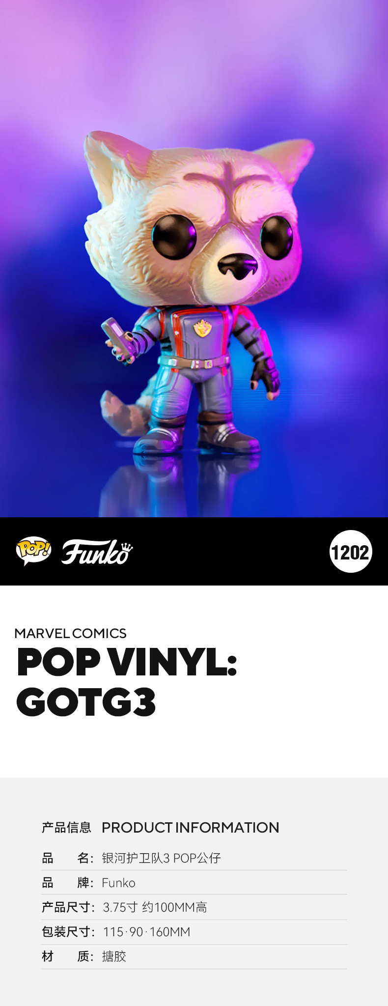 Funko POP! 漫威电影银河护卫队3 Rocket火箭浣熊手办公仔玩偶摆件 67509