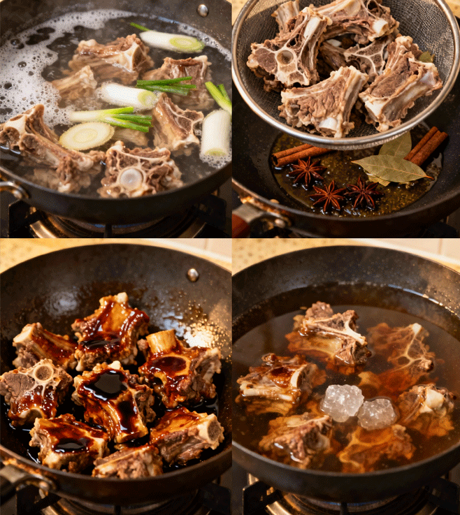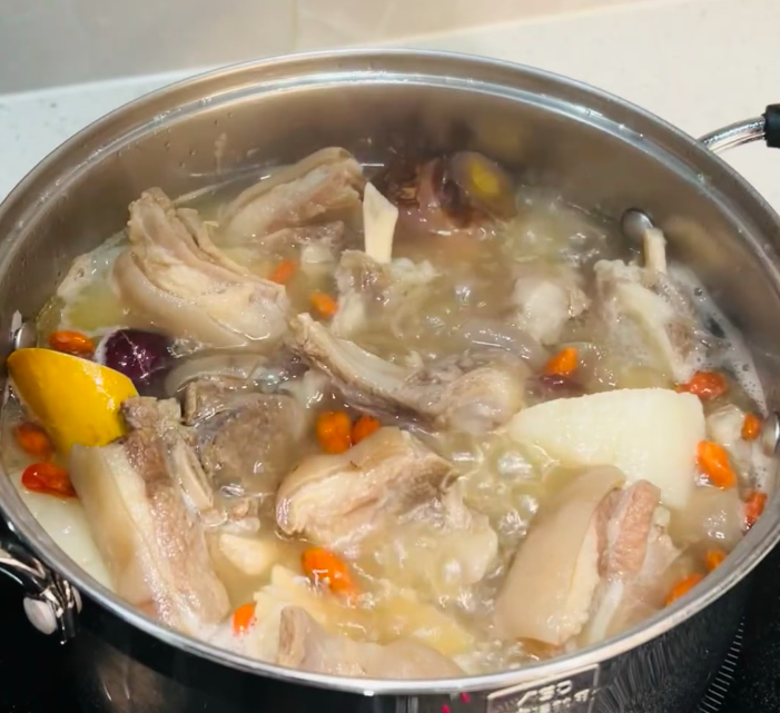 4. 加入清水没过羊蝎子,放入冰糖、料酒,大火烧开后转小火慢炖约1.5-2小时,加盐调味即可
