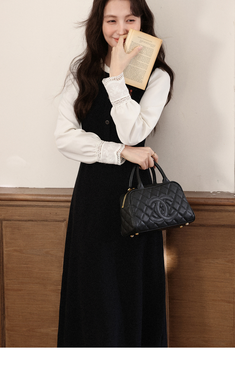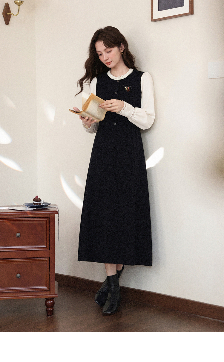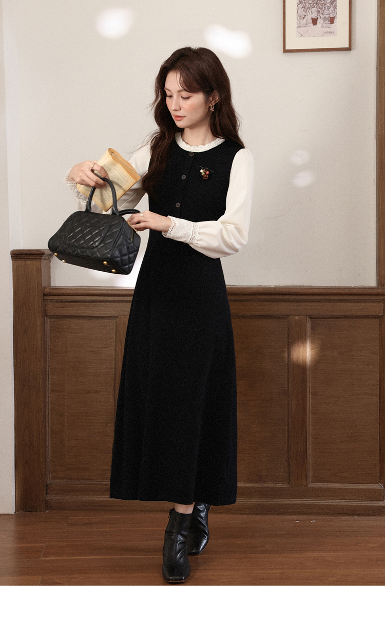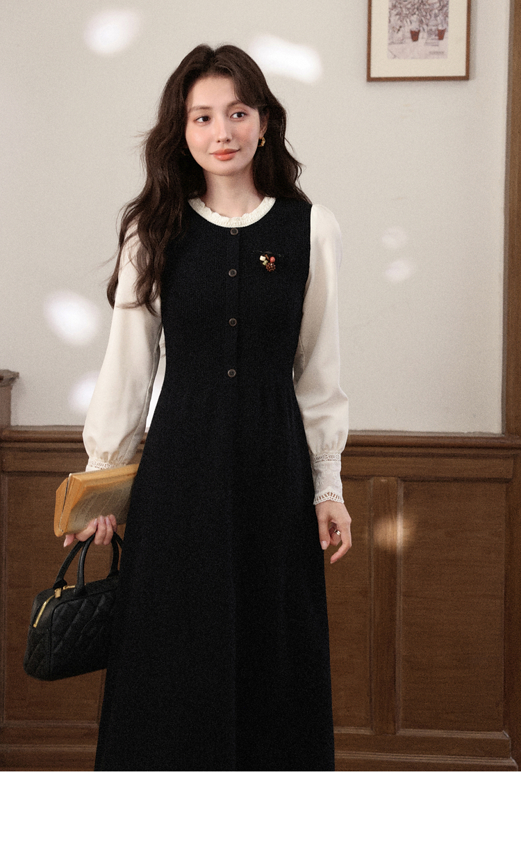 鹿向南「浪漫绮想」黑色假两件毛织长袖连衣裙秋冬款中长款裙子女