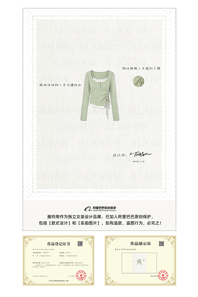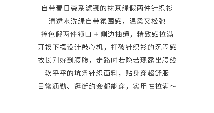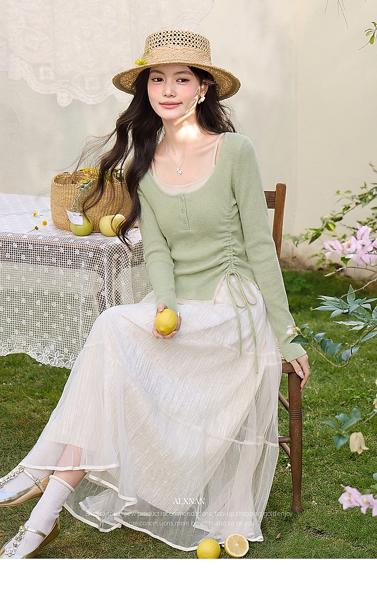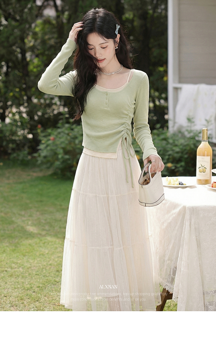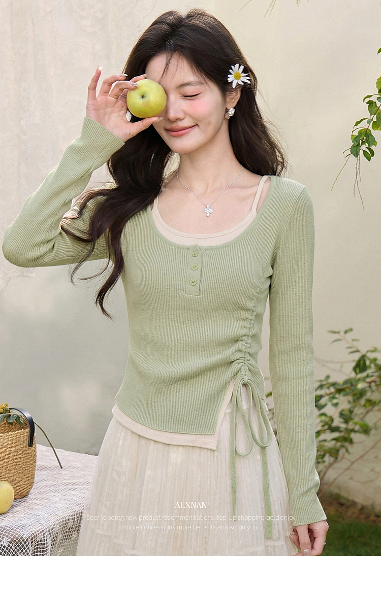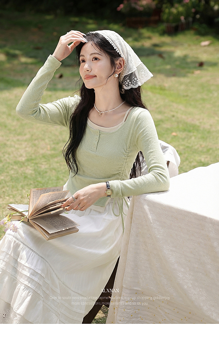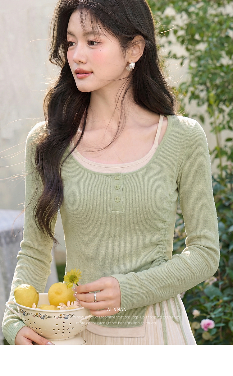 鹿向南「绿野信笺」假两件绿色长袖t恤女春季巨好看修身打底上衣
