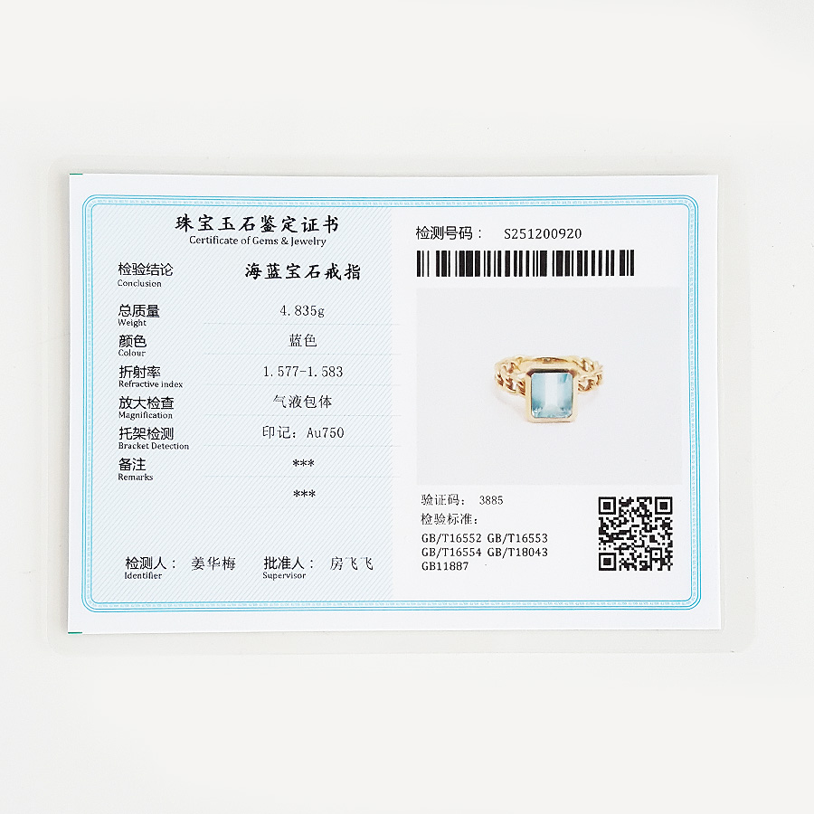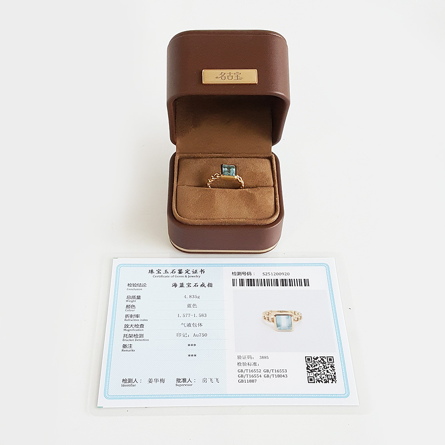 名称 | AU750黄金镶天然蓝色5A级2.593克拉海蓝宝石戒指 |