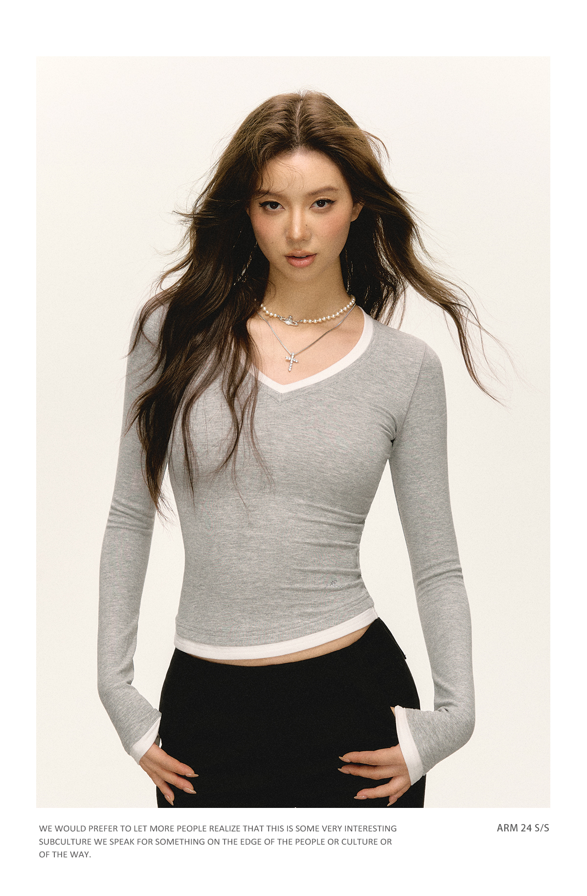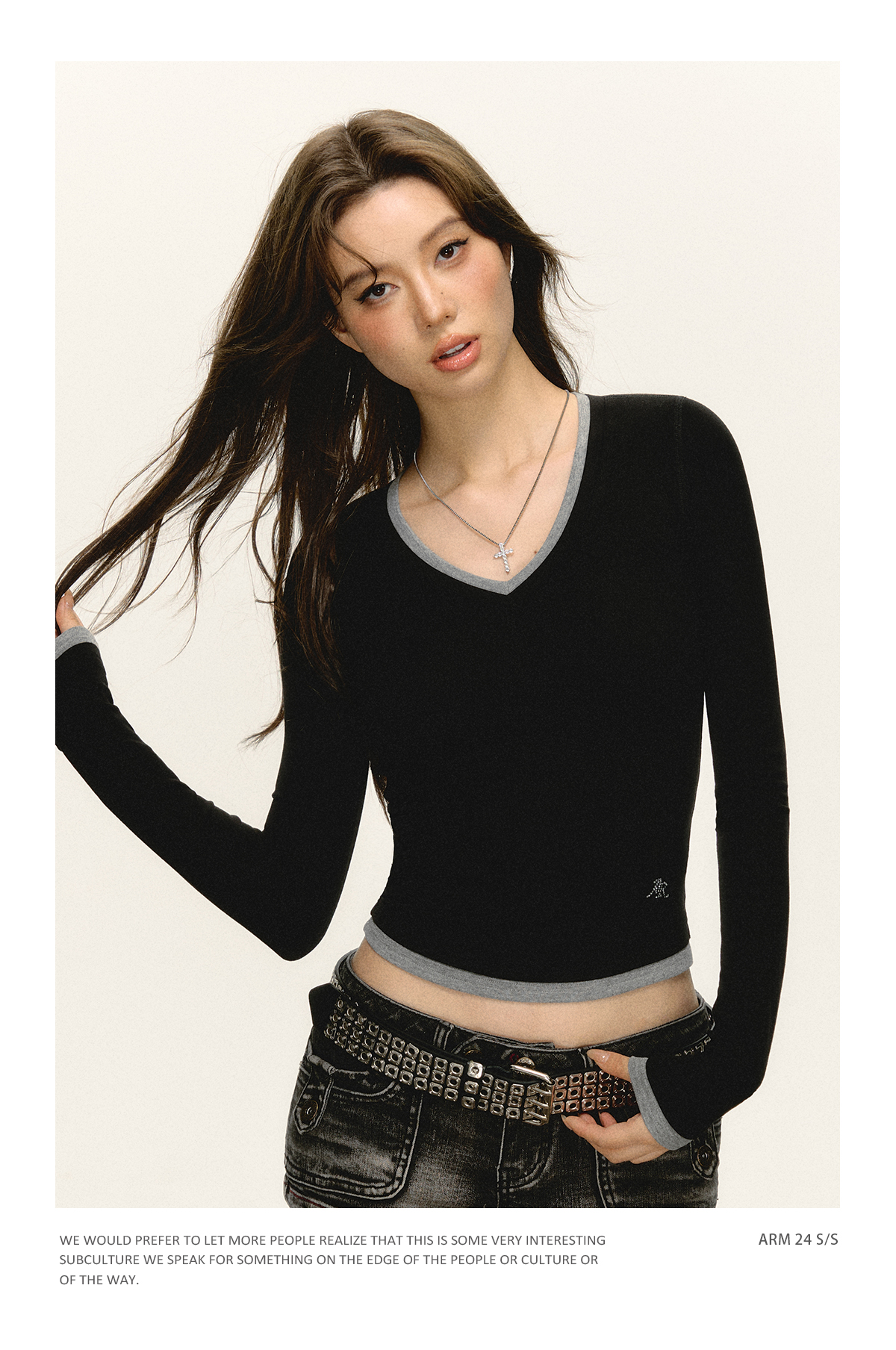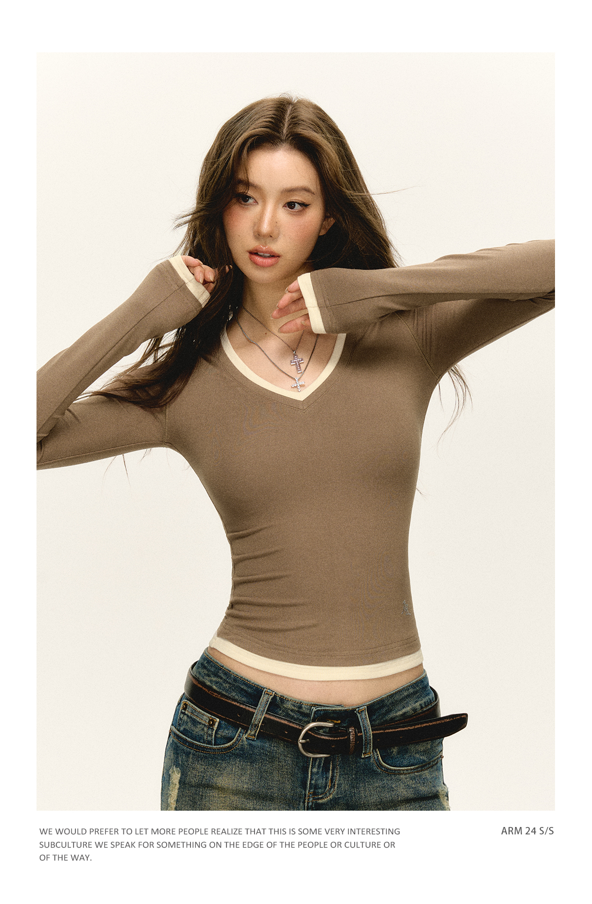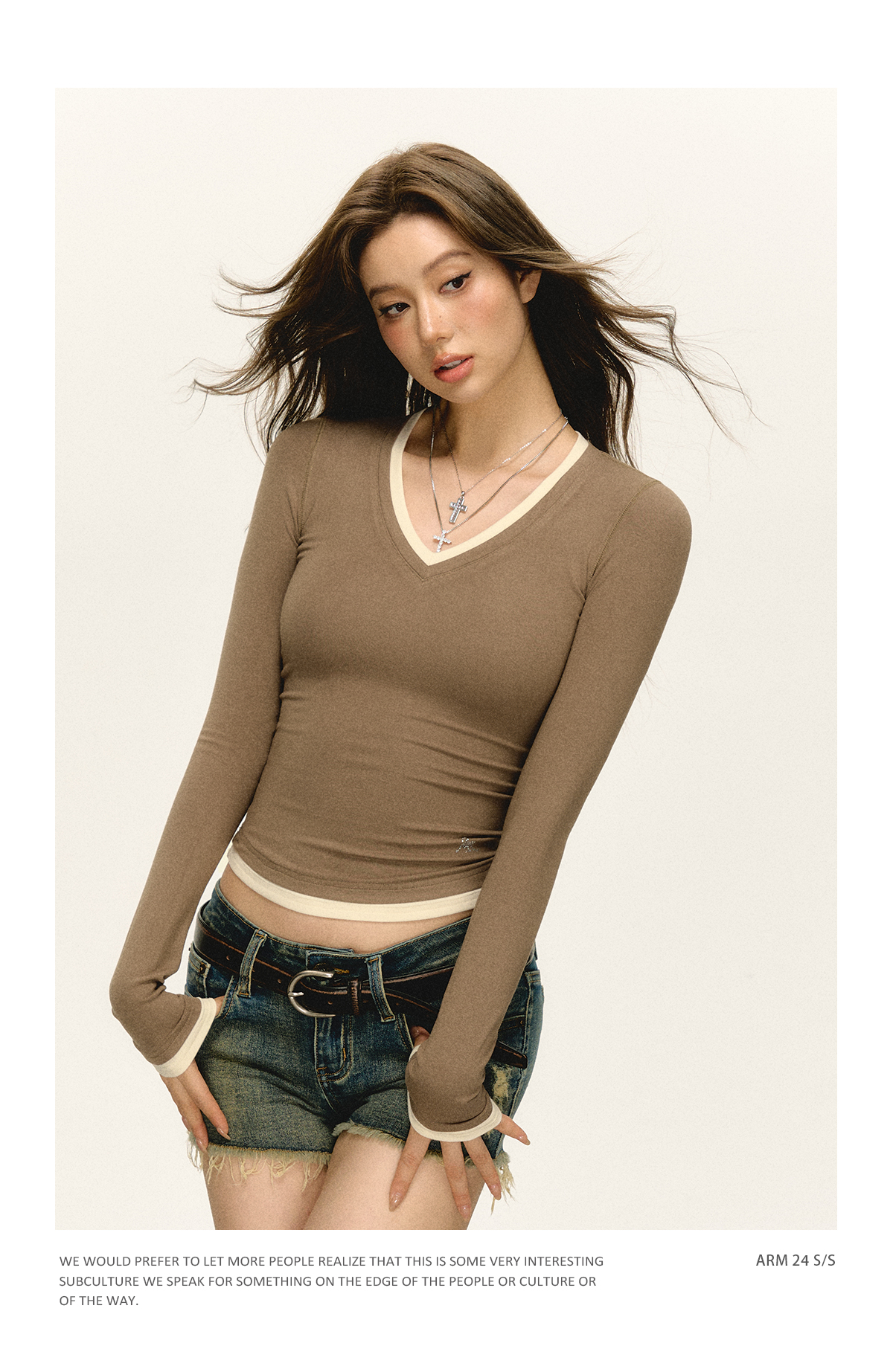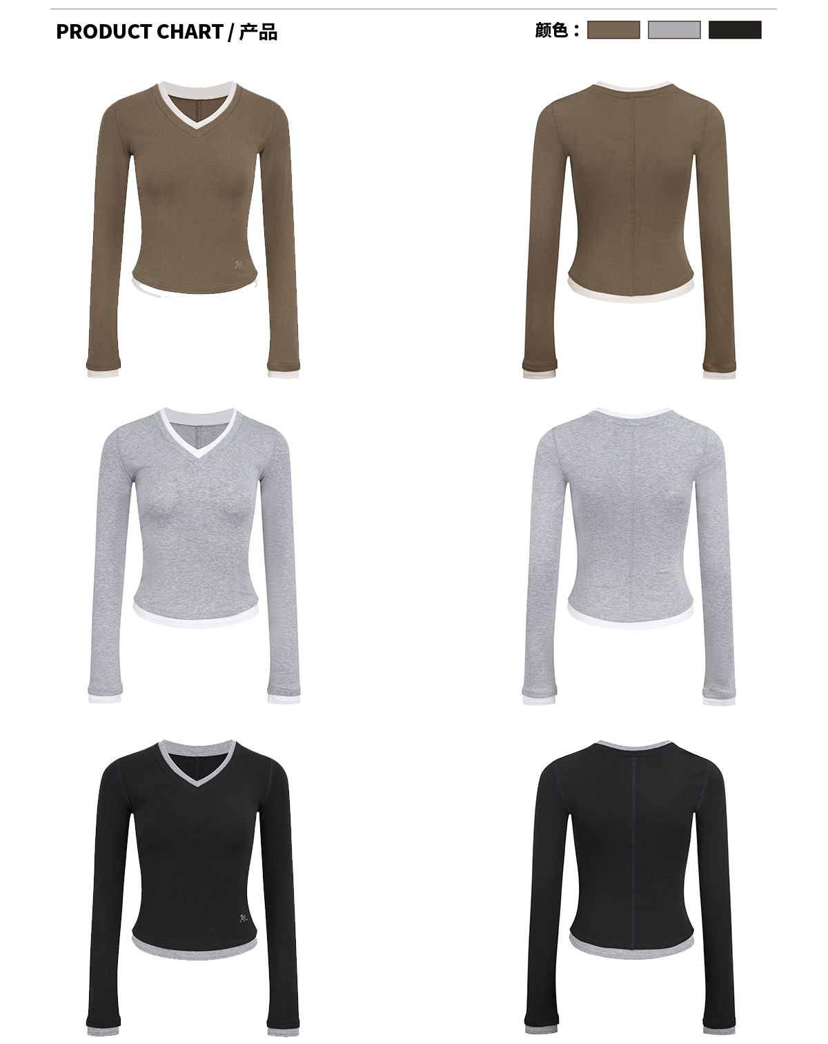 Ariseism 美式复古撞色V领长袖t恤女2025春秋新款修身打底上衣