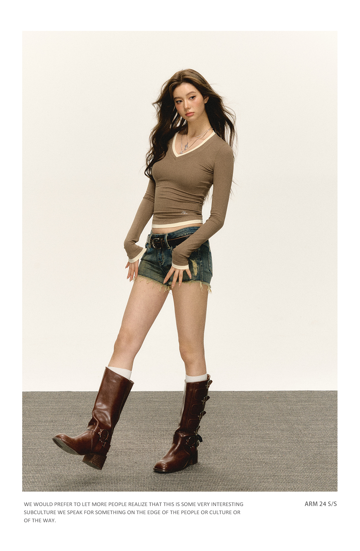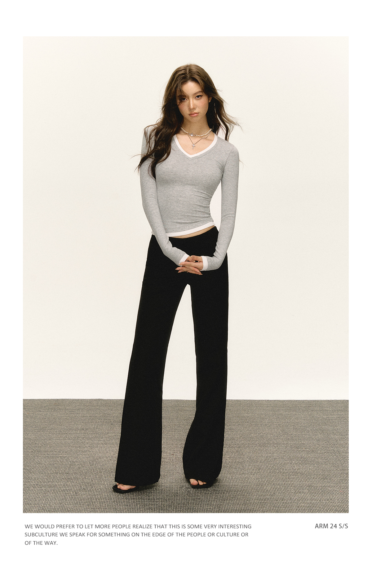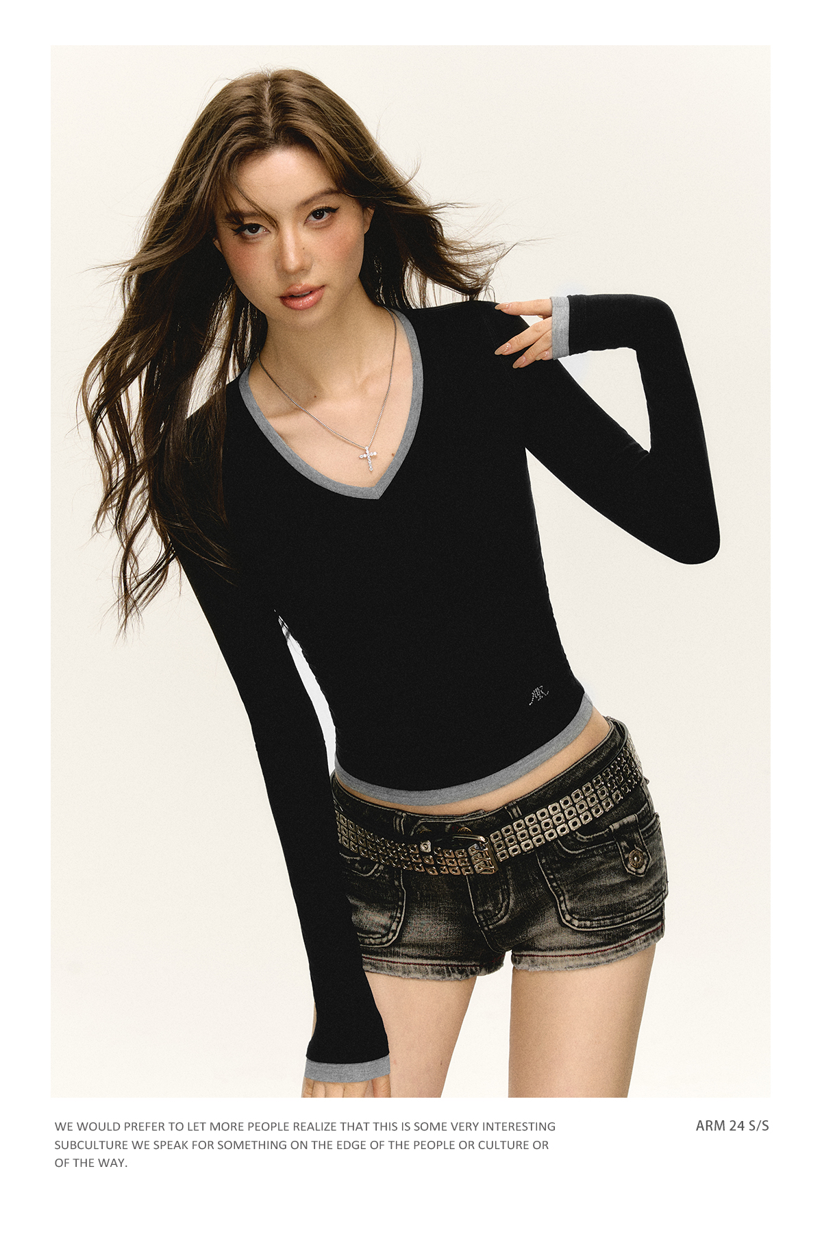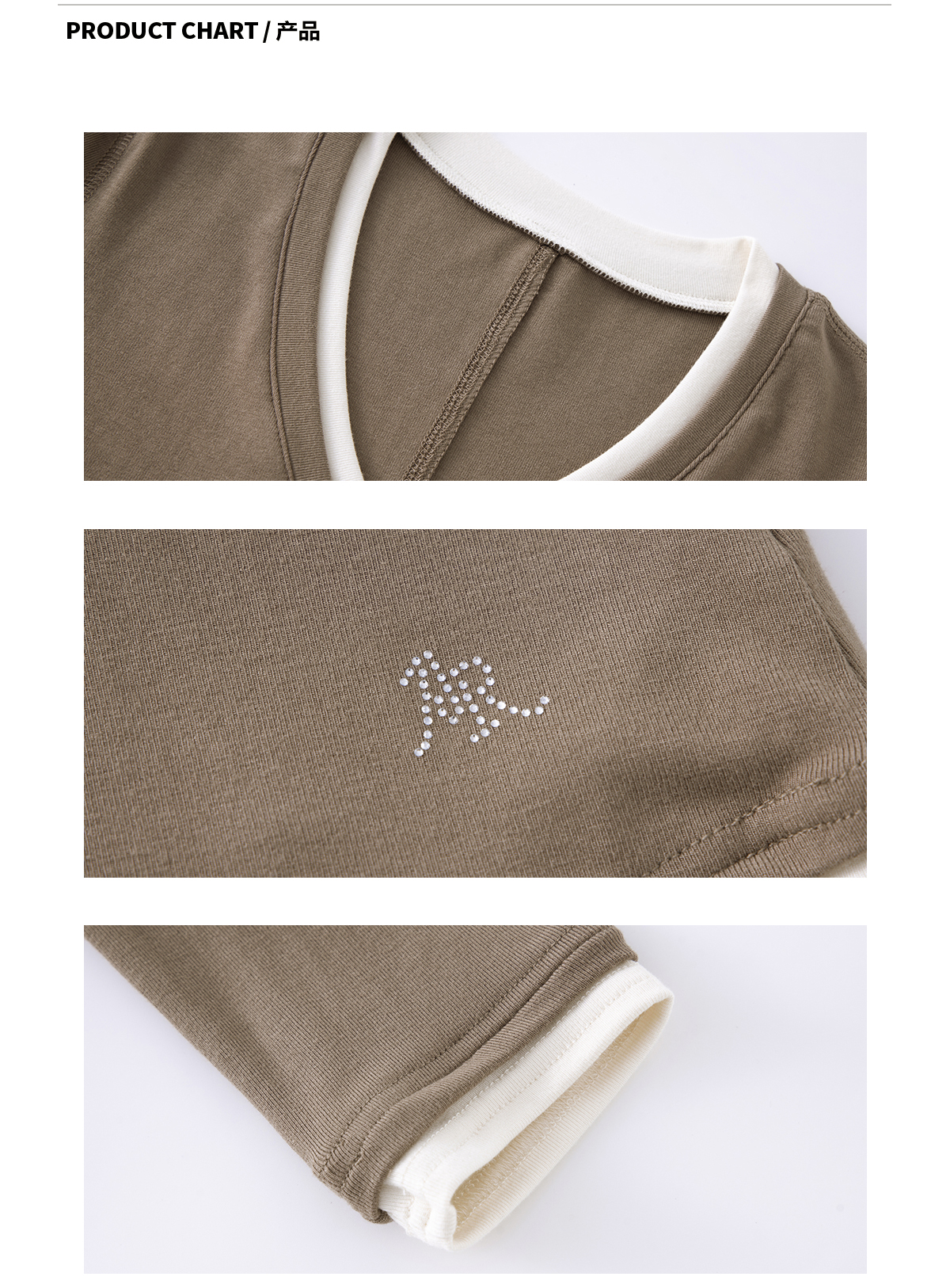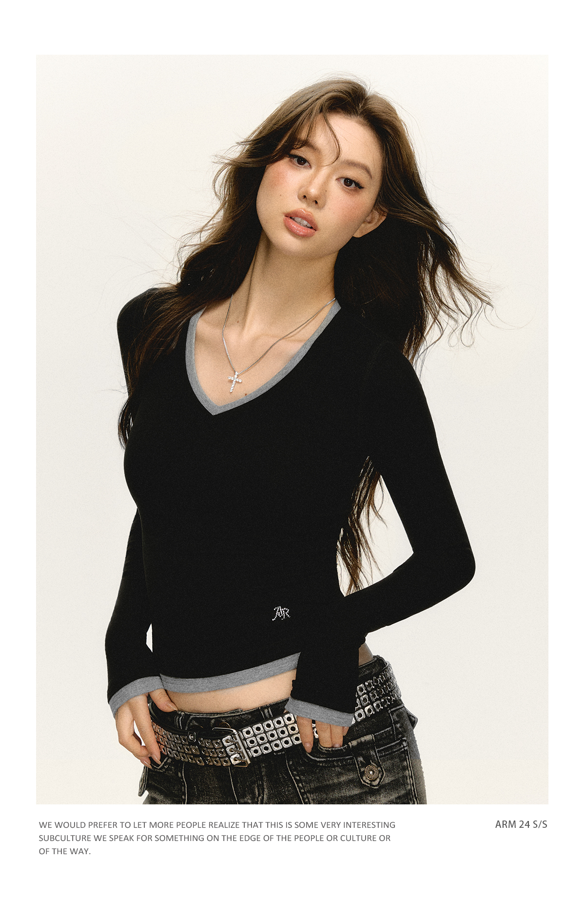Ariseism 美式复古撞色V领长袖t恤女2025春秋新款修身打底上衣