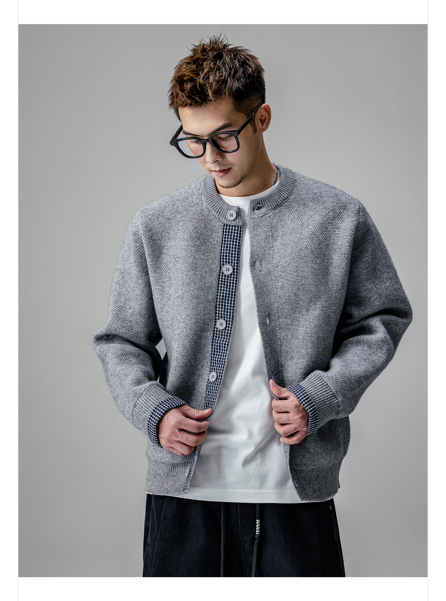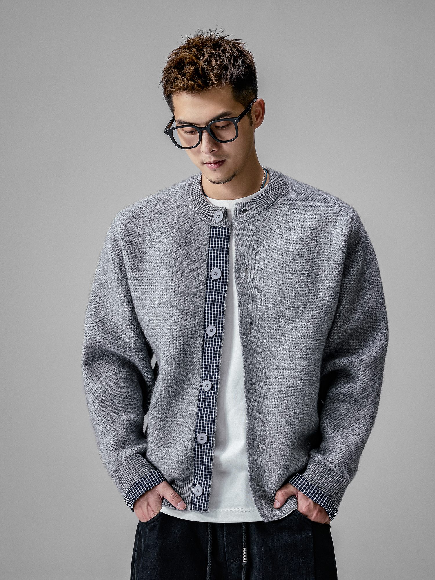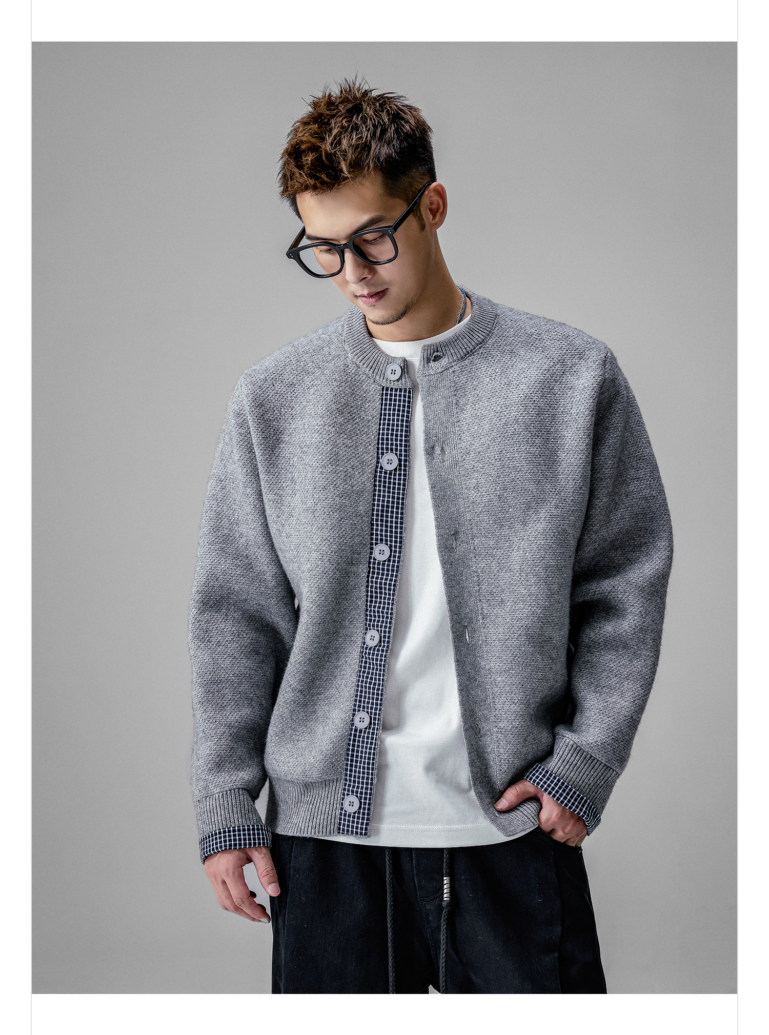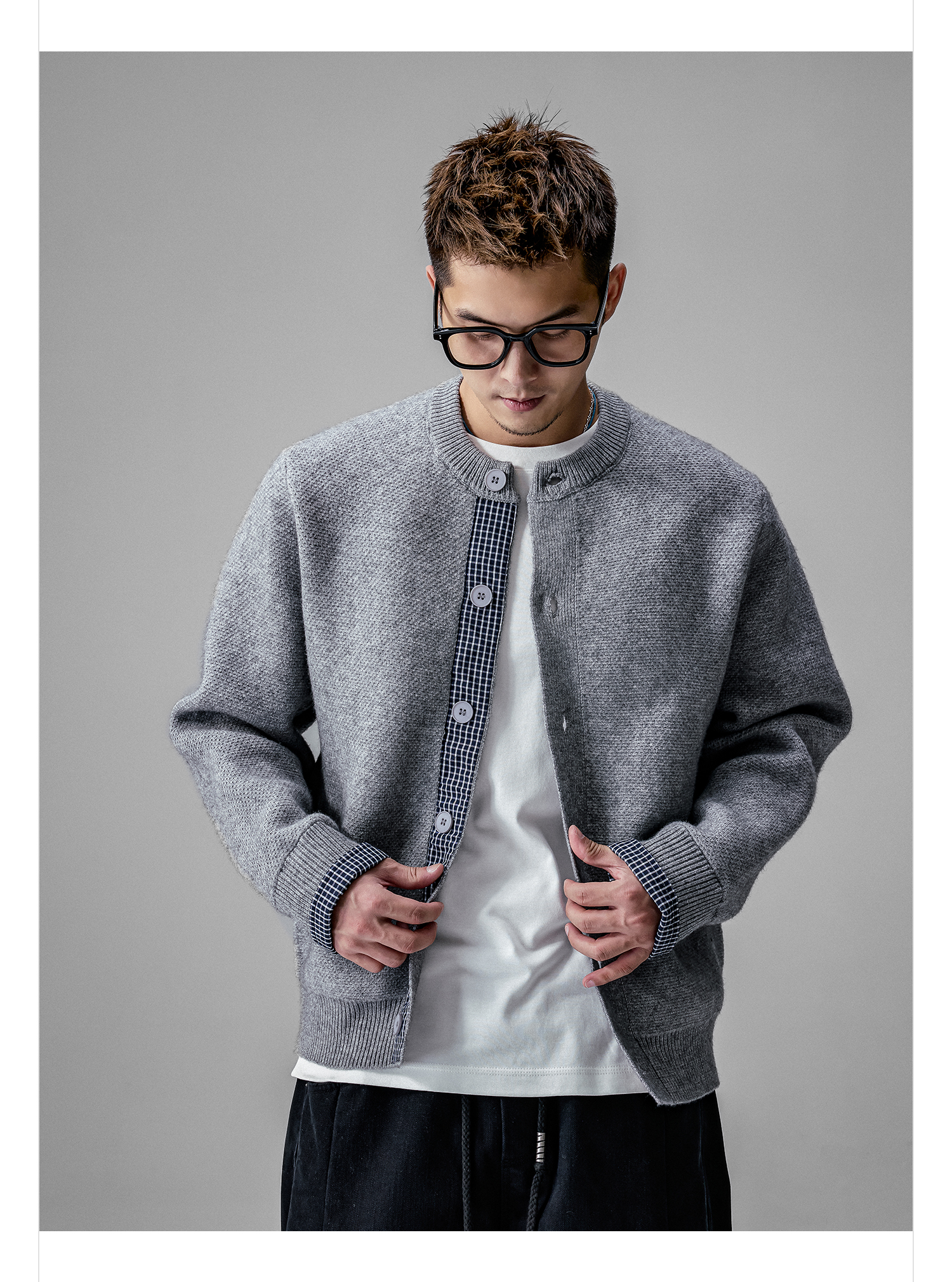徐太浪【拼接格子 扣子开襟】灰色开衫毛衣男秋冬休闲针织衫外套