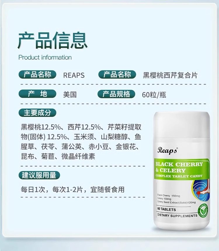 美国进口高浓度黑樱桃西芹菜籽平衡酸值缓解疼痛溶解结晶呵护关节