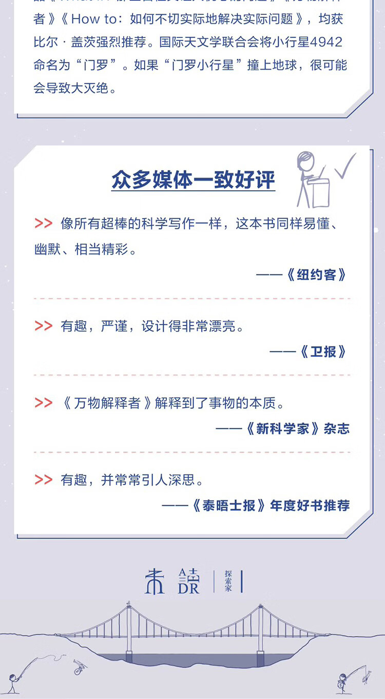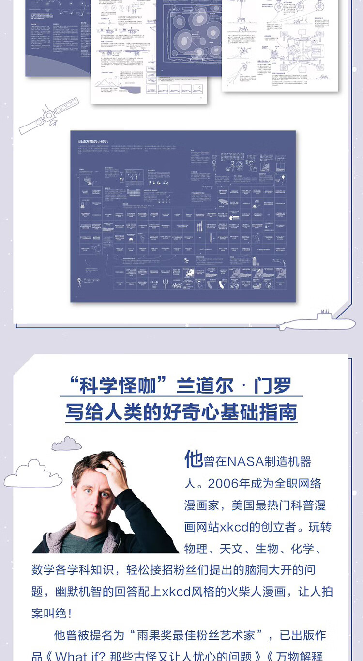 曾在NASA制造机器人。2006年成为全职网络漫画家,美国最热门科普漫画网站xkcd的创立者。玩转物理、天文、生物、化学、数学各学科知识,轻松接招粉丝们提出的脑洞大开的问题,幽默机智的回答配上xkcd风格的火柴人漫画,让人拍案叫绝!他曾被提名为“雨果奖最佳粉丝艺术家”,已出版作品《What if? 那些古怪又让人忧心的问题》《万物解释者》《How to:如何不切实际地解决实际问题》,均获比尔·盖茨强烈推荐。国际天文学联合会将小行星4942命名为“门罗”。如果“门罗小行星”撞上地球,很可能会导致大灭绝。