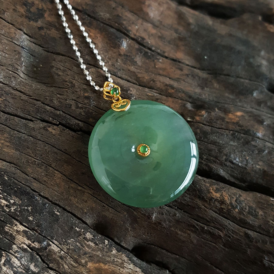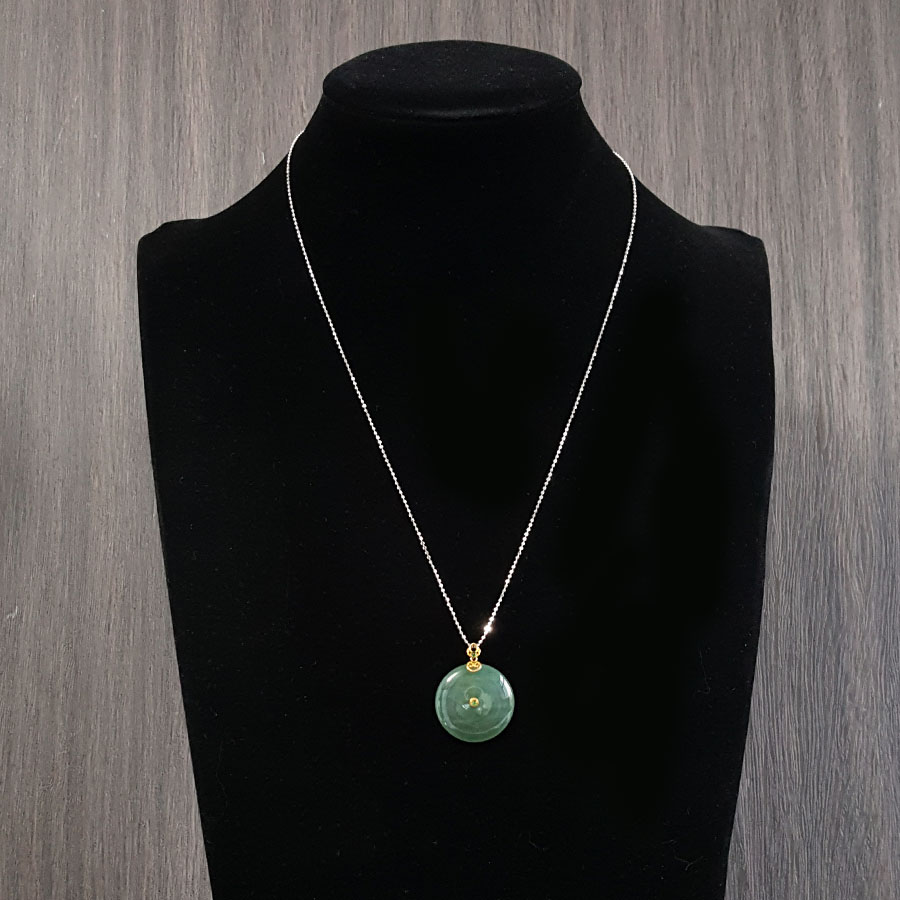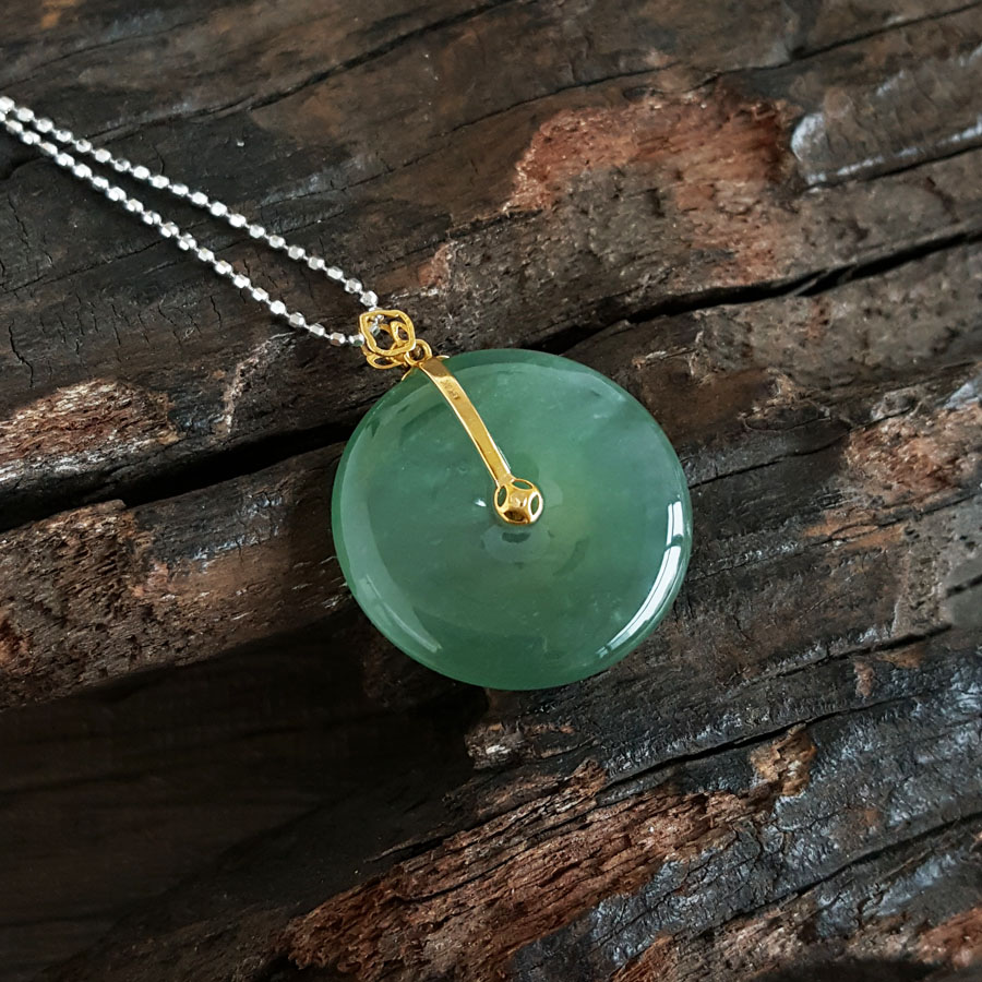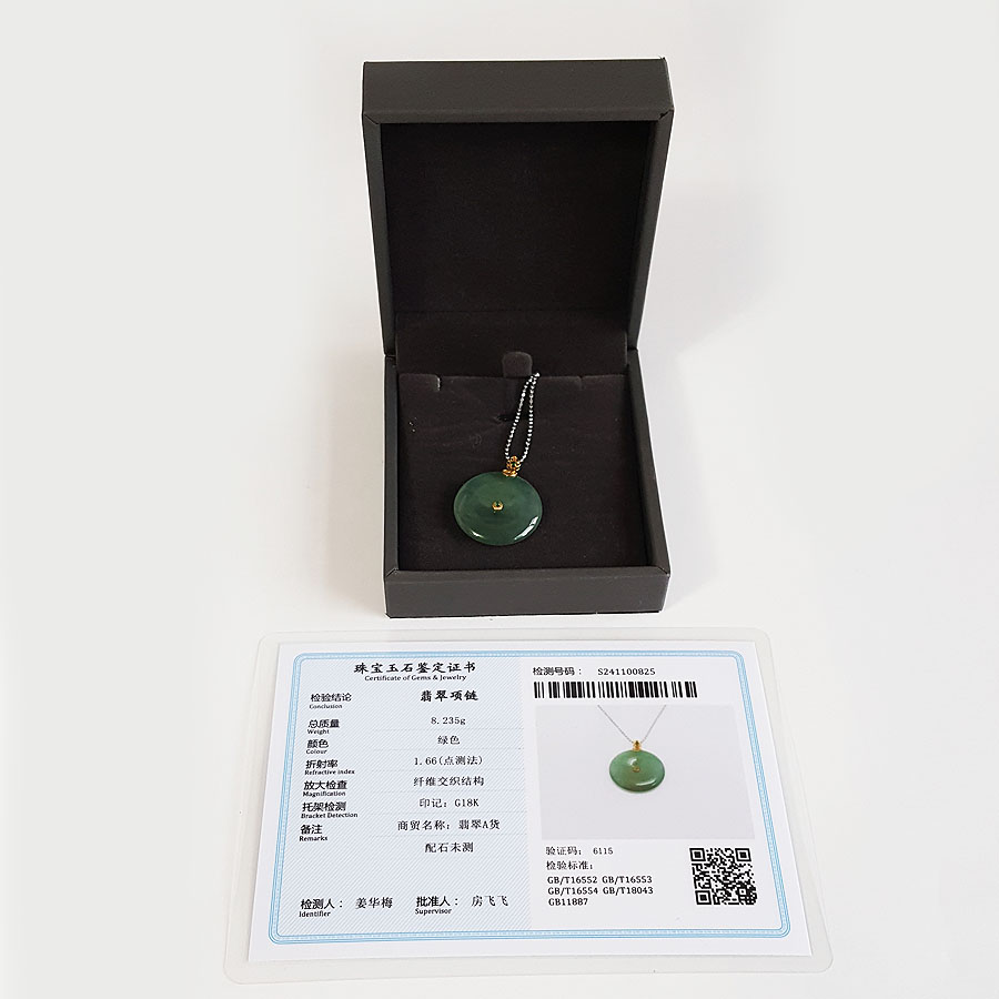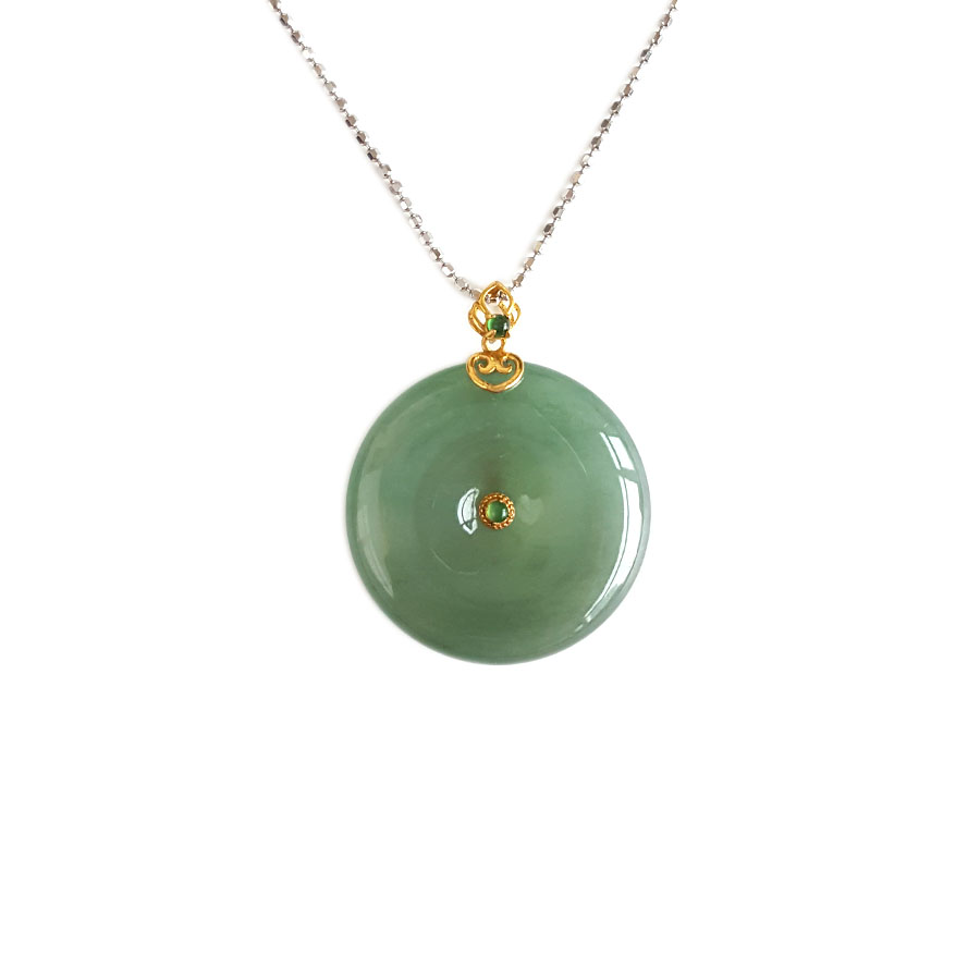 名称 | AU750黄金镶天然冰种绿色平安扣翡翠吊坠项链 |