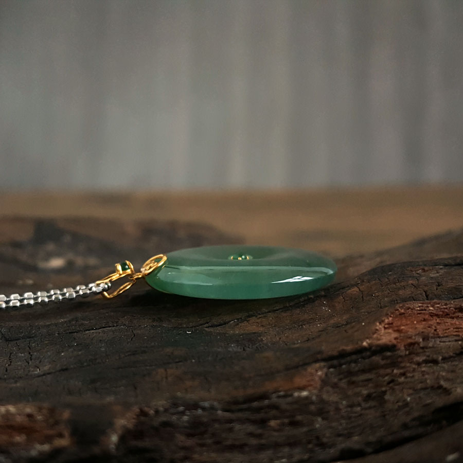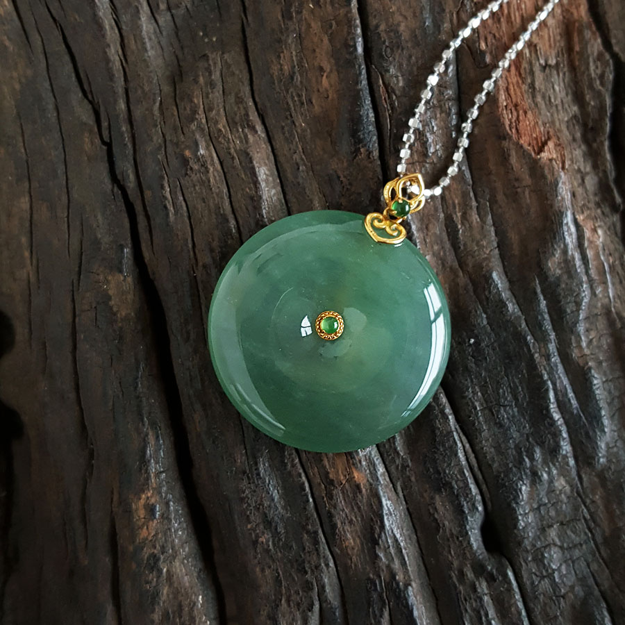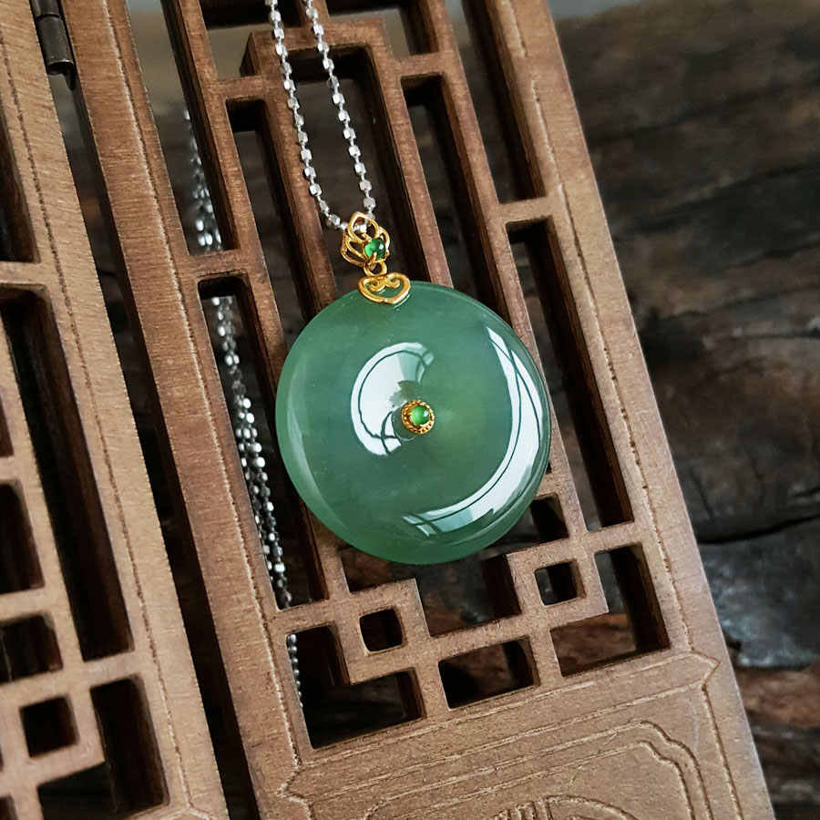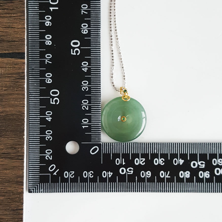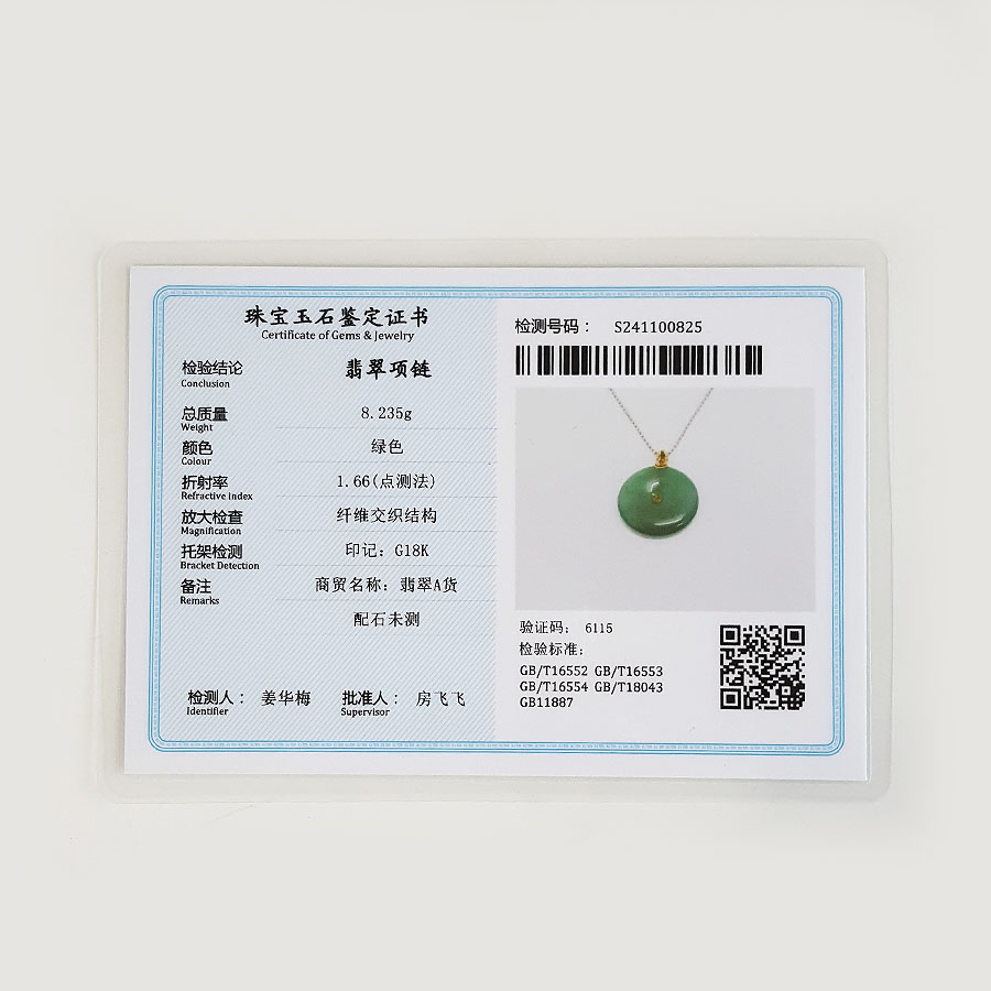 名称 | AU750黄金镶天然冰种绿色平安扣翡翠吊坠项链 |