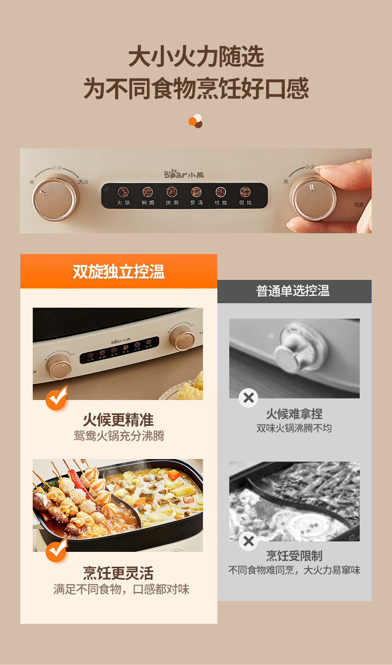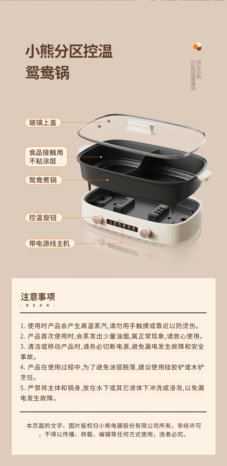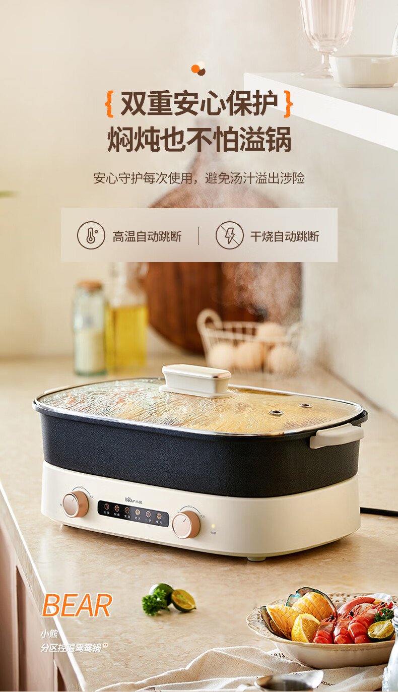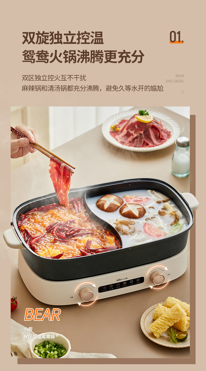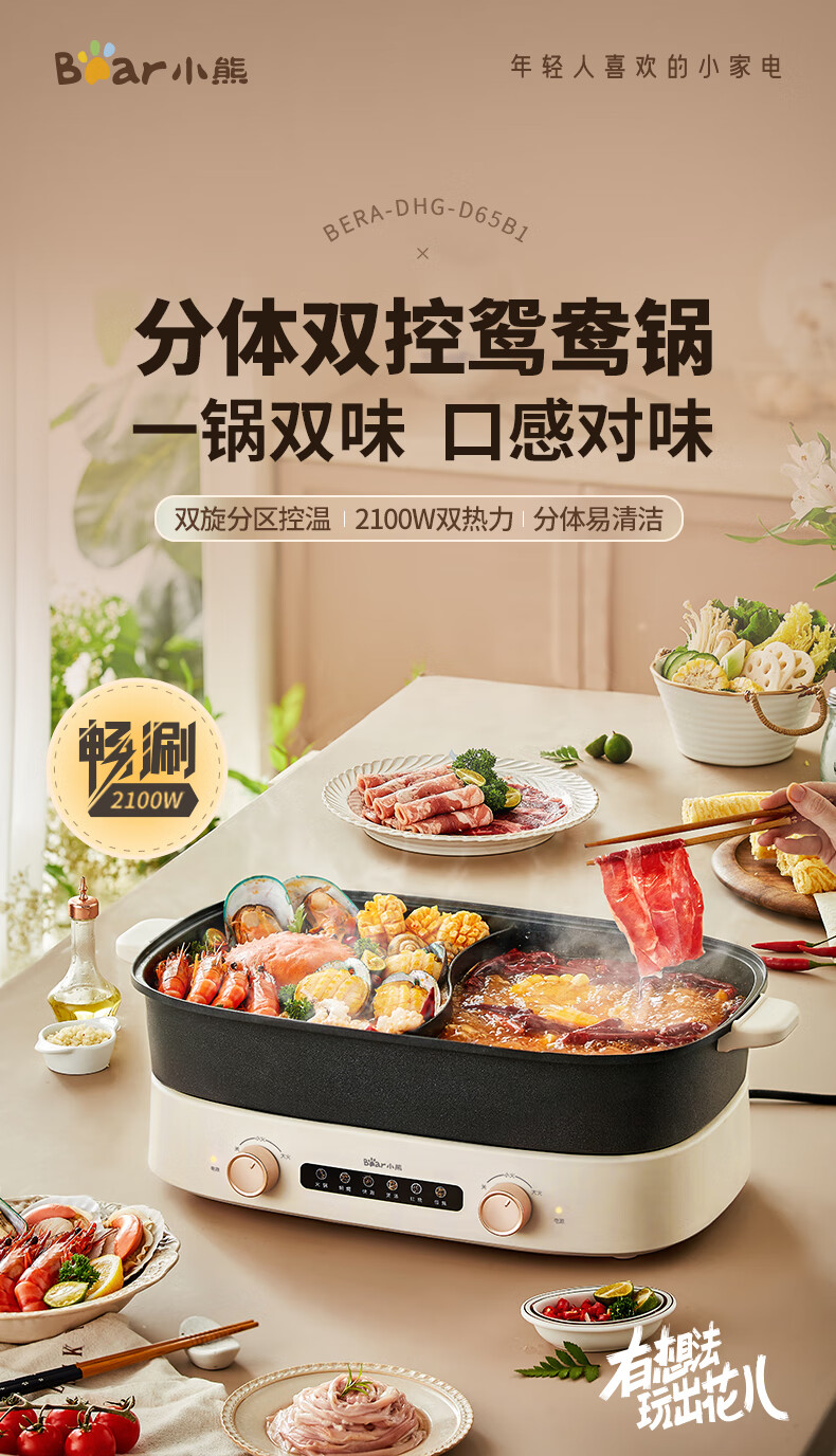 小熊(Bear)电火锅 双旋钮鸳鸯锅独立控温 多功能锅 6.5L大容量分体式家用电煮锅火锅锅多用途锅 DHG-D65B1