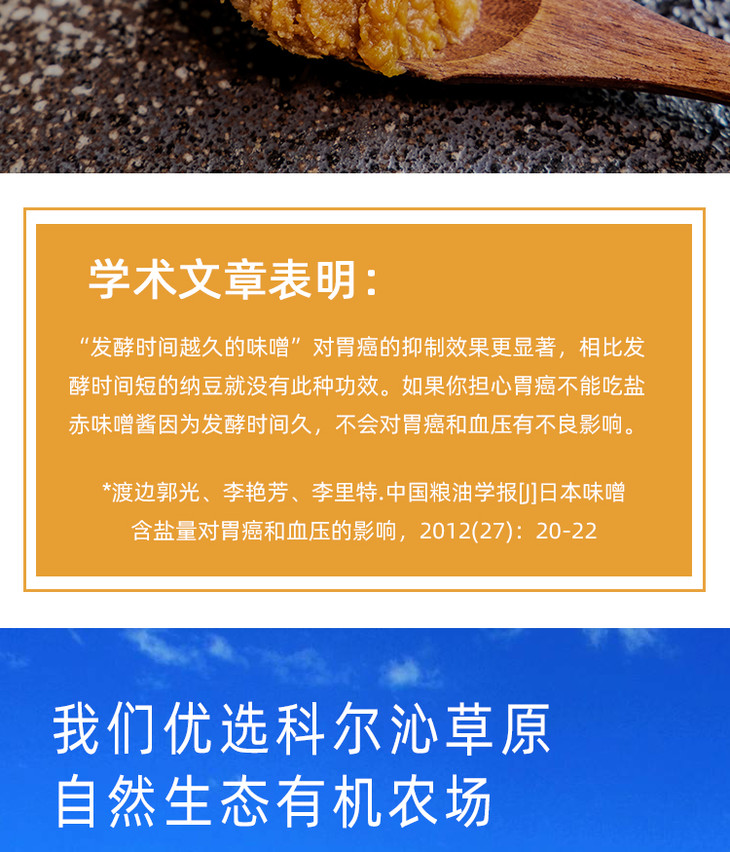品名:有机味噌酱产地/发货地:内蒙古/浙江保质期:12个月售卖期:全年生产日期:见封口处 包装方式:泡沫托+纸箱生产许可证:SC10315220100031配料:水、有机大豆、有机大米等见详情 |