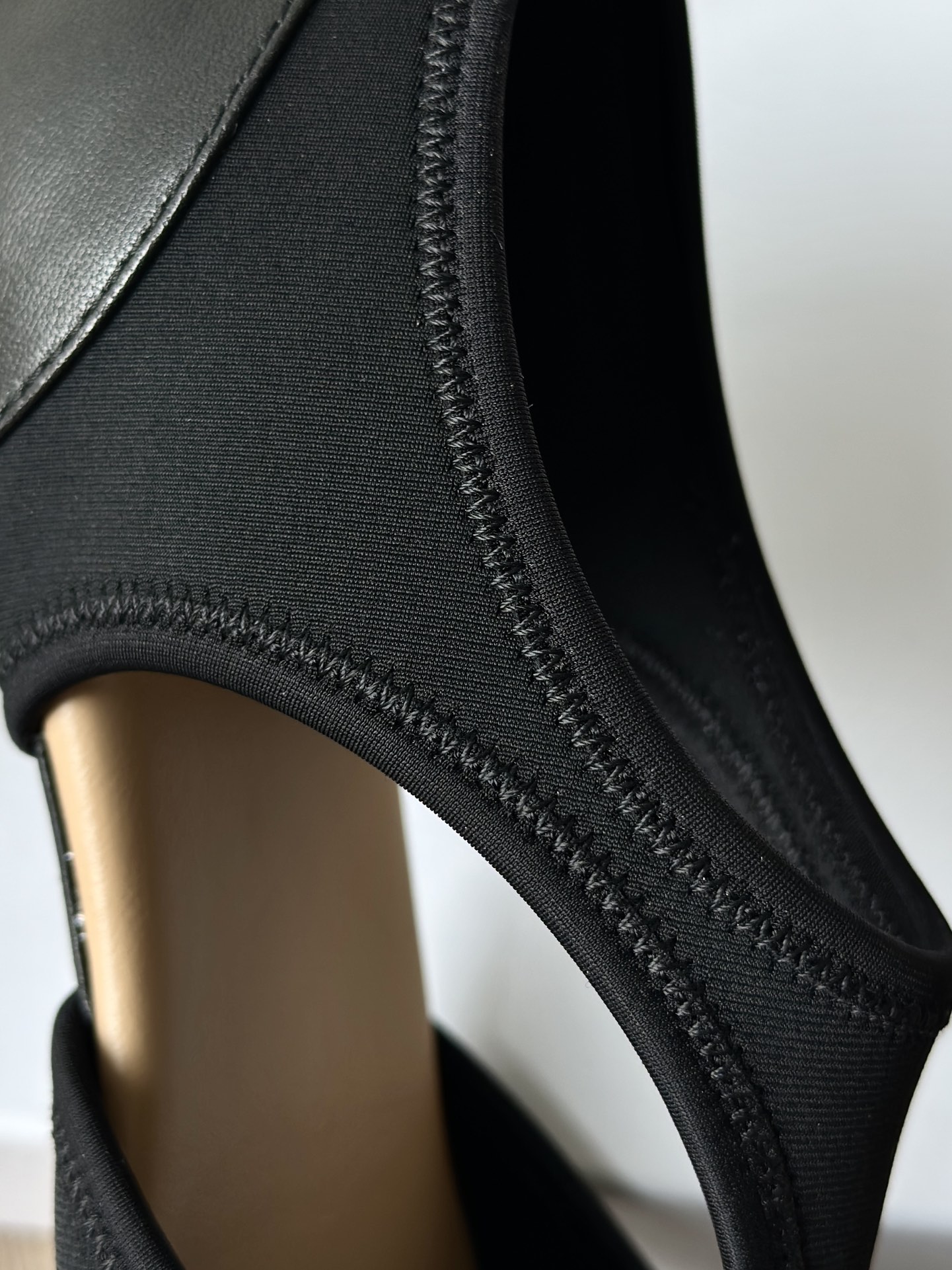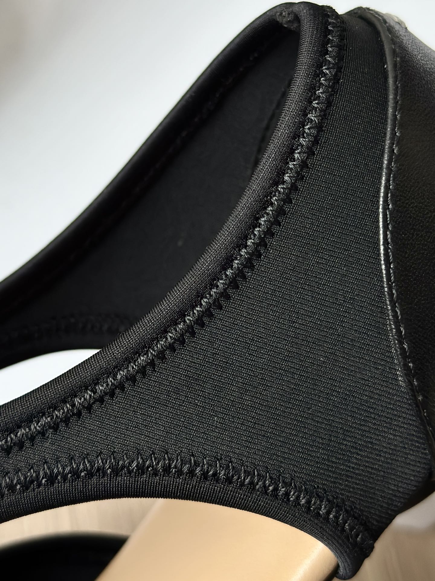 牛皮拼接进口高弹莱卡 手感细腻上档次! 走线细节处理的很到位!材料舒适弹力感超级好,双面对贴做工成本都不便宜!