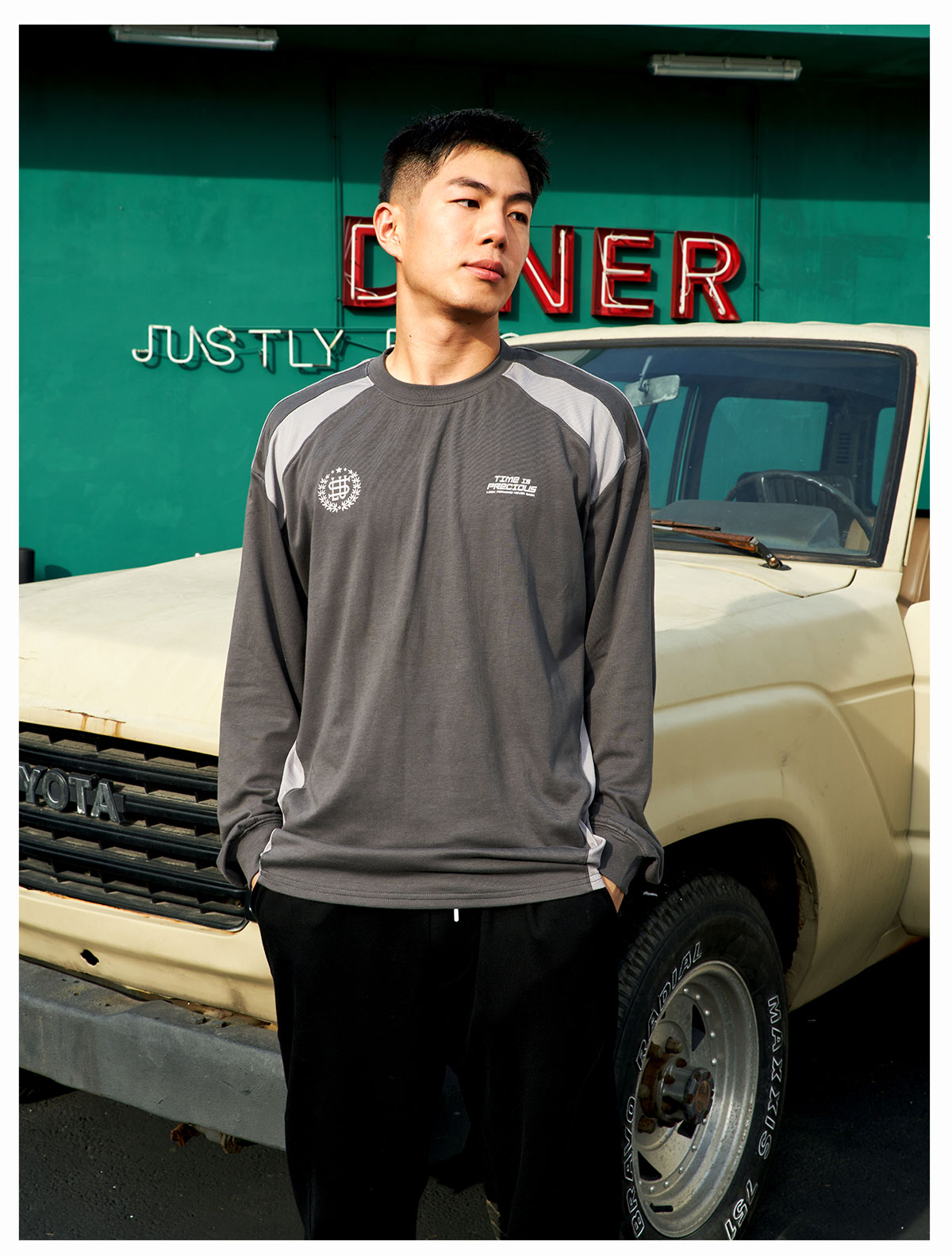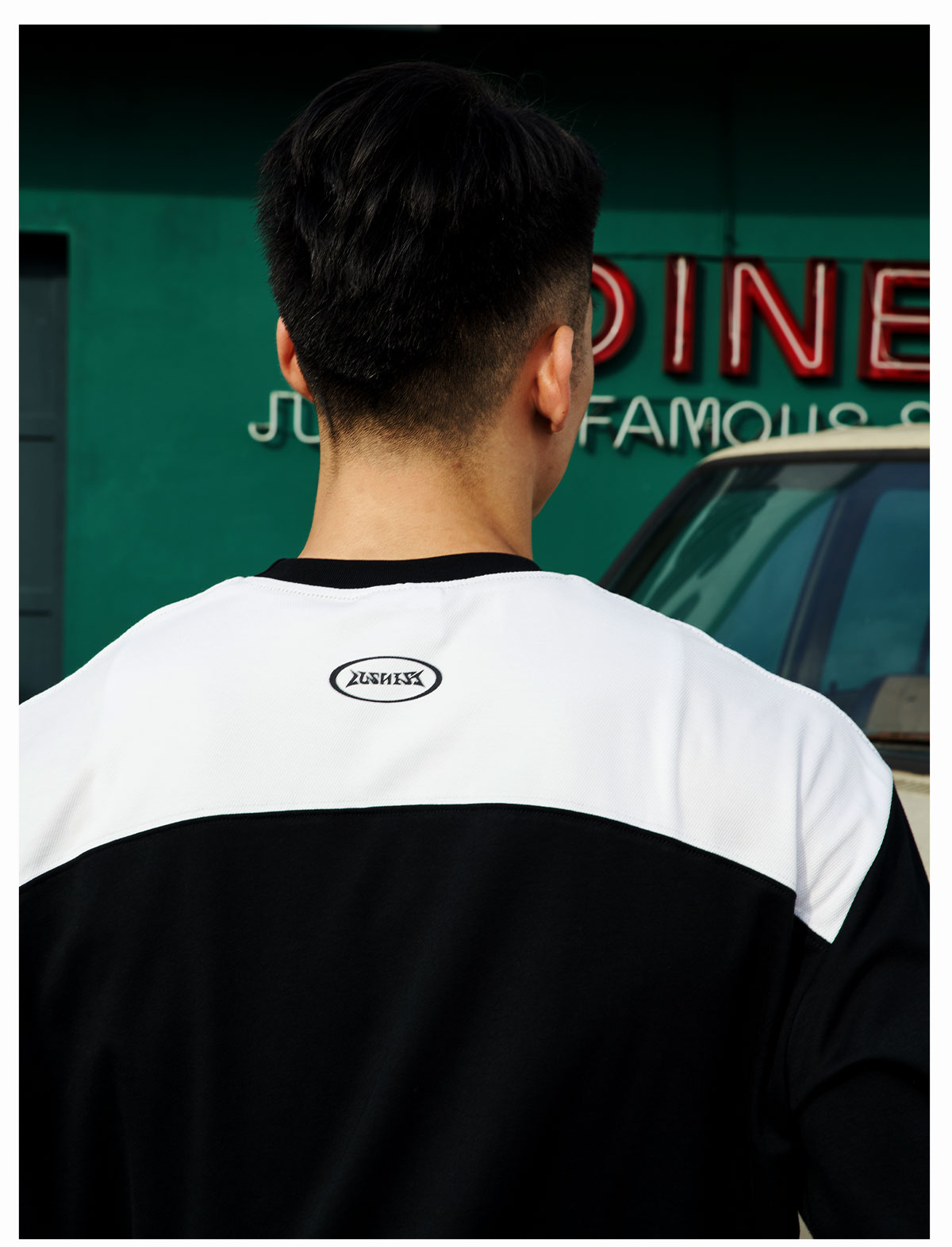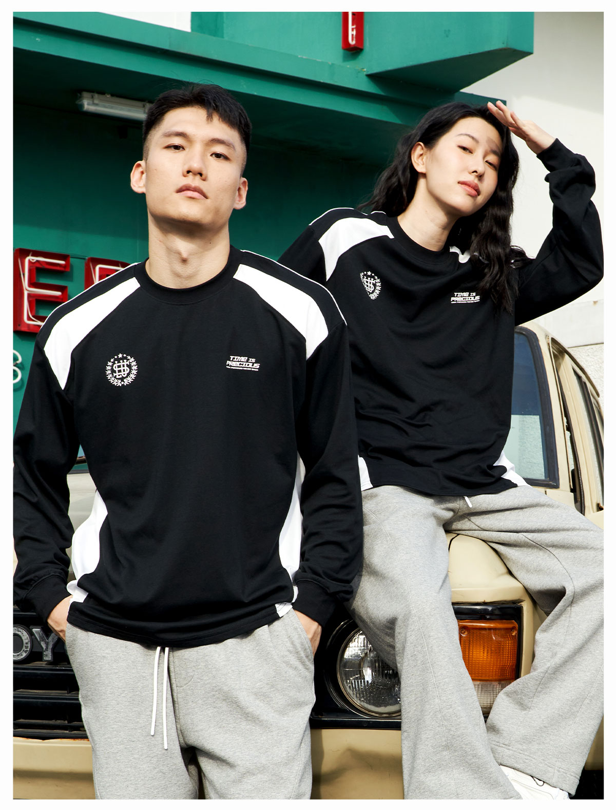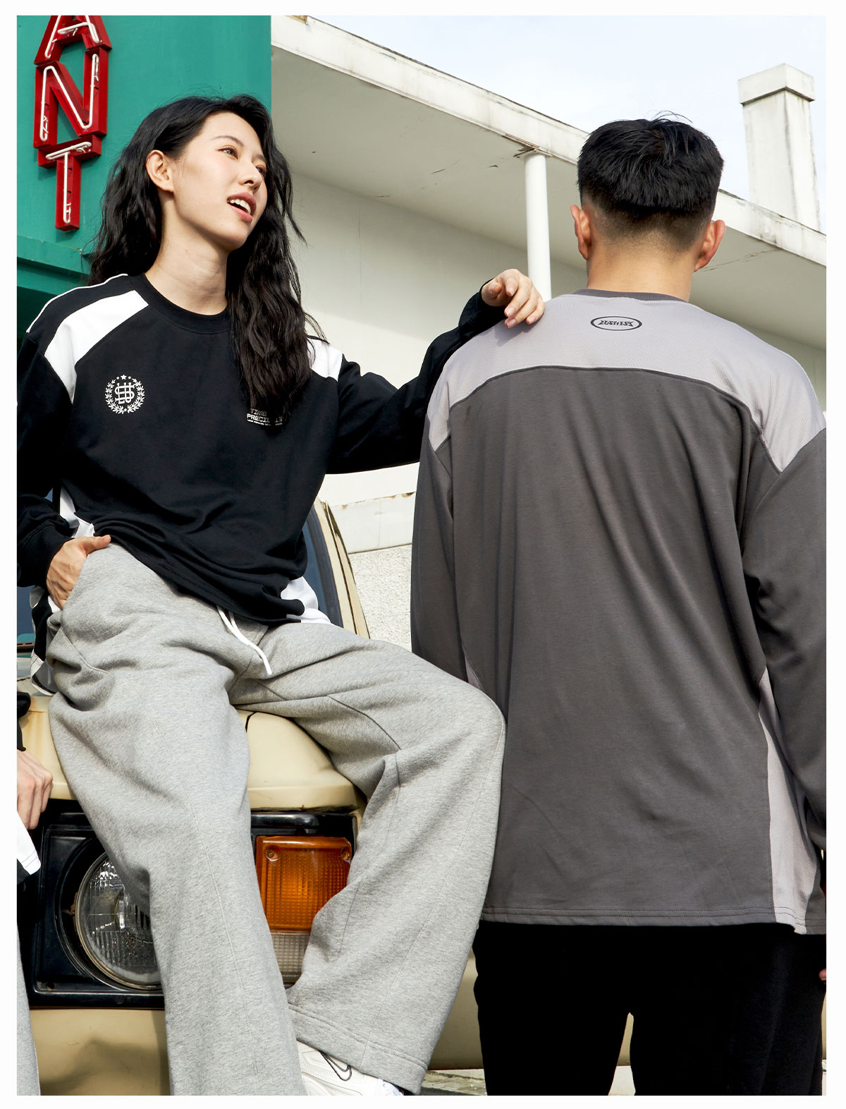 LUSHISI「棉感速干」双色拼接字母撞色运动复古风混纺棉长袖t恤