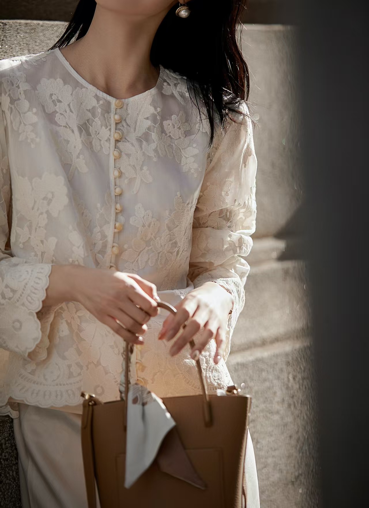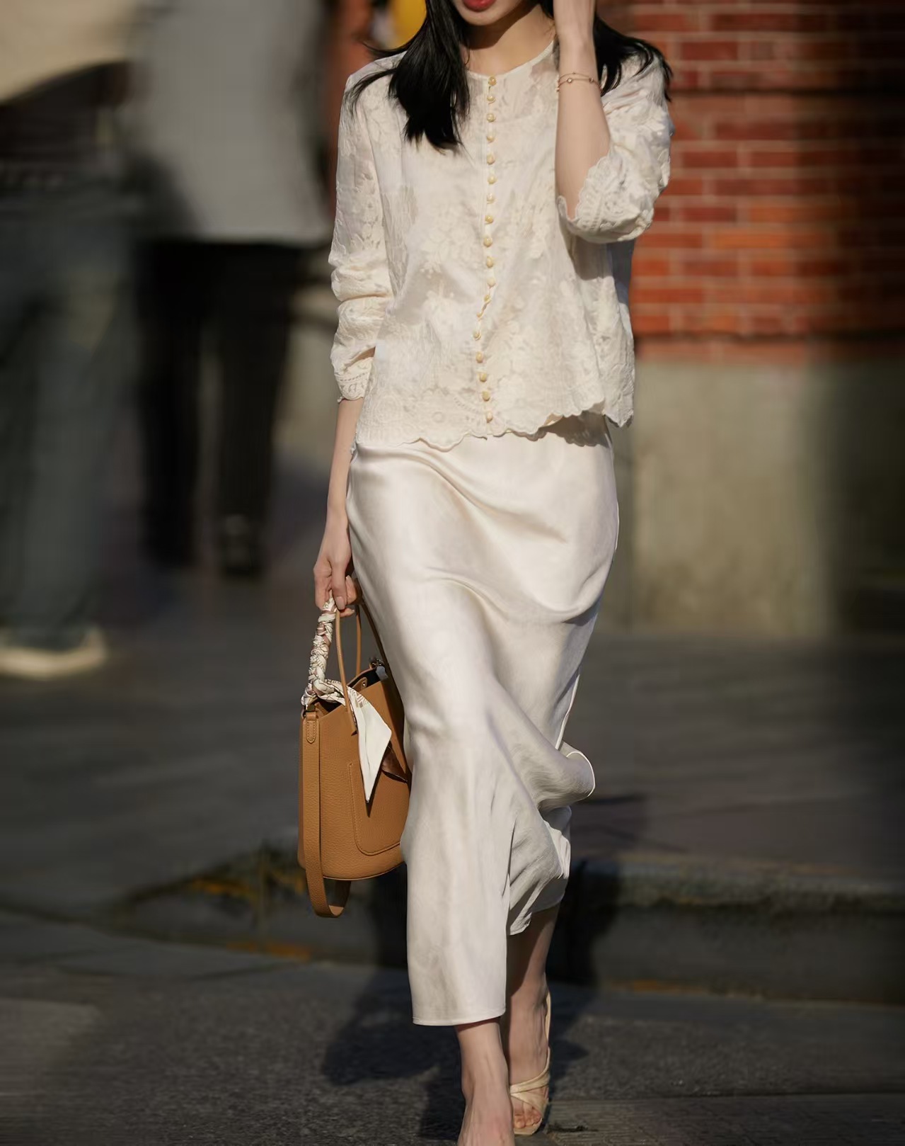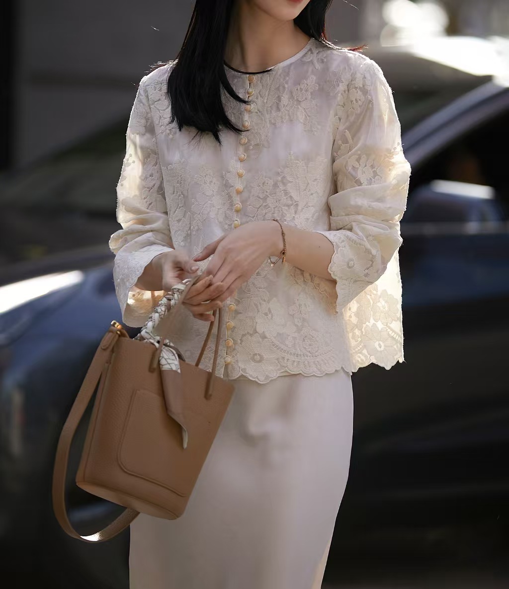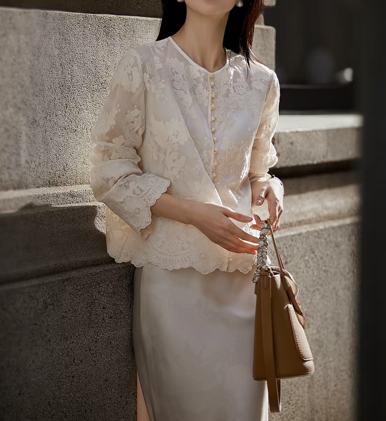 穿上它,转身间,光泽在柔和的阳光照射下流转刺绣的花朵仿佛随着你的舞动而生动起来