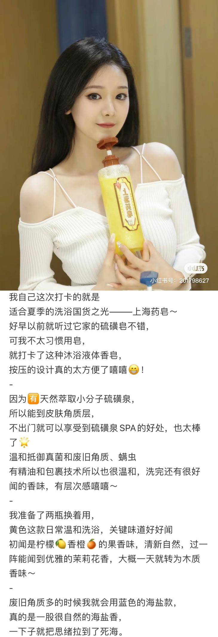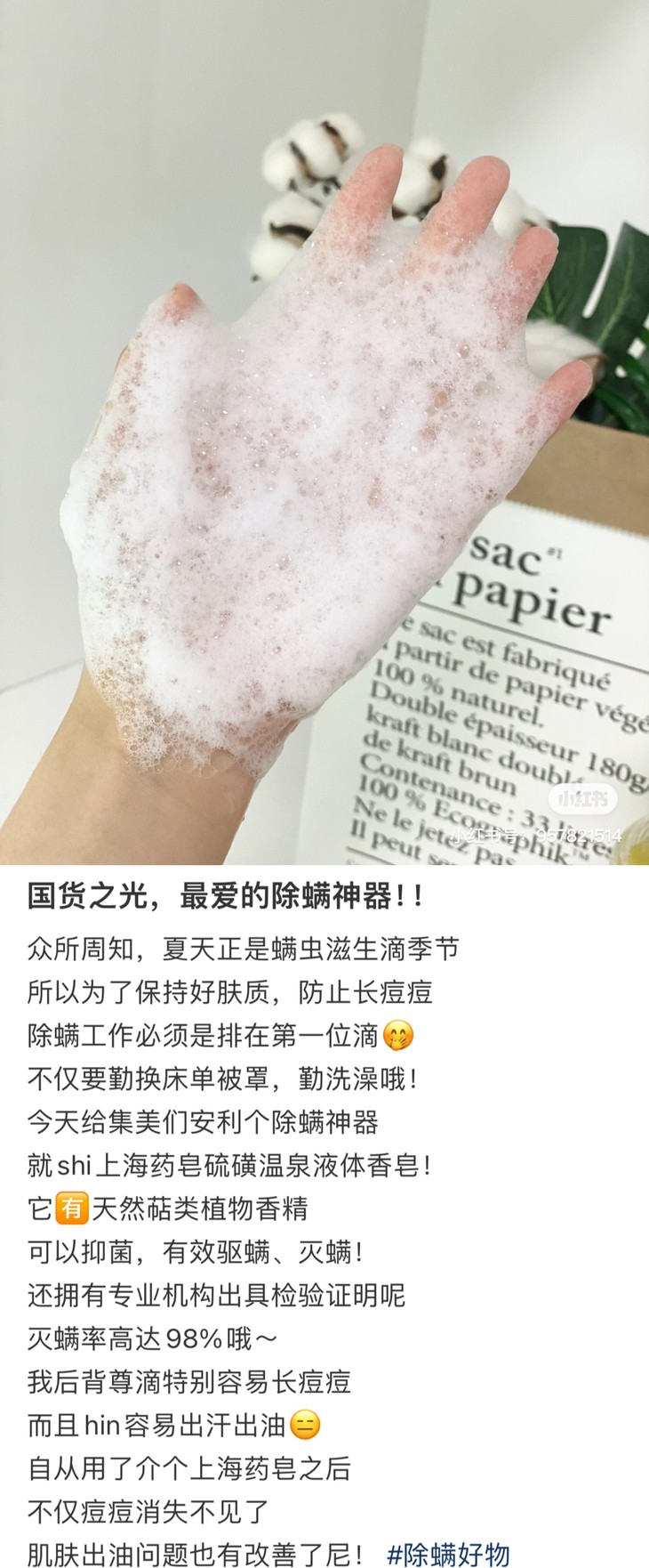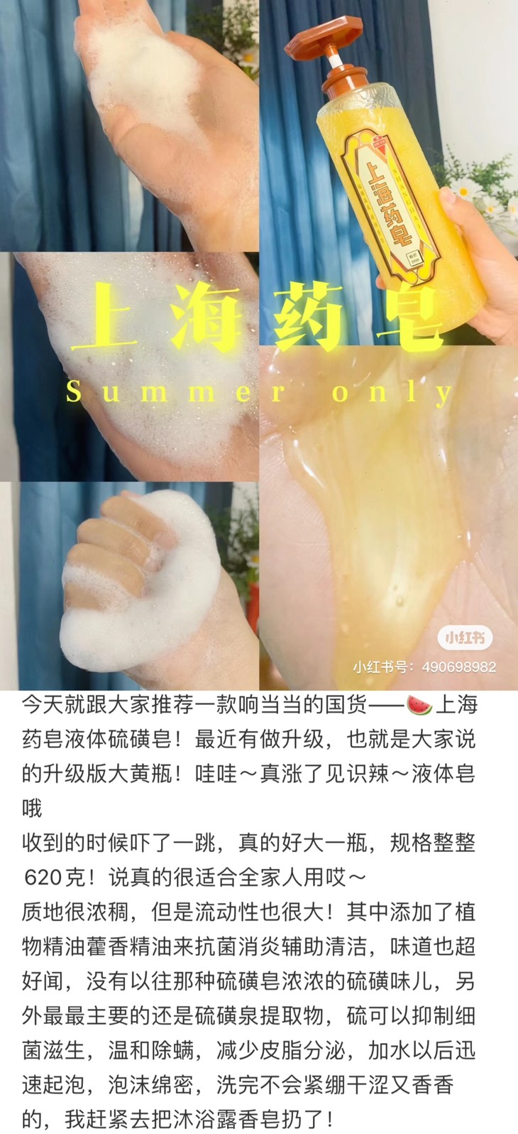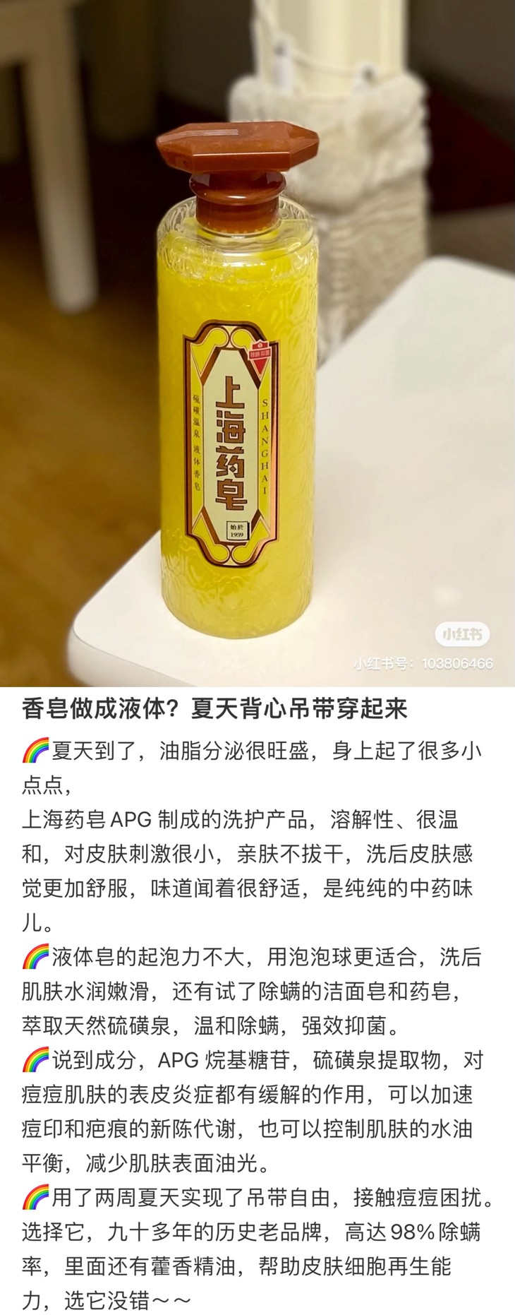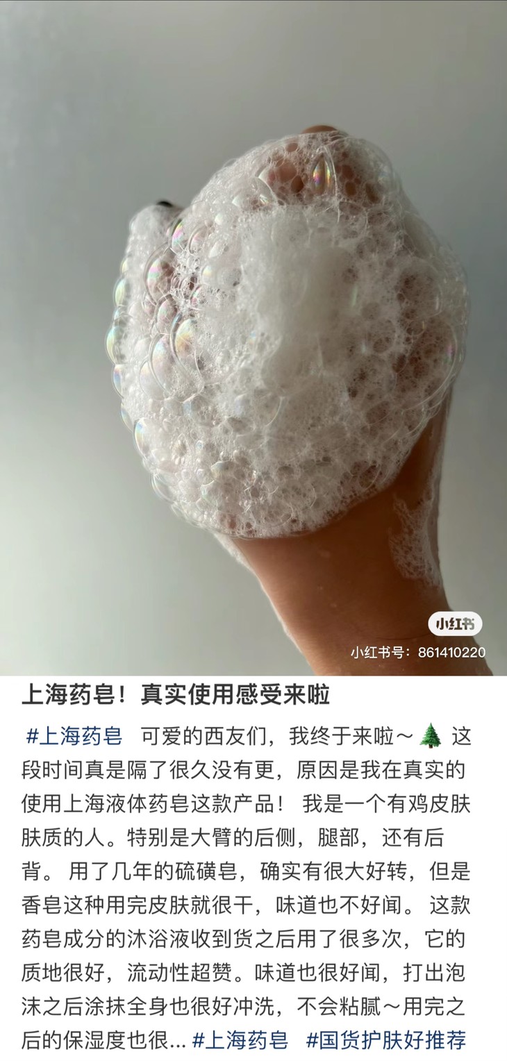 上海制皂,绝对的国货之光啦!它家的产品,从曾经凭票供应的"固本肥皂",到常作为结婚礼物的"蜂花檀香皂",再到家里常见的"硫磺皂"……陪伴着父母辈和我们走过漫长岁月。看到有新出的硫磺液体香皂,一定要推荐一下的,洗手洗澡,yi菌除螨,尤其适合背上容易长痘痘的老粉们哦!也可以送给热爱硫磺皂的长辈,液体瓶装,更方便也更温和!