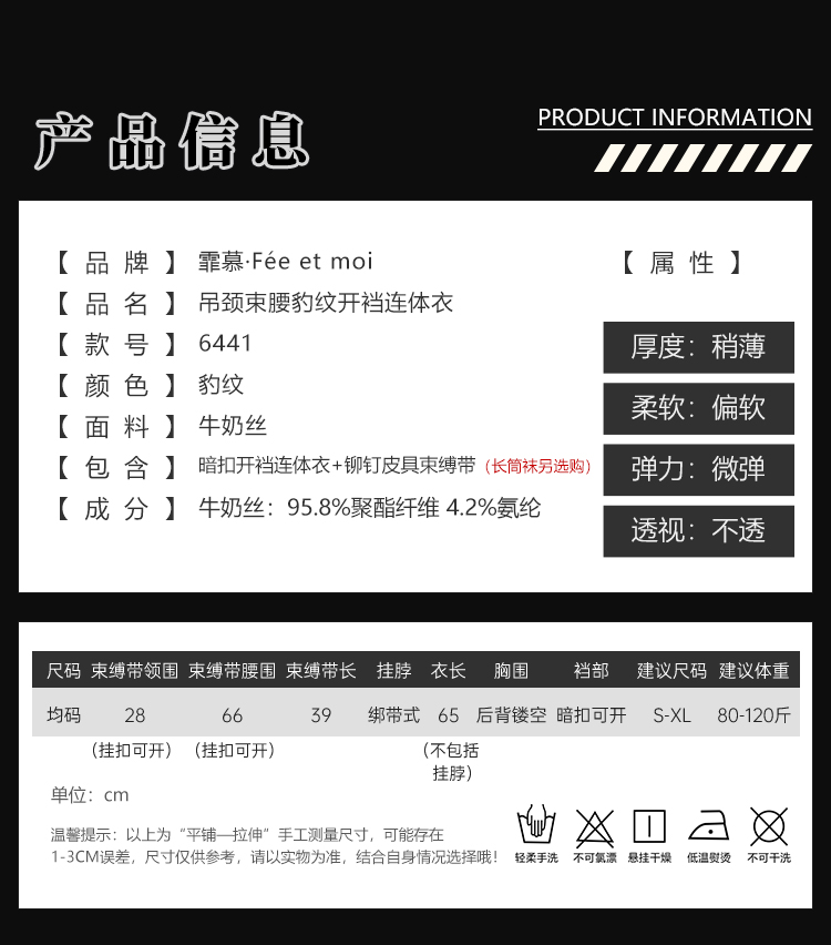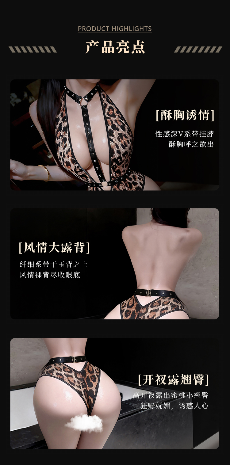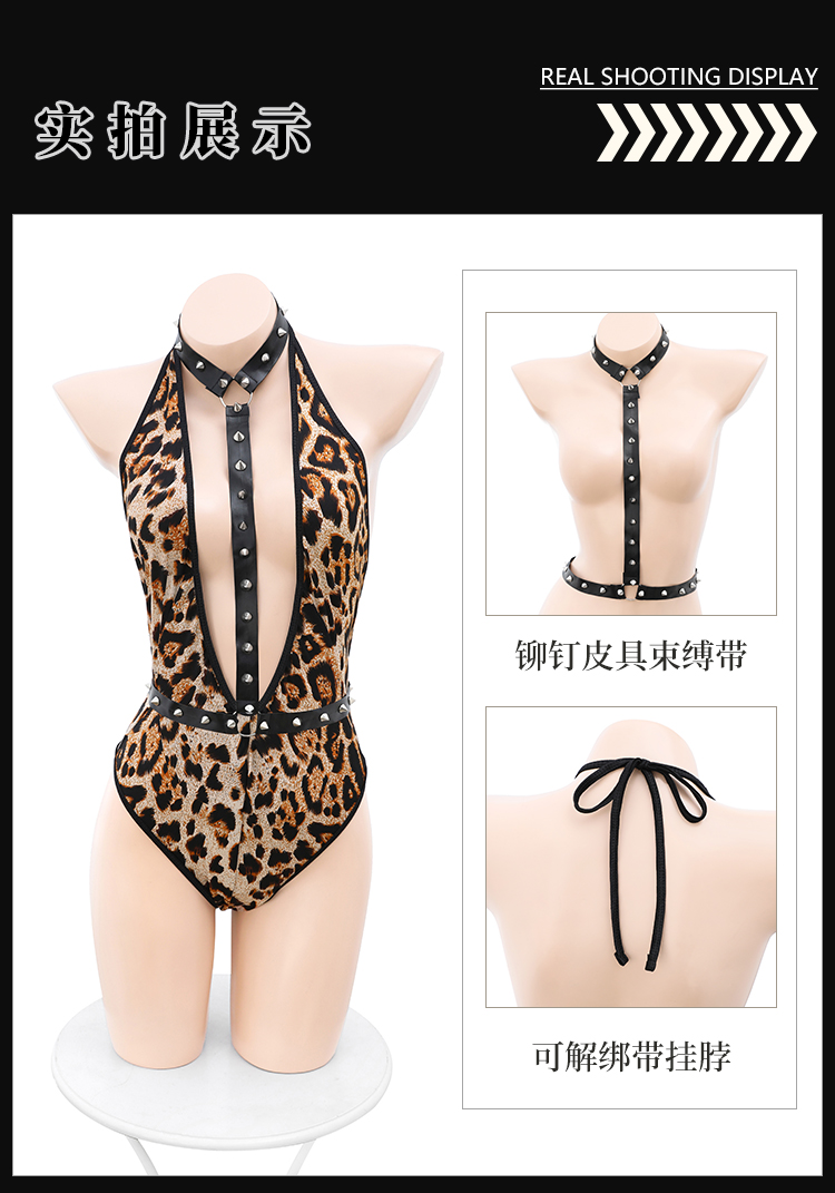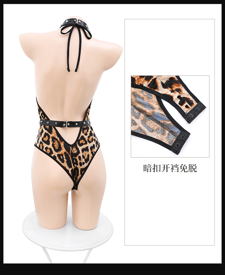 霏慕 吊颈束腰豹纹开裆连体衣6441