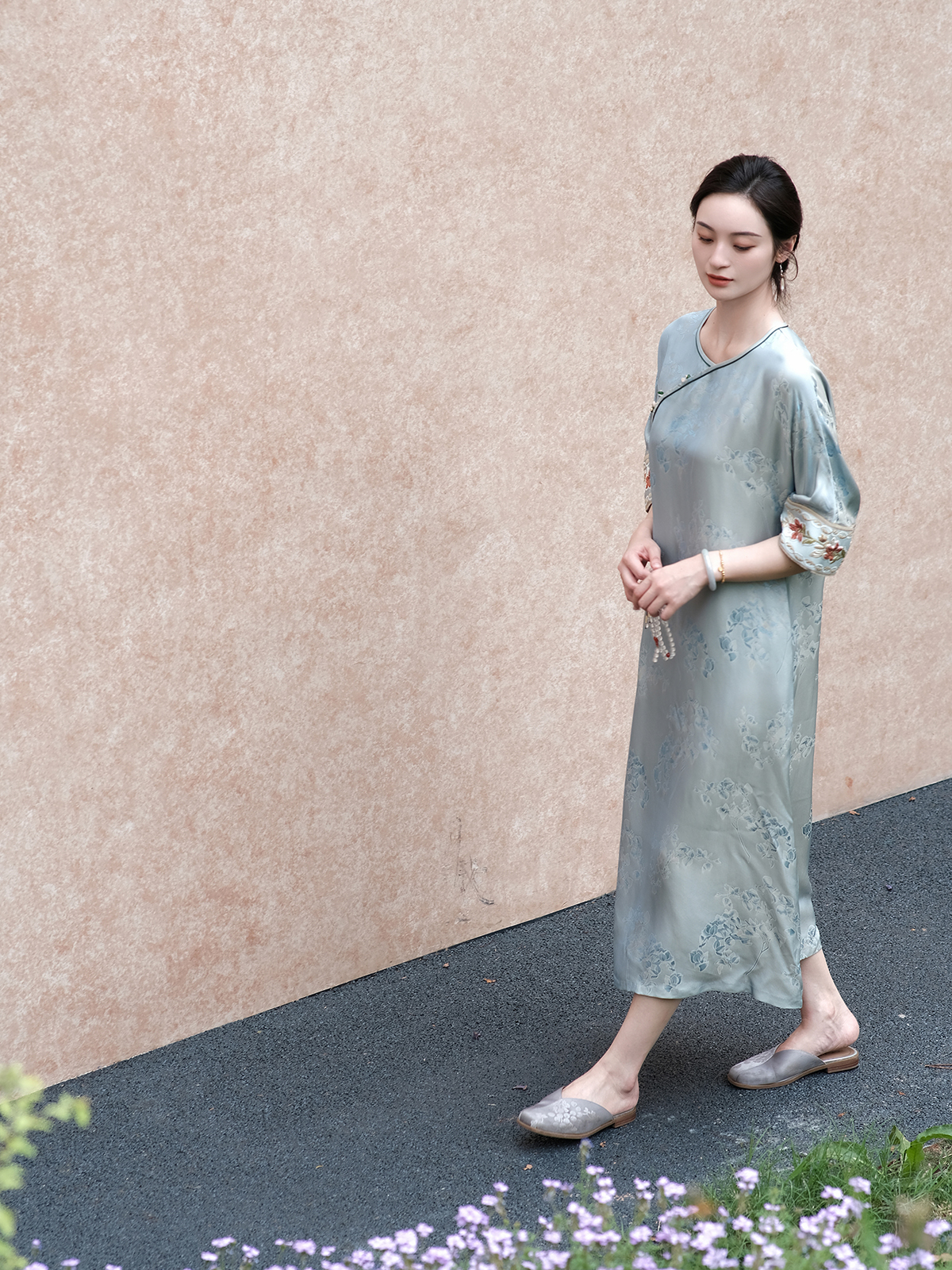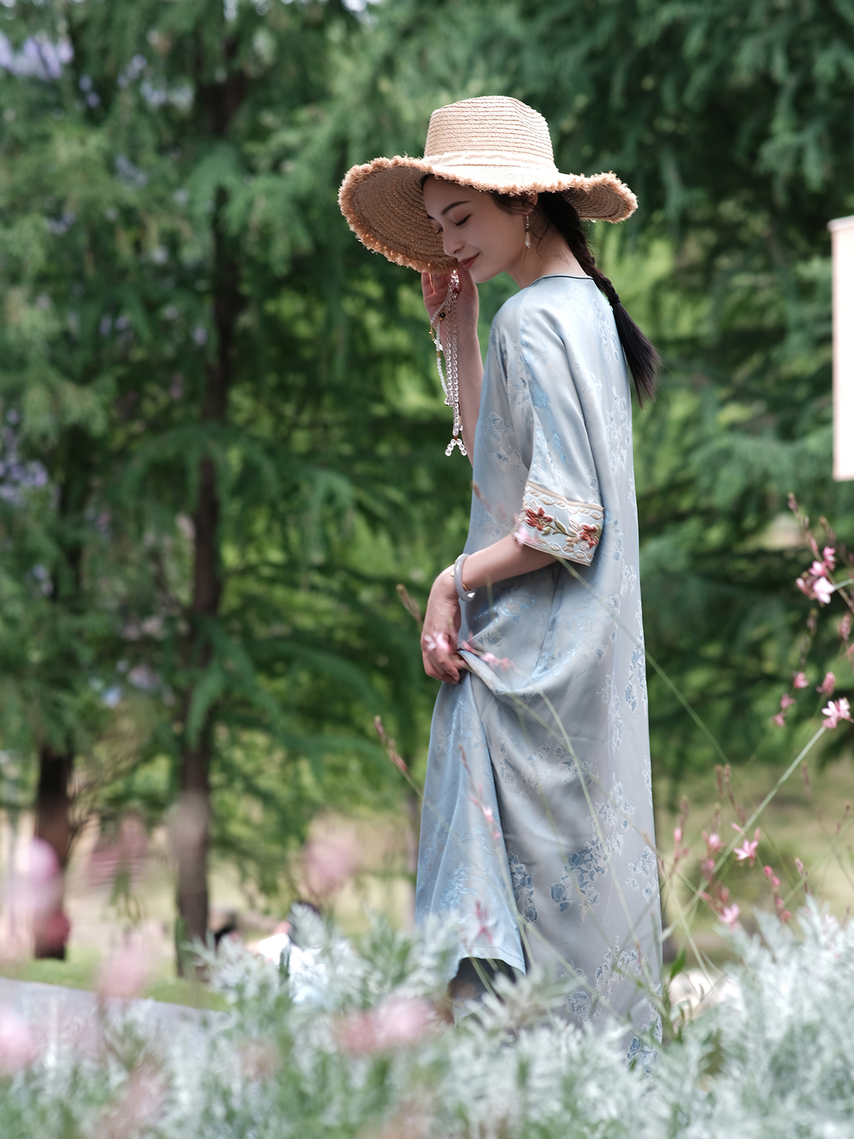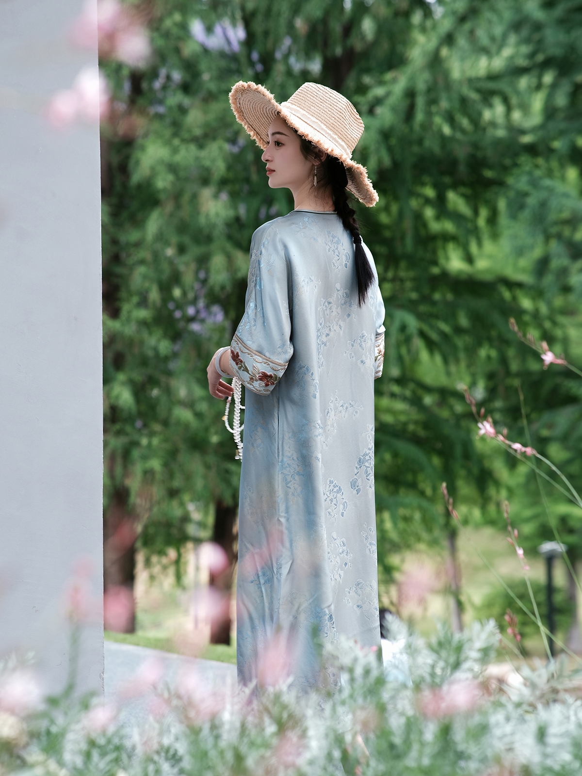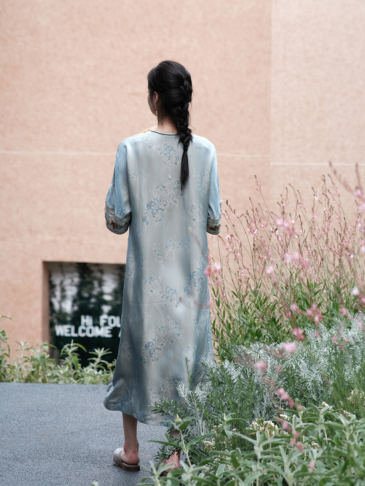 下架|盛唐婧 |提花真丝缎国色天香连衣裙-蓝色