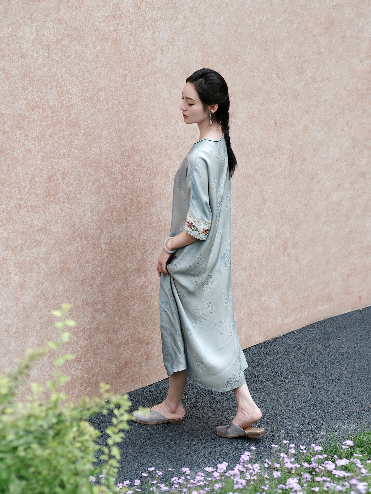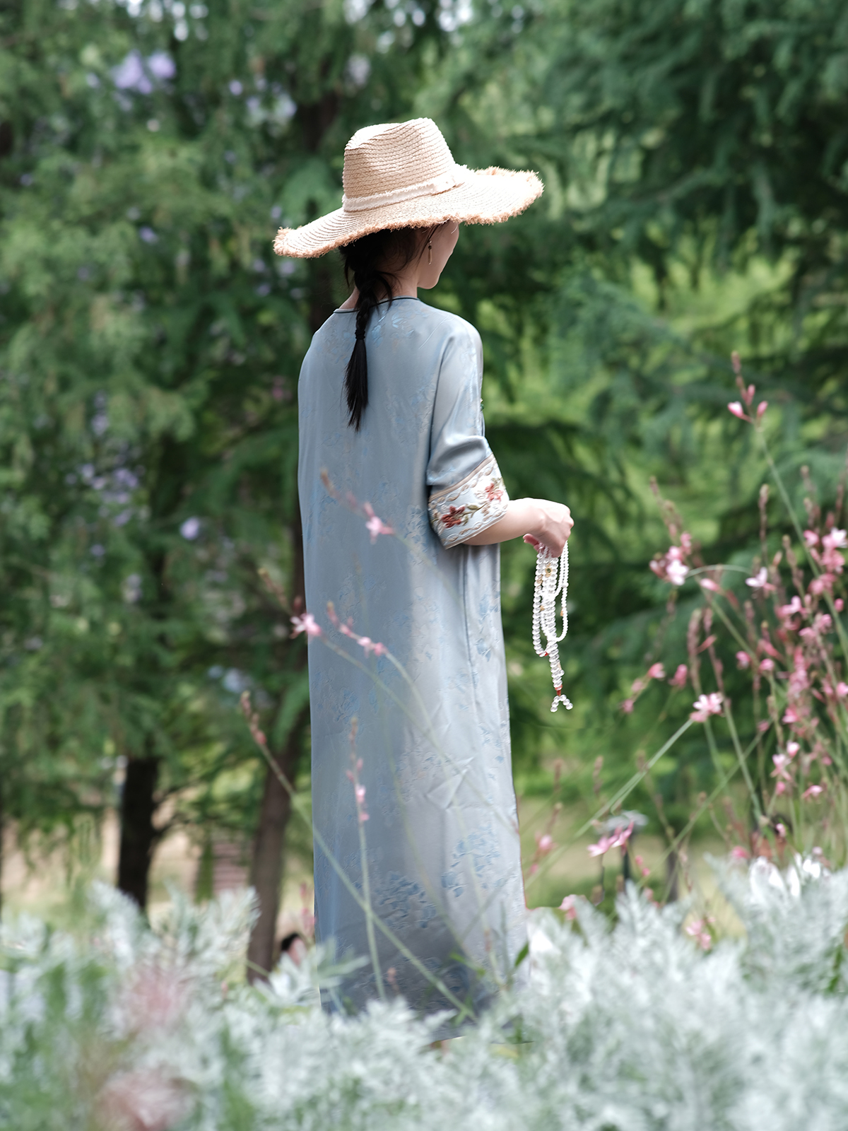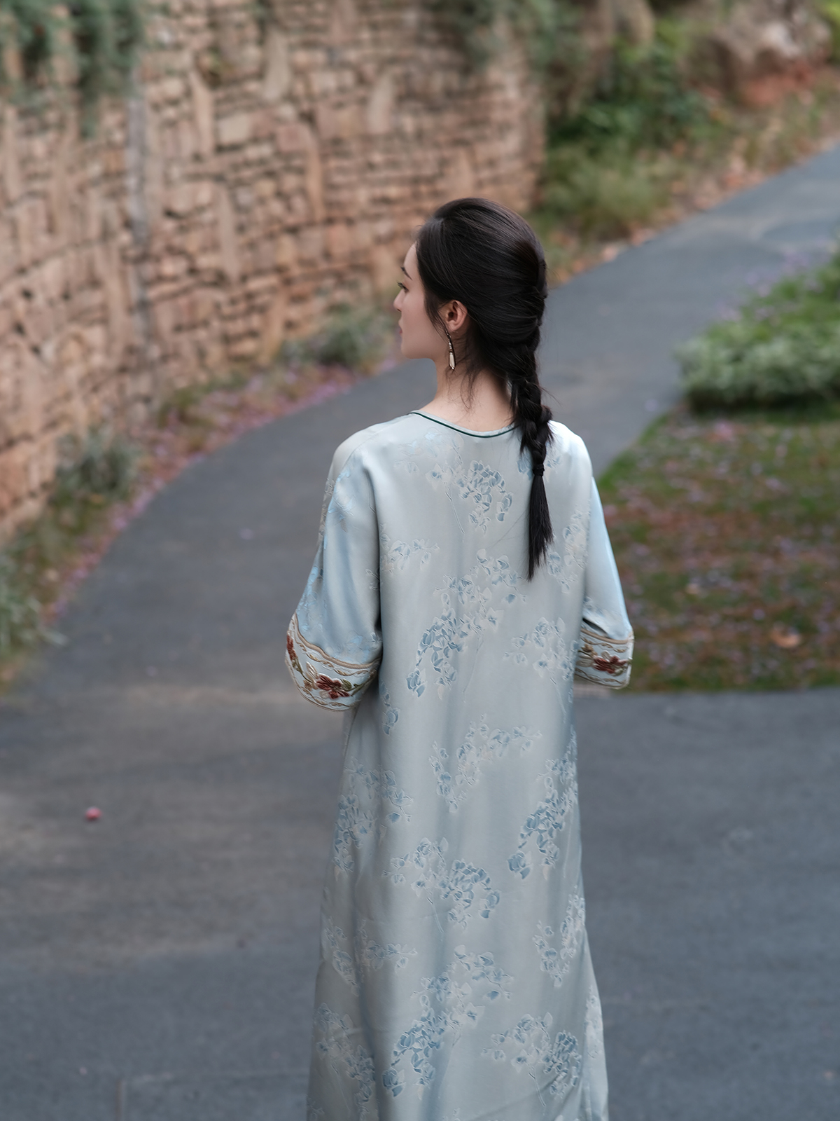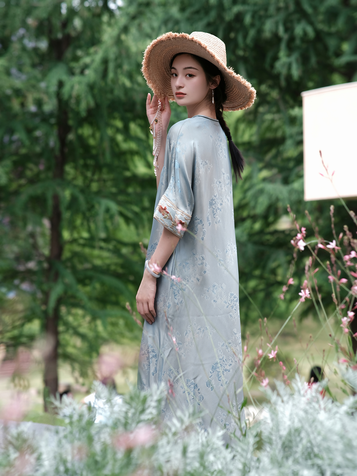 下架|盛唐婧 |提花真丝缎国色天香连衣裙-蓝色
