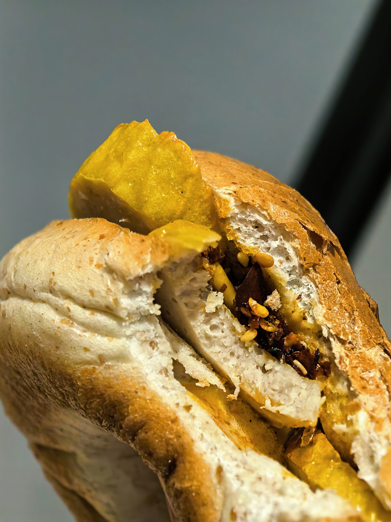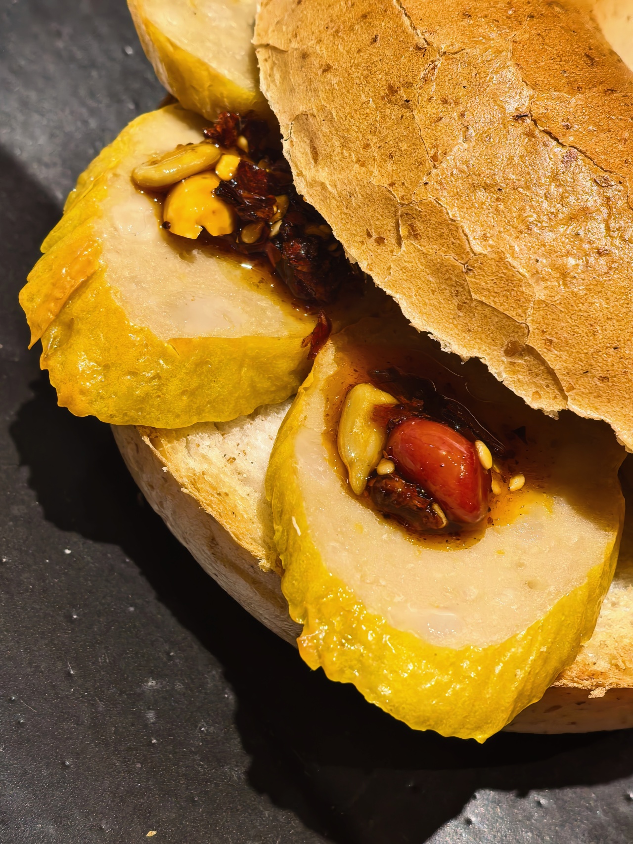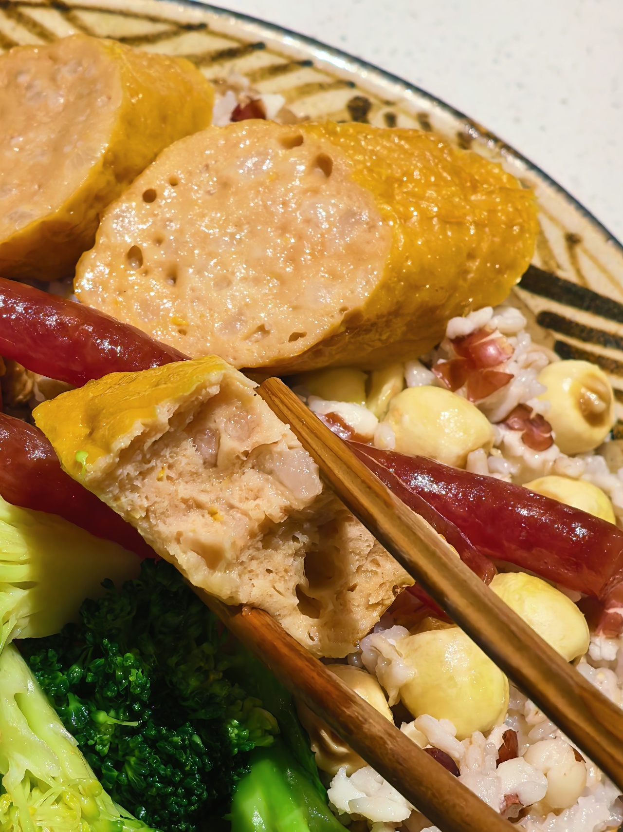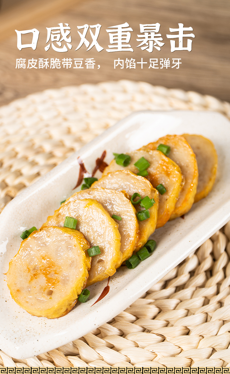 我是切成大块很随意的在电饭煲里和饭一蒸,就相当好吃了,外皮带足豆香,内馅弹牙劲道,和温州鱼饼有一拼!煎一煎更赞,腐皮酥脆,肉汁依然饱满,加一勺松茸油辣子,随便一夹就是个完美的咸口贝果了!