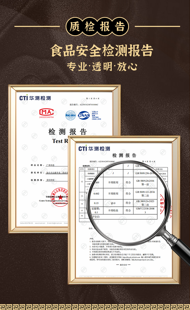 作为非遗传承,李老二广章肉卷的品质始终严苛如一。用料上坚决摒弃复杂添加剂,配料表纯粹干净,仅含猪肉、鸡肉、腐皮及天然香辛料,且通过CTI华测专业检测,无瘦肉精、无重金属残留,从源头筑牢食品安全防线,让食客吃得安心。肥瘦相间、肉质紧实的猪后腿肉,口感细腻的鸡肉,二者融合后既保证了肉香浓郁,又实现了肥而不腻、弹润十足的口感平衡。老师傅们恪守“三捶三摔”的古法工艺,手工反复捶打肉馅,直至搅打成黏韧弹牙的肉胶,再用甄选的清香薄脆腐皮层层包裹,手工慢卷锁住每一缕鲜香。没有粗制滥造的敷衍,每一根广章肉卷都凝聚着老手艺的温度,一口下去双重口感交织碰撞,鲜香余韵绕唇不散。