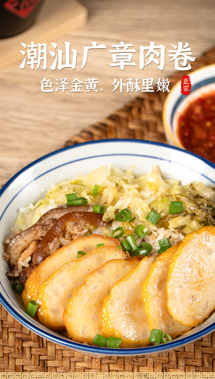 广章肉卷的吃法灵活多变,可以轻松承包三餐四季的烟火美味。下火锅时,投入滚烫汤汁中涮煮片刻,吸足汤汁的广章肉卷便鲜香迸发;切成薄片与青椒、洋葱同炒,爽脆鲜香,妥妥的下饭硬菜;做成广章盖饭,淋上一勺秘制酱汁,每一粒米饭都浸润着肉香与酱香,格外可口;简单油炸后更是外酥里嫩,是追剧解馋的绝佳小食;切条后搭配潮汕卤味同食,地道风味拉满,一口便能尝出潮汕人的日常烟火气。