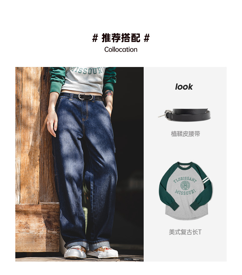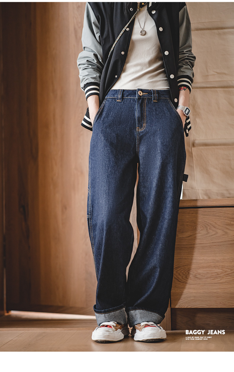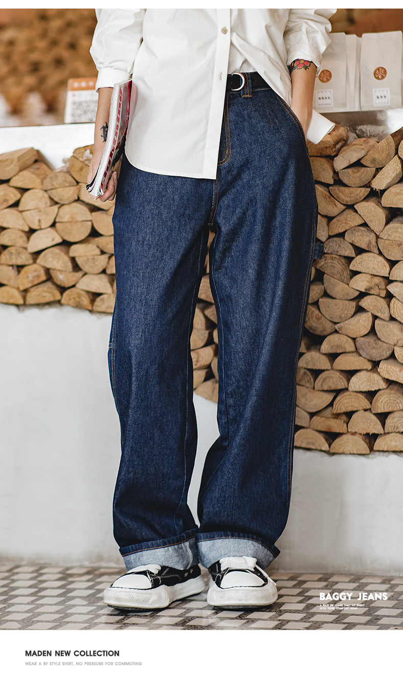 马登女装美式复古拖地阔腿丹宁牛仔裤慵懒宽松显瘦直筒伐木工装裤
