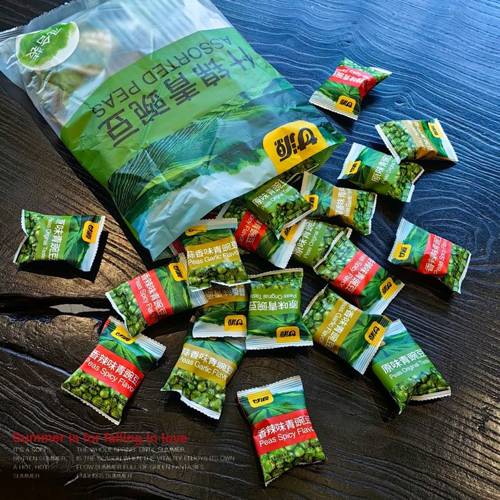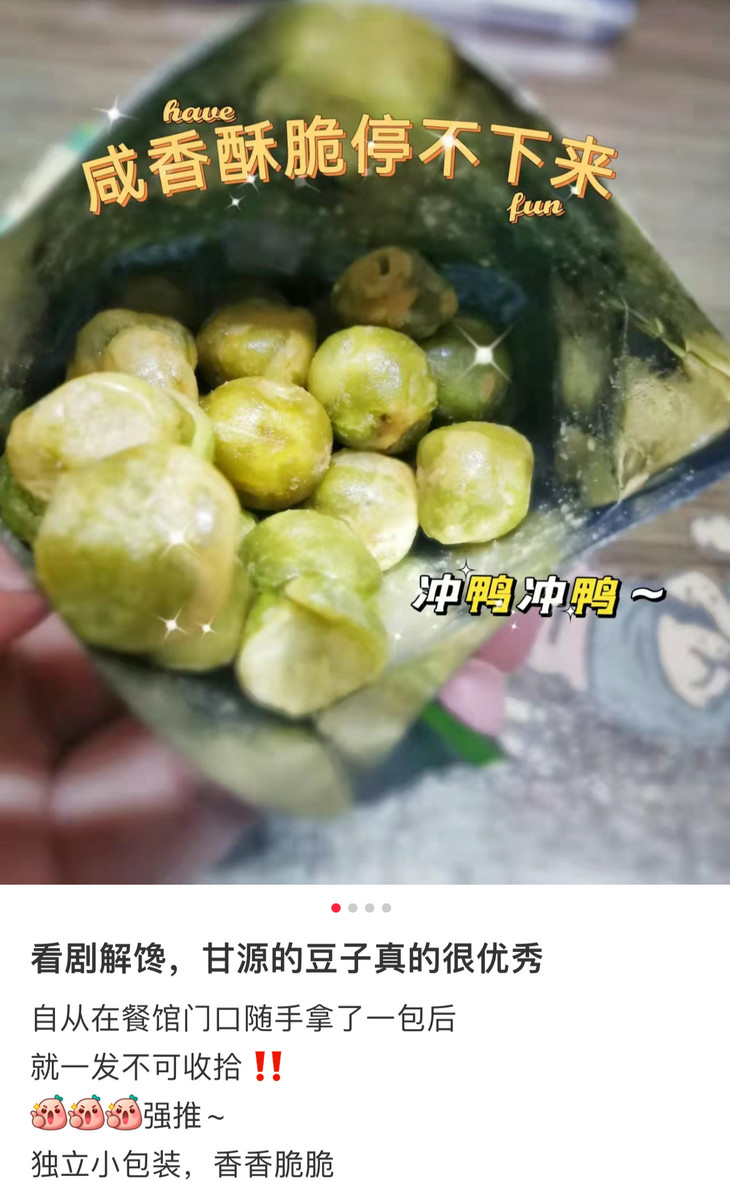青豆有原味、香辣味、蒜香味、蟹黄味、烤肉味和酱汁牛肉味可选。不确定最爱的话,可以直接选择混合口味,都蛮好吃的,颗颗酥脆咸香,抓个2包,享受开盲盒的乐趣!青豆本身富含优质蛋白质、丰富的膳食纤维、多种维生素及矿物质,不过,坚果油脂含量还是蛮高的,建议每日食用量控制在20克以内,可以适当来点,特别推荐饭里撒一袋,香死!
