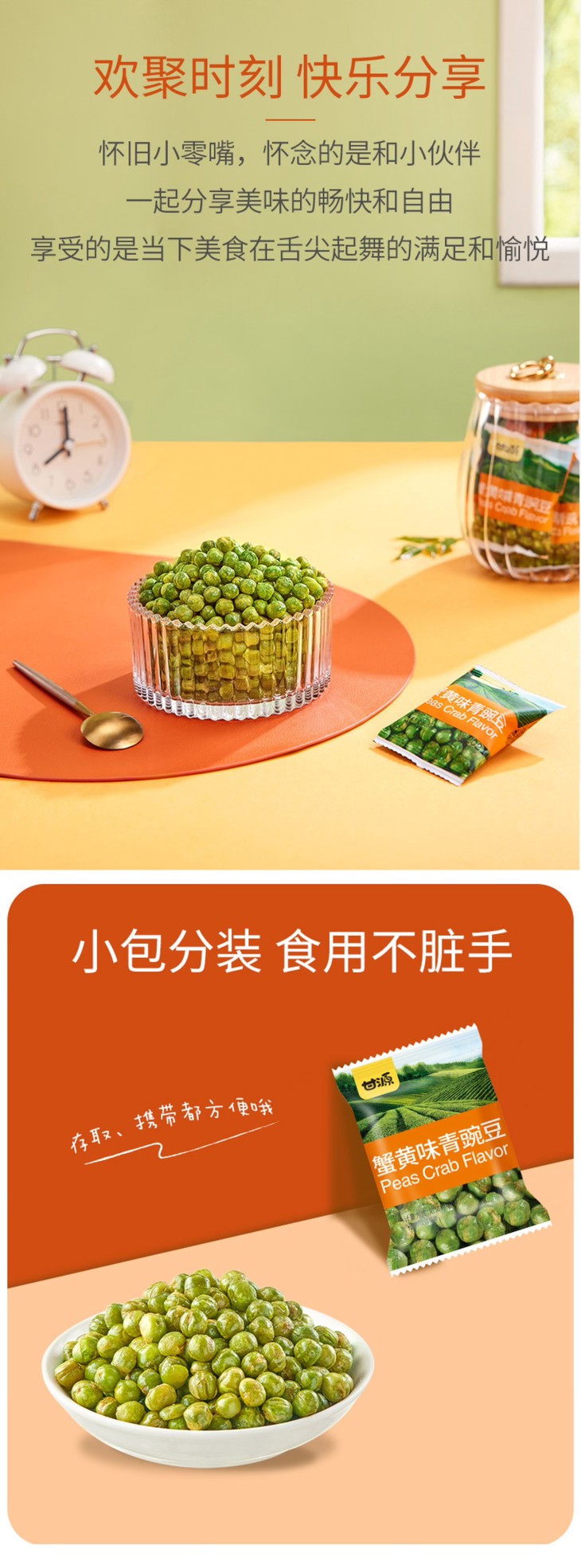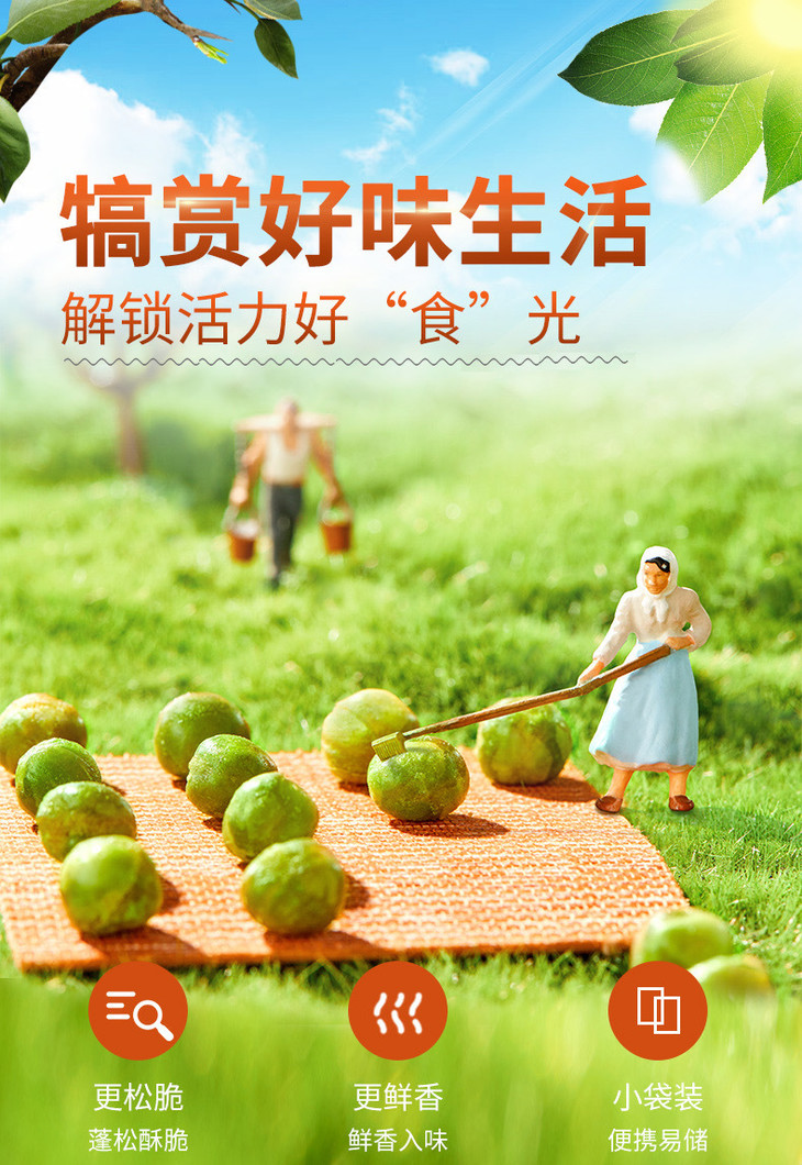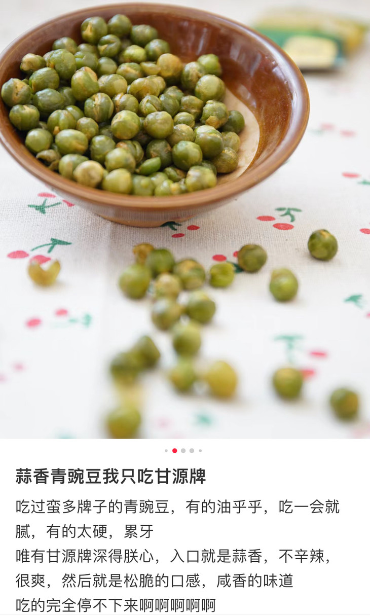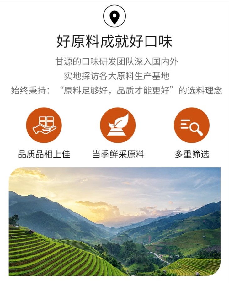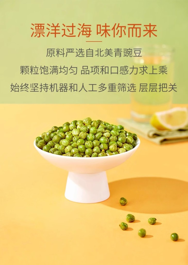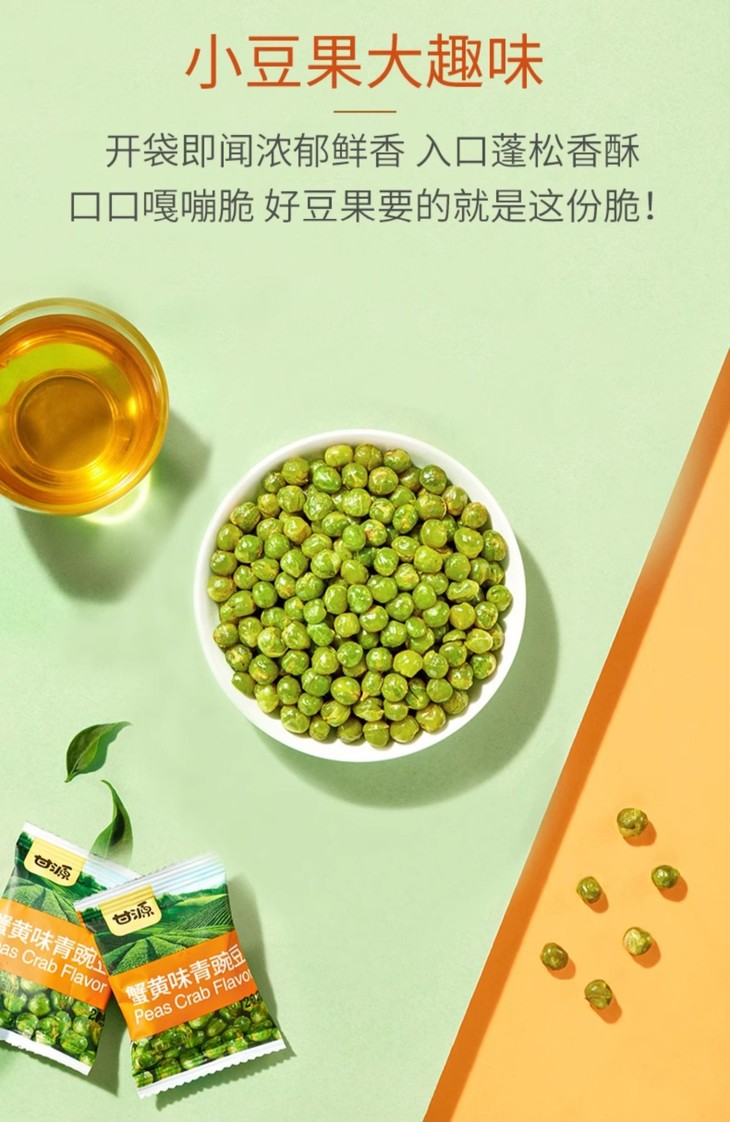 甘源的研发团队,一直秉持着“原料足够好,品质才能更好”的核心理念,深入国内外各大原料生产基地进行实地探访,精心挑选北美当季新鲜采摘的青豆,再经过机器与人工相结合的方式,进行多重筛选与层层把关,确保了每一粒青豆都口感上乘、品质卓越。同时,品牌采用创新加工工艺,使甘源青豌豆展现出令人难以抗拒的酥脆口感与鲜美滋味!