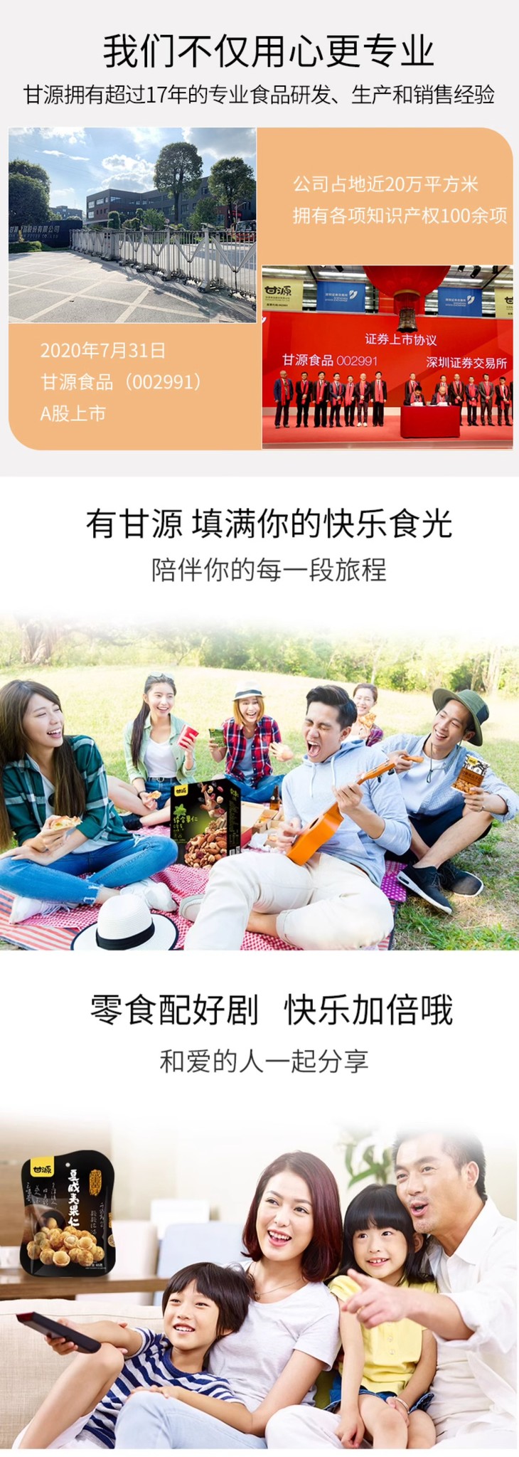 甘源食品股份有限公司成立于2006年,是一家集研发、生产、销售为一体的现代化休闲食品企业。公司始终坚持从优质原产地直接采购无污染的北美青豆、云南蚕豆、内蒙古向日葵等原料,在经过严苛的筛选和制造工艺后,获得饱满、香酥的口感和卓越、稳定的质量,并赢得大量忠实顾客群体的青睐。持续提升的产品质量与顾客满意度,奠定了“甘源”品牌的成功与持续发展的坚实基础。经过多年培育发展,“甘源”已成为国内领先的豆类休闲食品品牌。