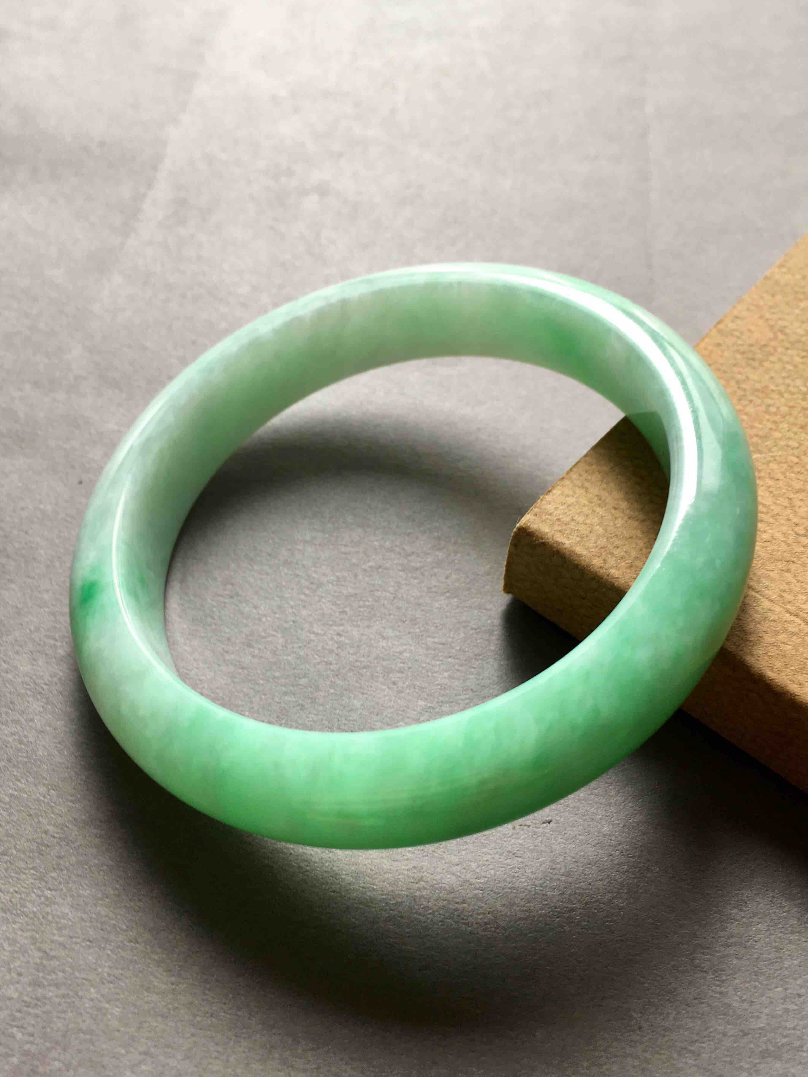 人见人爱的绿色,大圈口,糯种阳绿翡翠手镯,甜美的绿色就像窗外的景色一样,洁白的底色清新爽气,内径59,宽12.4,厚8.6mm,适合手寸58到60的朋友佩戴