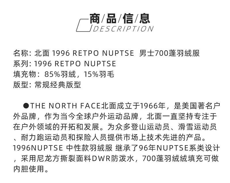 瑕疵THE NORTH FACE/北面 1996NUPTSE男士复古700蓬保暖防风羽绒服