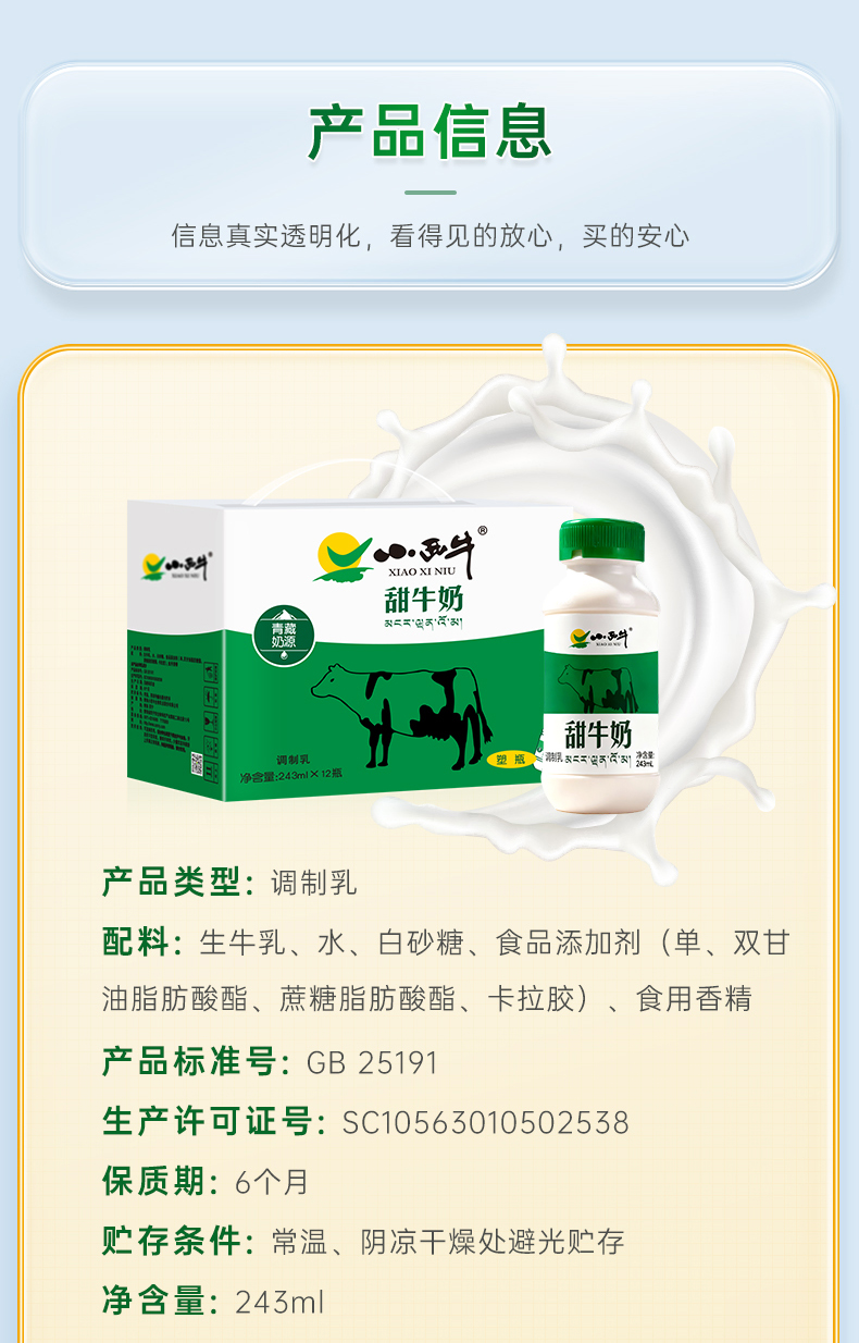 【光明&小西牛】青海甜牛奶 高原甜牛奶儿童学生成人甜牛奶243mlx12瓶/箱