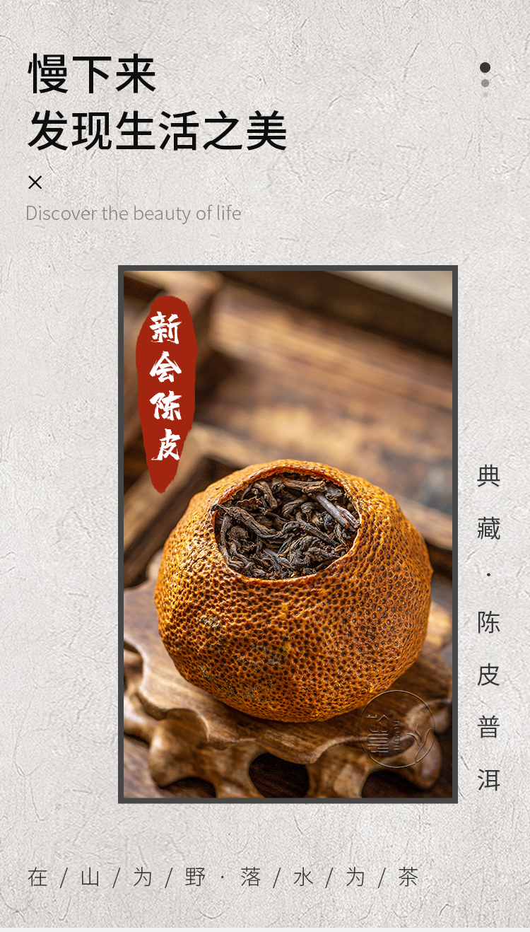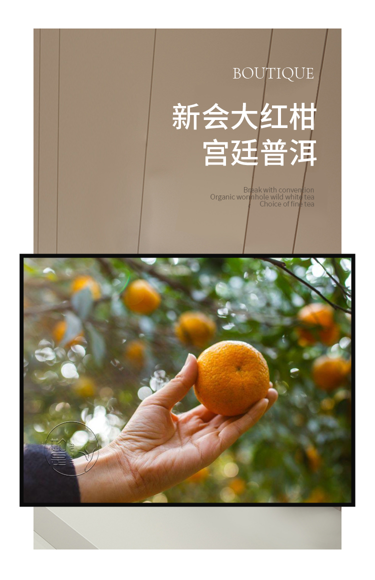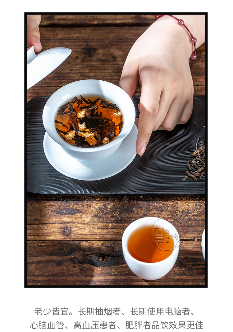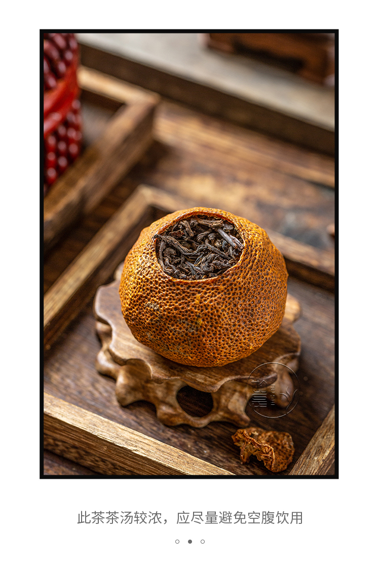 新会大红柑搭配宫廷普洱,经过3年陈放。理气暖胃,生津止渴,非常适合日常饮用。尤其是外出出差或者饱食大餐后饮用,身心皆舒泰。