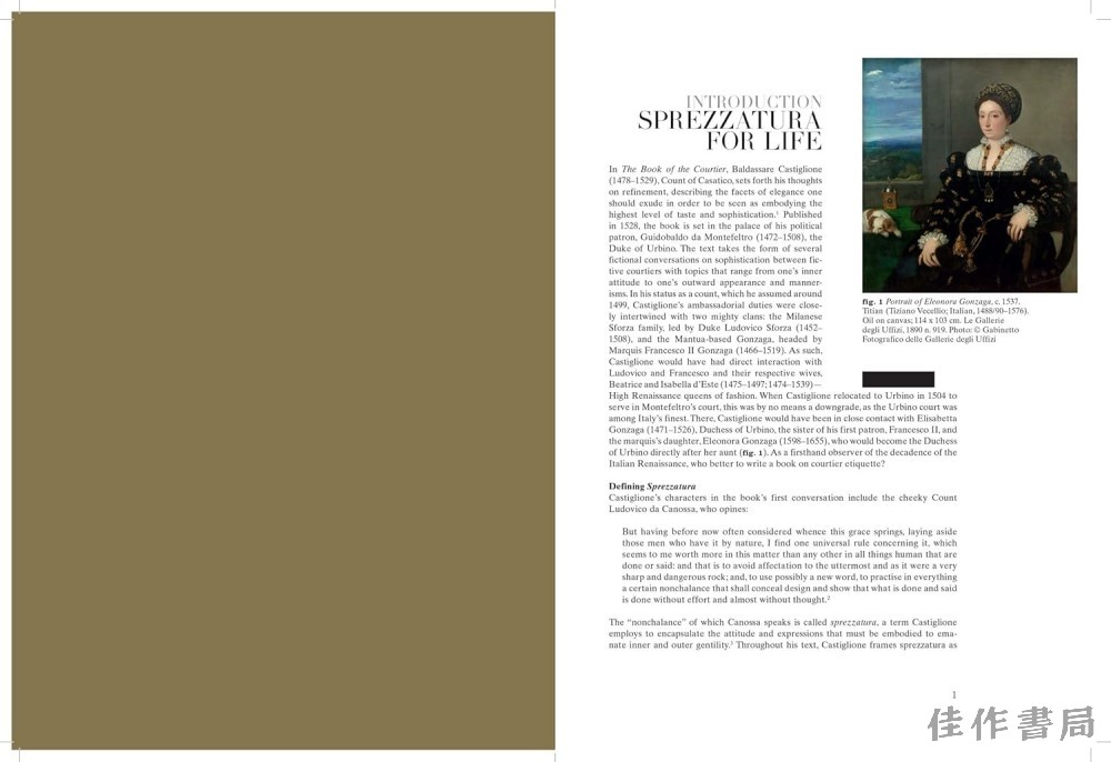 文艺复兴时期,意大利半岛由强大的贵族家族(或称“世家”)所主导,比如佛罗伦萨的美第奇家族和米兰的斯福尔扎家族,这些家族的成员借助时尚和艺术来彰显自身的权力。通过学者和时尚界专业人士(包括米索尼品牌的卢卡·米索尼以及菲拉格慕博物馆馆长斯特凡尼亚·里奇)的文章,本书深入剖析了意大利文艺复兴时期的“世家”与当代意大利时装品牌之间的创意联系,以及那些彰显意大利文艺复兴意象重要遗产的设计创新。本书由《意大利 Vogue》前创意总监卢卡·斯托皮尼担任艺术指导,采用了极具创意的超大尺寸设计,让人联想到《Vogue》杂志颇具传奇色彩的年度“九月刊”,讲述了一个关于当代意大利时尚的引人入胜的故事,并配以时装秀和艺术作品图片,以及受怀旧风格的 glossy 杂志编辑内容启发而拍摄的原创照片。