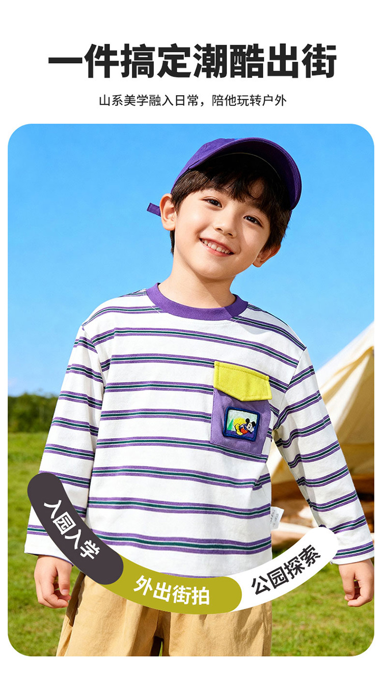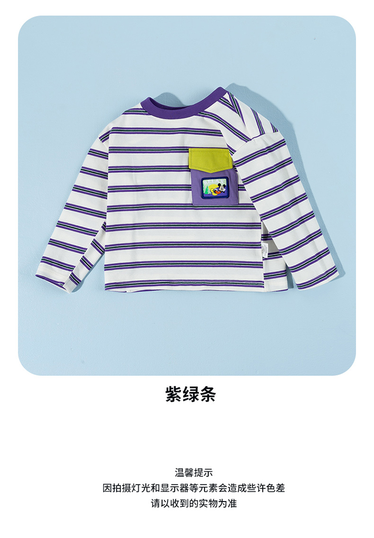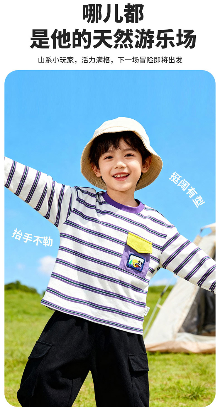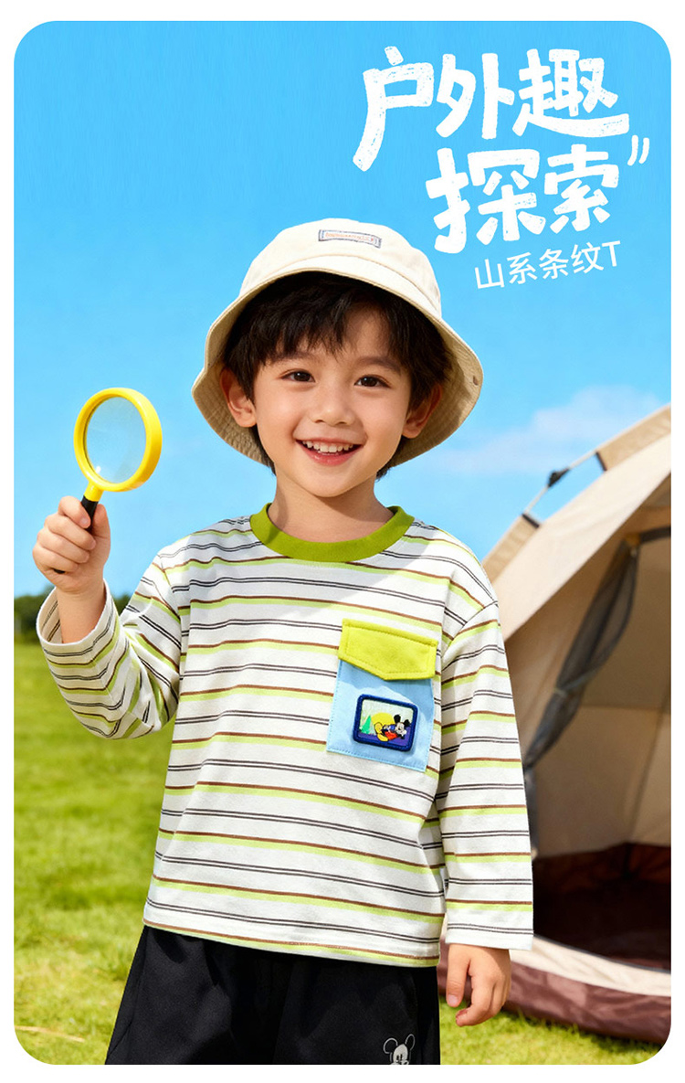 迪士尼(Disney)童装男童长袖T恤休闲运动纯棉山系条纹撞色风格2026春季新款上衣ZD1FS002
