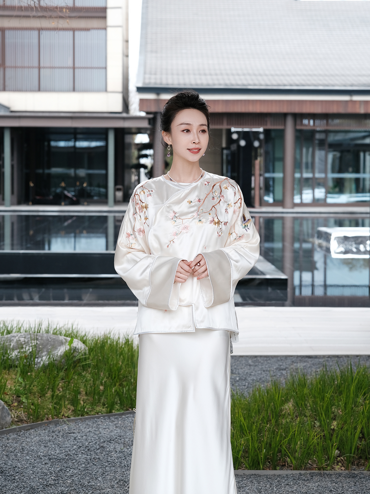 盛唐婧 |圆领团花丝麻提花宽袖上衣-白色