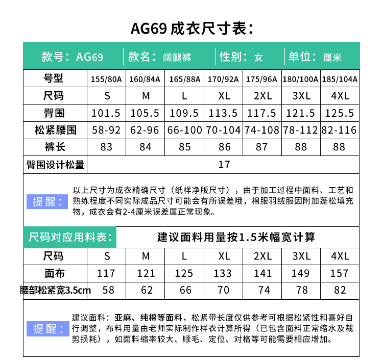 裁缝学苑AG69 阔腿裤纸样新款 裤子样板裁剪纸样图版型纸样 女士