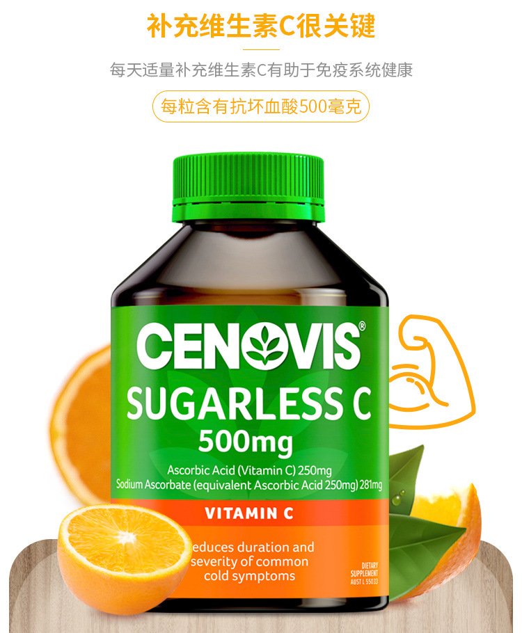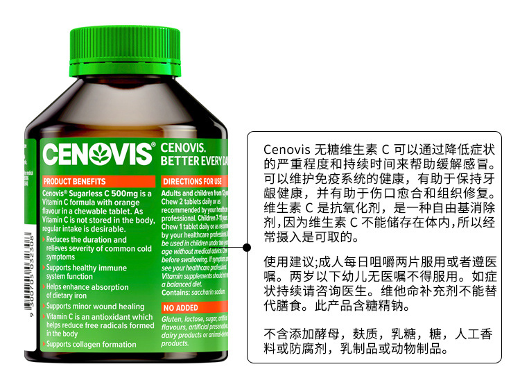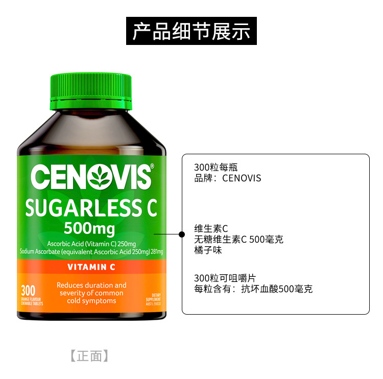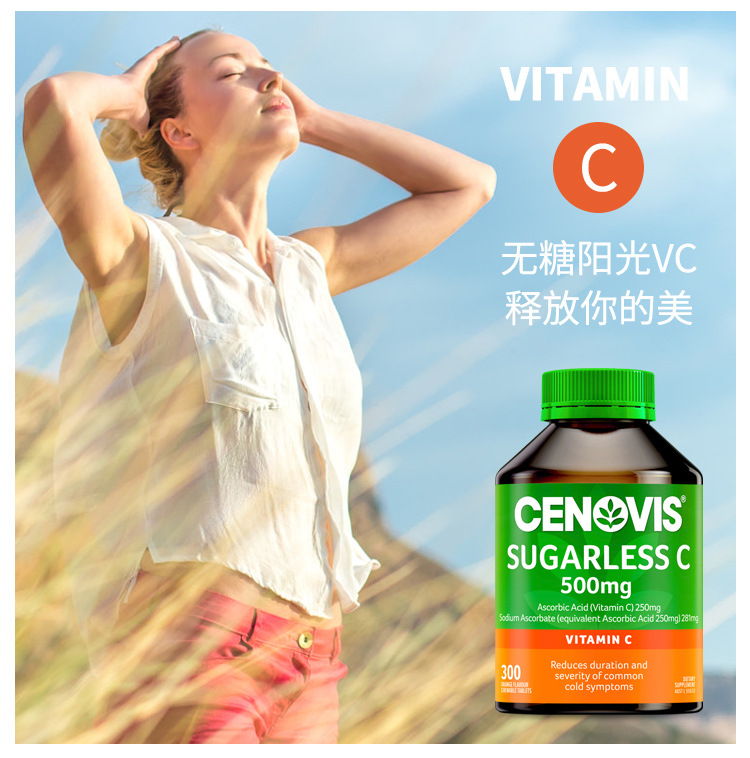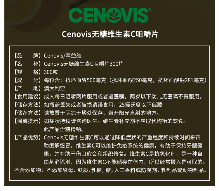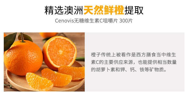 【香港直邮】澳洲进口cenovis圣诺无糖维生素C咀嚼片500mg*300粒