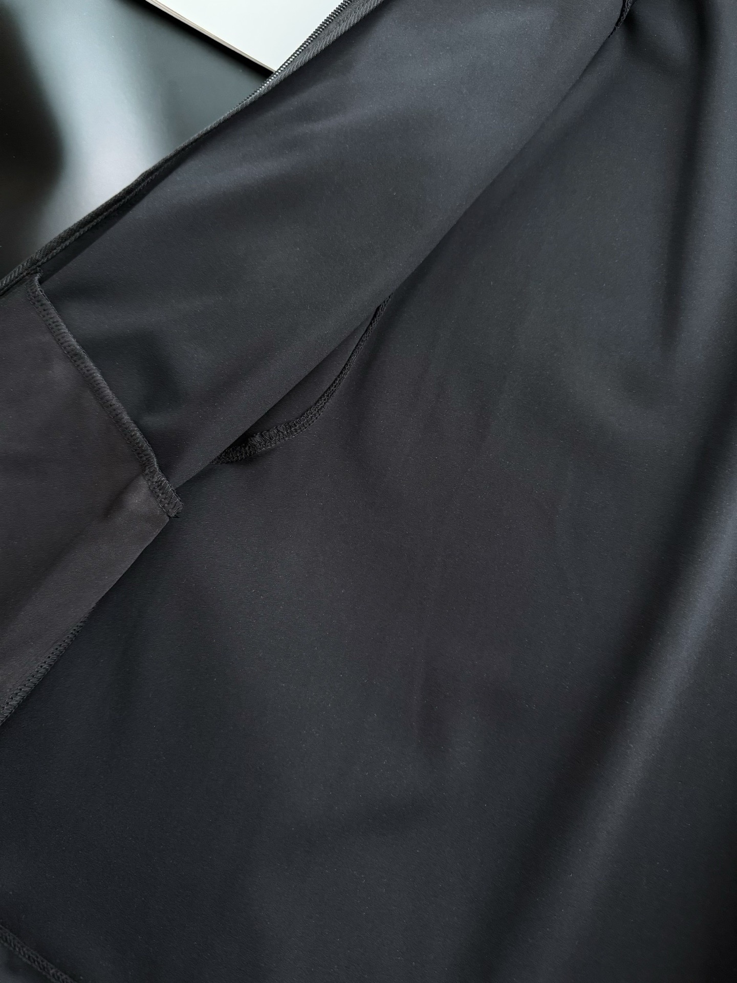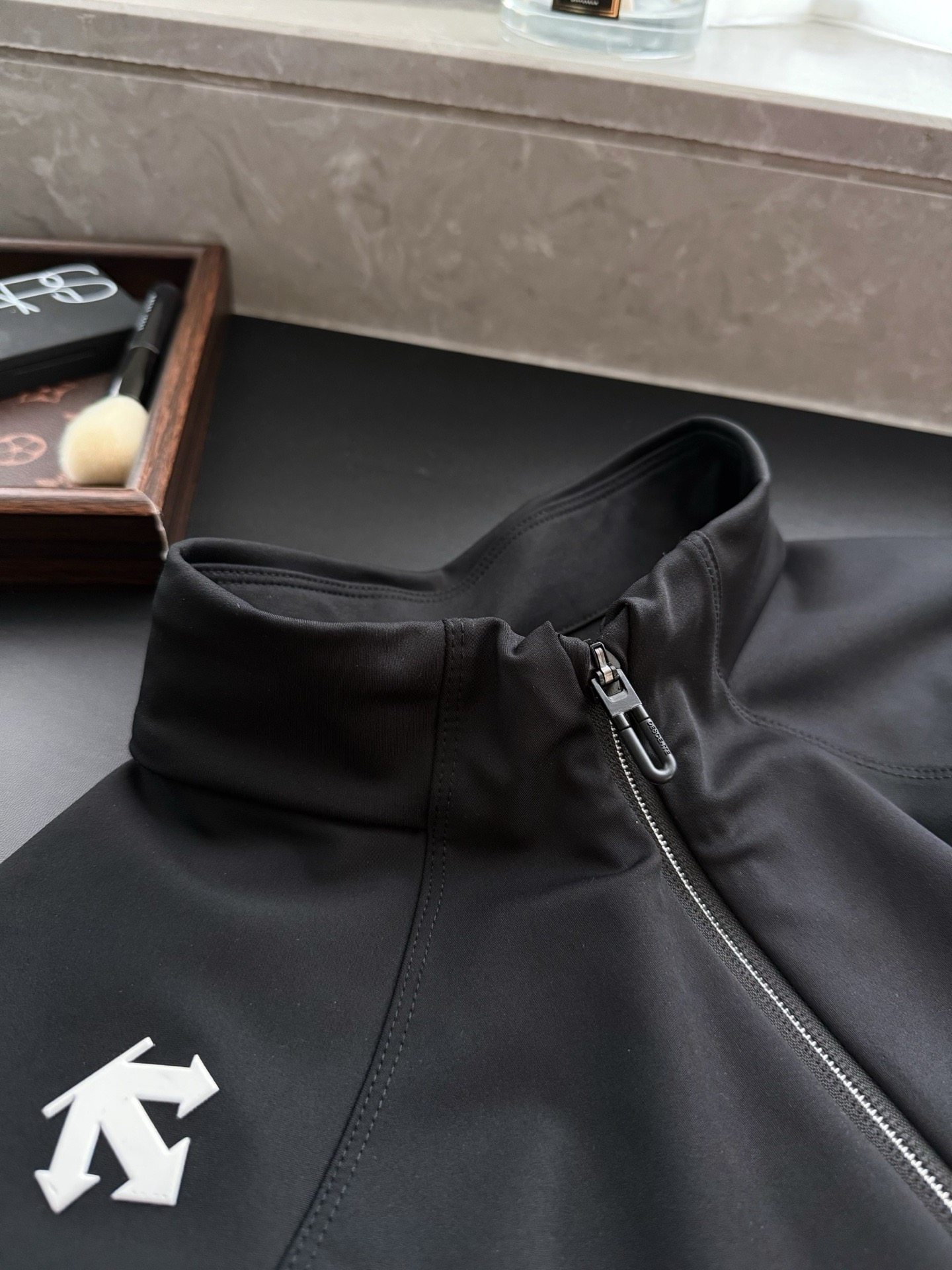 表面特殊密实且呈纹理效果,单层同样比较挺括压风,不容易起皱同时还有略有的延展力,四面弹力!自带筋骨挺括立整但绝对不生硬,悬垂有型不软塌,线条流畅度高~体感很舒服,很适合春季多风的天气!宽松立领的直身版型~
