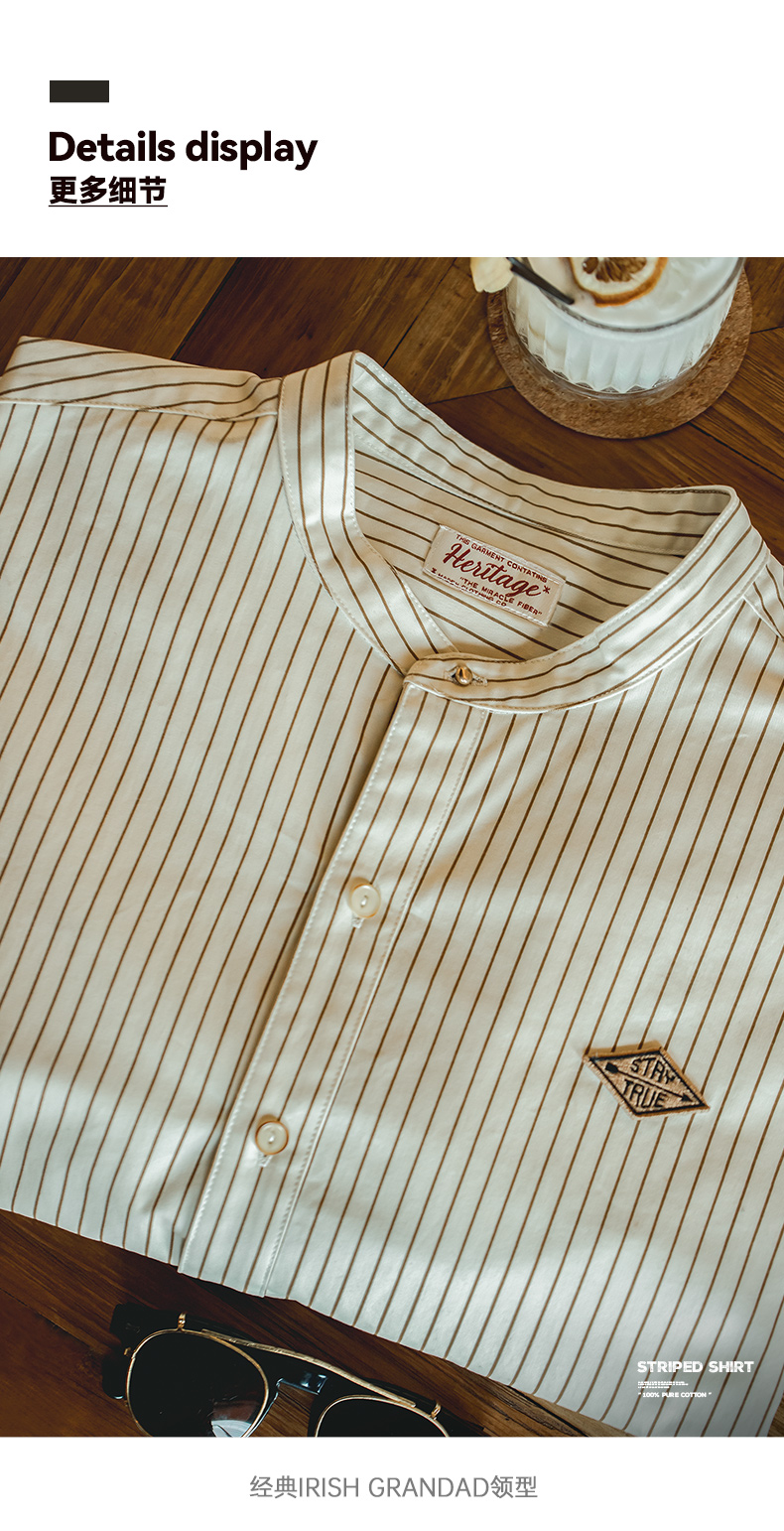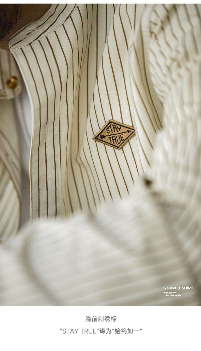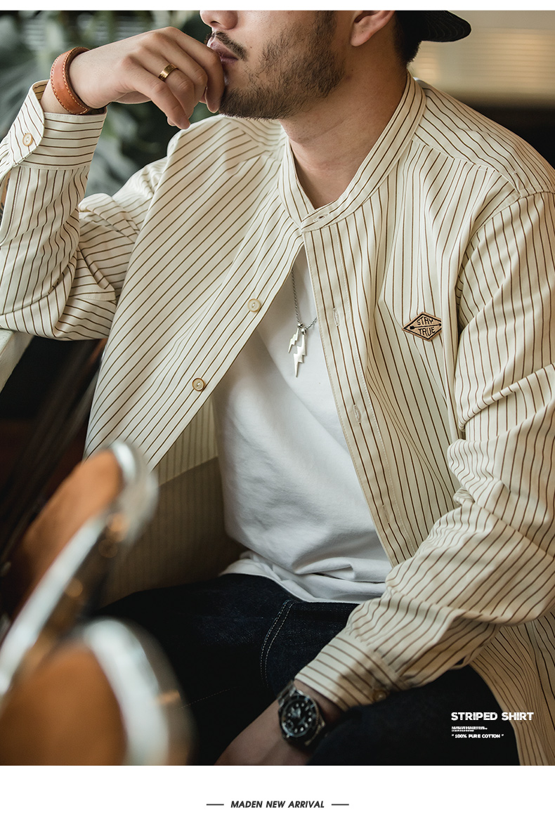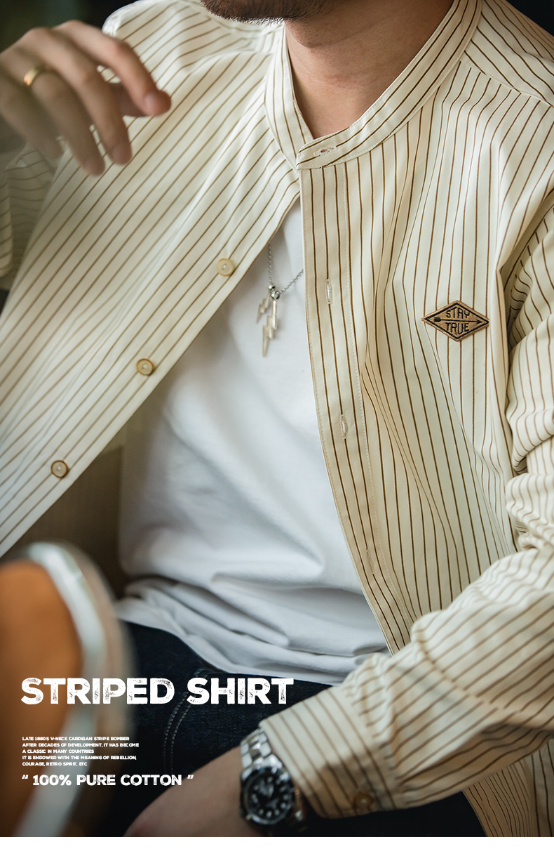 工装优选美式复古竖细条纹立领长袖衬衫日系休闲棒球衬衣外套男春
