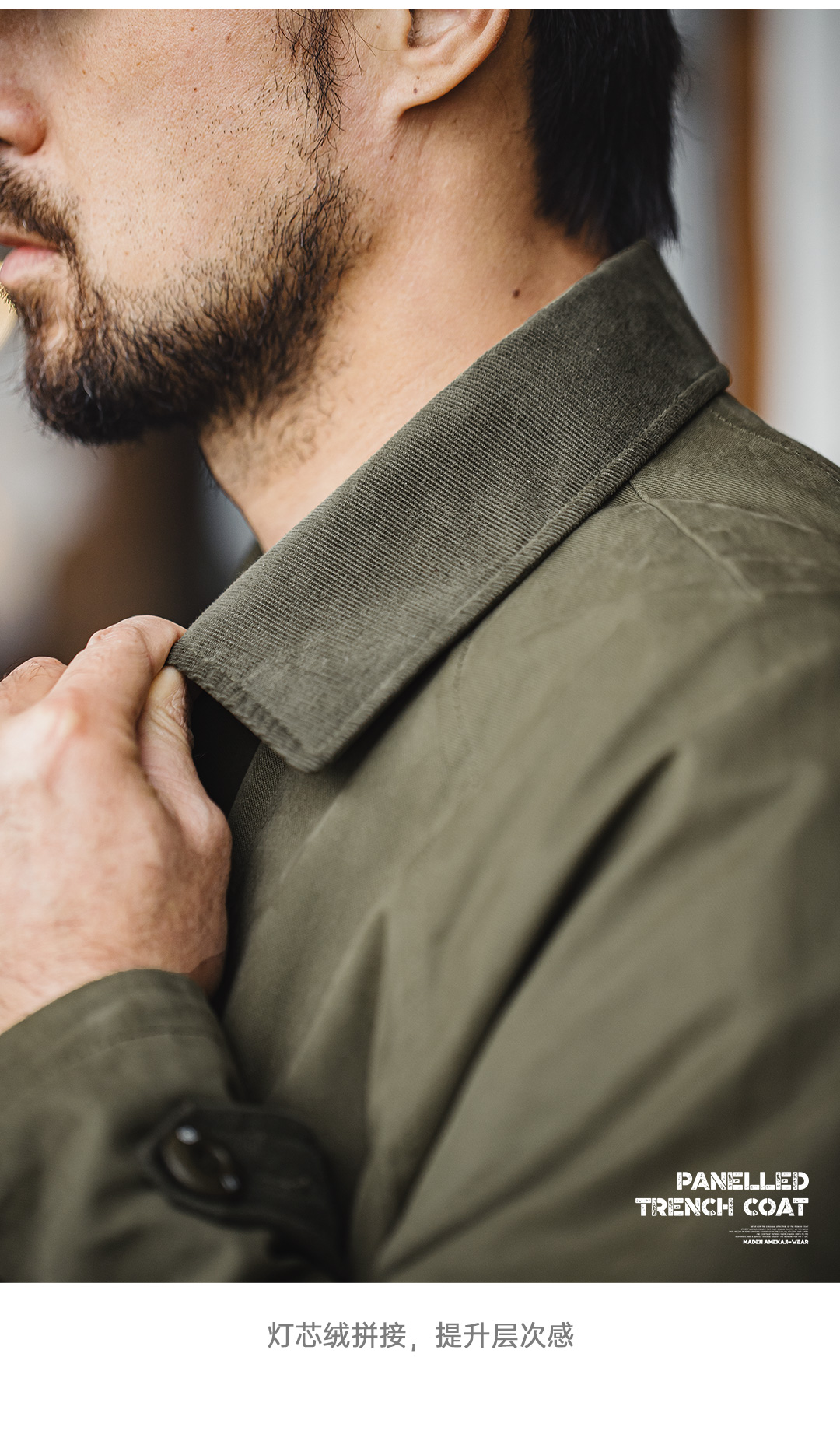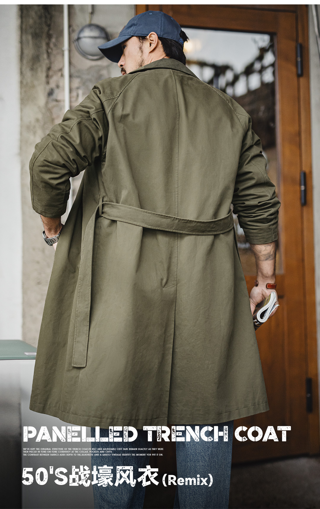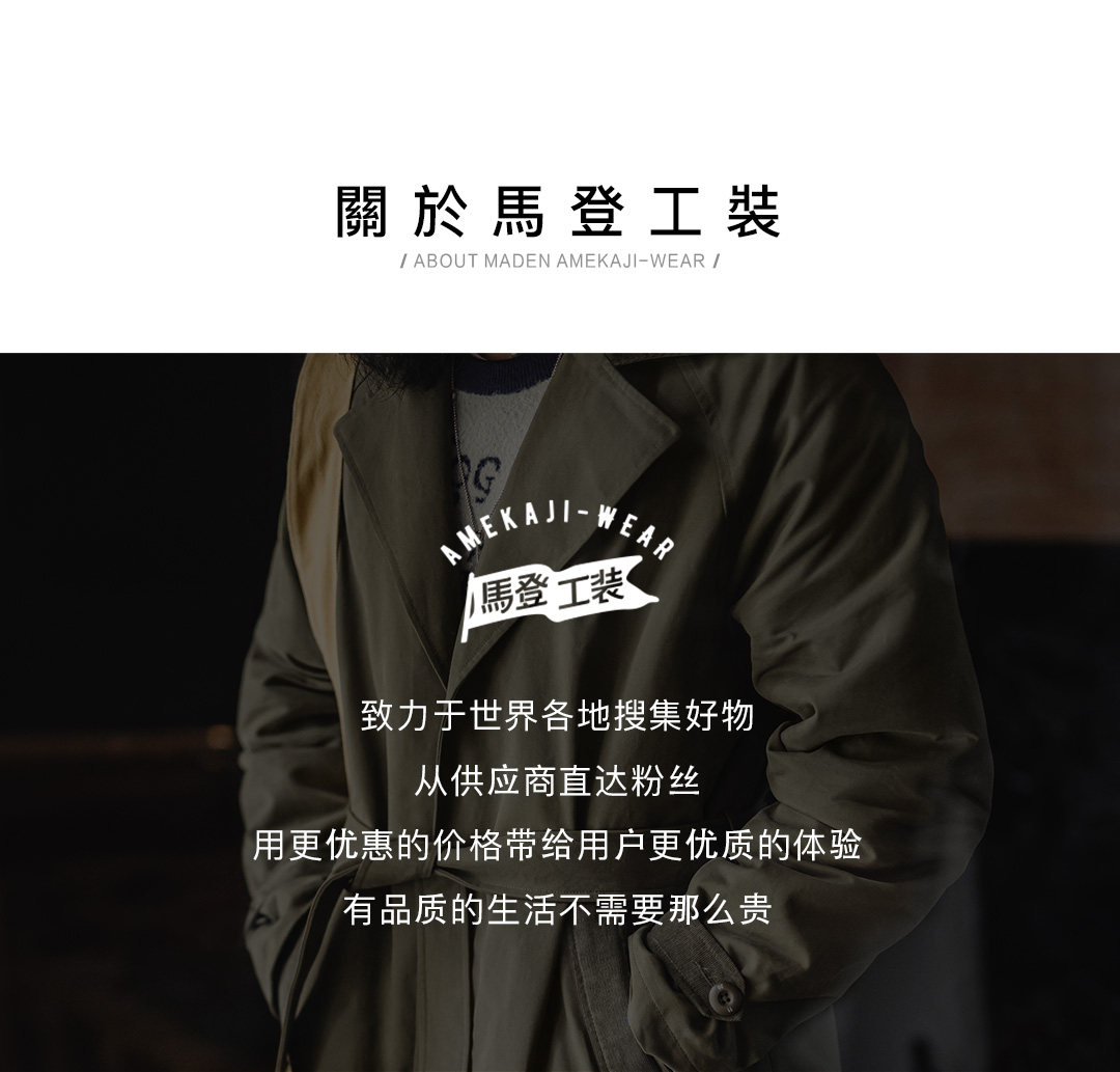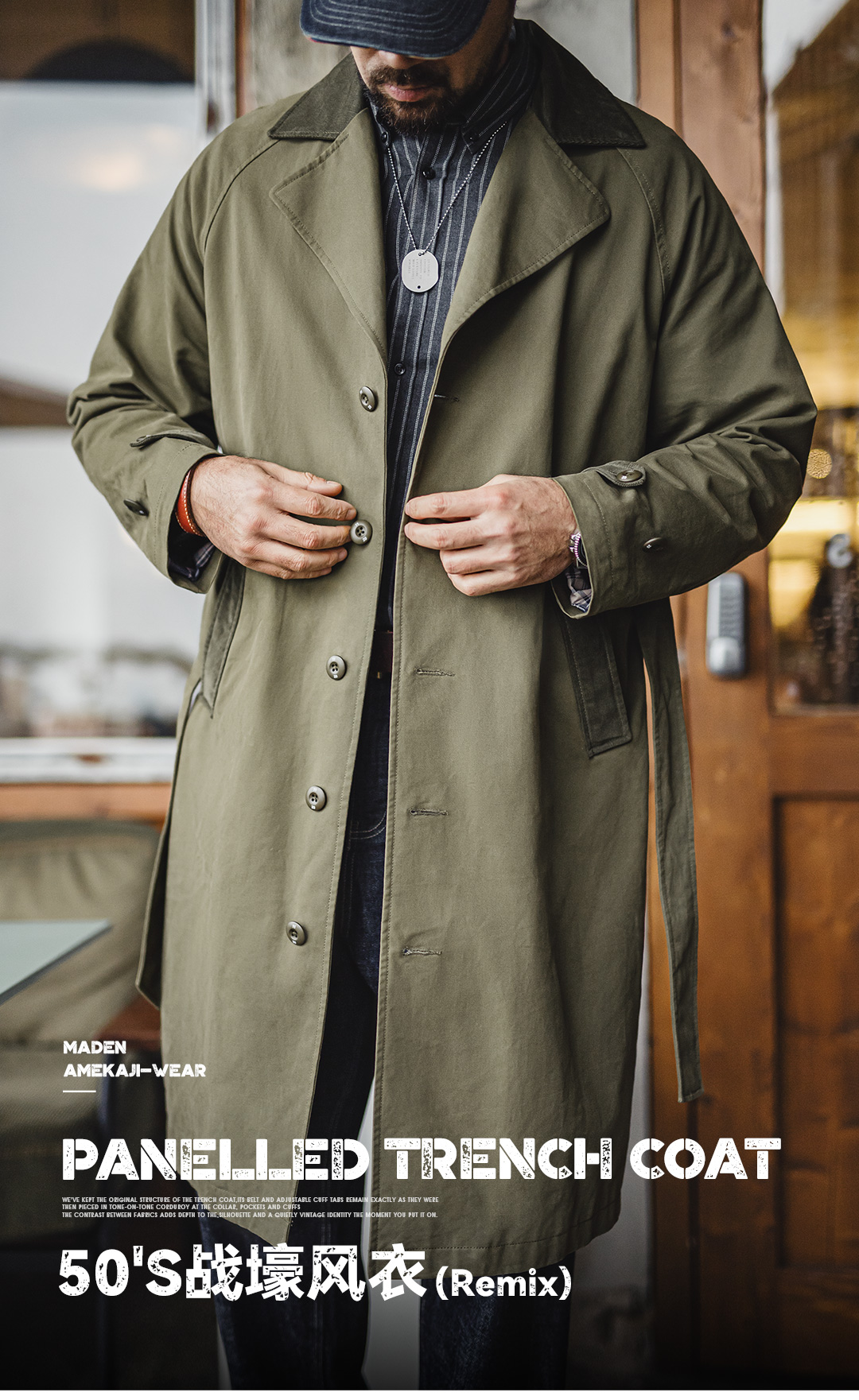 马登工装美式复古战壕风衣军绿色中长款翻领纯棉大衣外套男款春